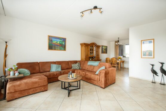 Richting de woonkamer passeren we het toilet. Deze is in dezelfde kleurstelling als de badkamer en uitgerust met een hangcloset en een fonteintje. De woonkamer is lekker ruim en licht. Er is een grote schuifpui naar het terras. Op het grote terras zit je heerlijk beschut en geniet je van volop privacy. Het uitzicht is werkelijk fantastisch, ook vanuit de zithoek in de woonkamer.
