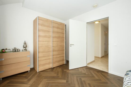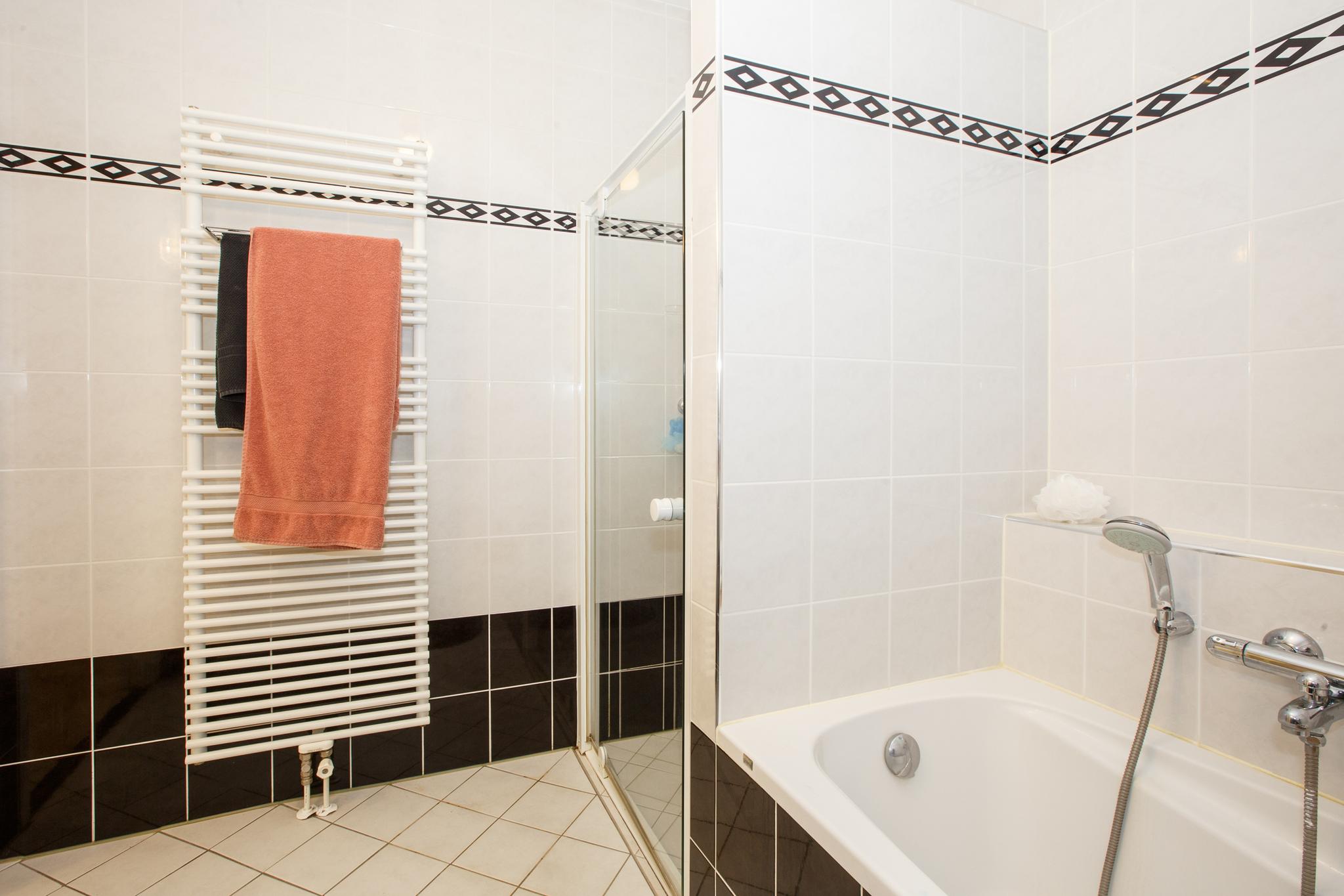Volgende ruimte is de badkamer. Deze ruimte is compleet met een ligbad, een douche, toilet, een wastafel en een designradiator. De grootste slaapkamer is aan de voorzijde van het appartement. Deze ruimte is lekker licht door de 2 raampartijen en de witte wanden met spachtelputz. Door het gebalanceerd ventilatiesysteem is apart ventileren niet nodig, maar voor wie graag met de ramen open slaapt, zijn de ramen hier voorzien van een kantelkiep-systeem.
