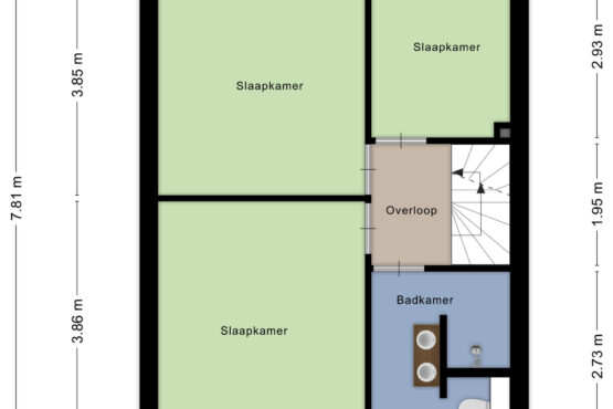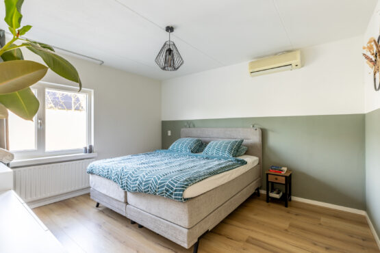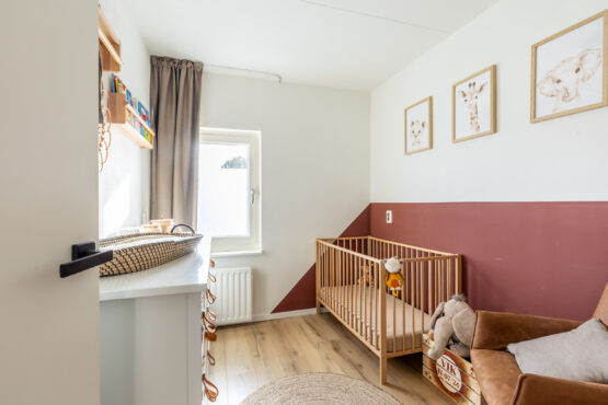 We lopen terug naar de hal om boven te gaan kijken. De trap is bekleed met dezelfde PVC als de vloer op de begane grond; dit zorgt voor mooie eenheid. Boven op de overloop aangekomen zien we een hout-look laminaatvloer, die m.u.v. de badkamer op de gehele 1e verdieping is gelegd. Aan onze rechterhand bevindt zich de kleinste slaapkamer, die nu in gebruik is als kinderkamer, maar volgens ons ook een prima werkplek zou kunnen zijn. Slaapkamer 2 ligt ook aan de achterzijde en is groter van formaat. Aan de voorkant van het huis is de master bedroom, die voorzien is van airconditioning. Alle raamkozijnen op de 1e verdieping zijn vervangen door kunststof kozijnen met HR++ glas.