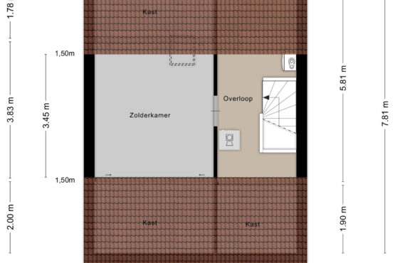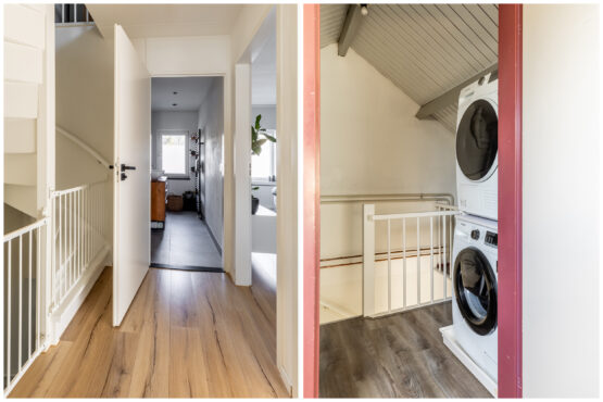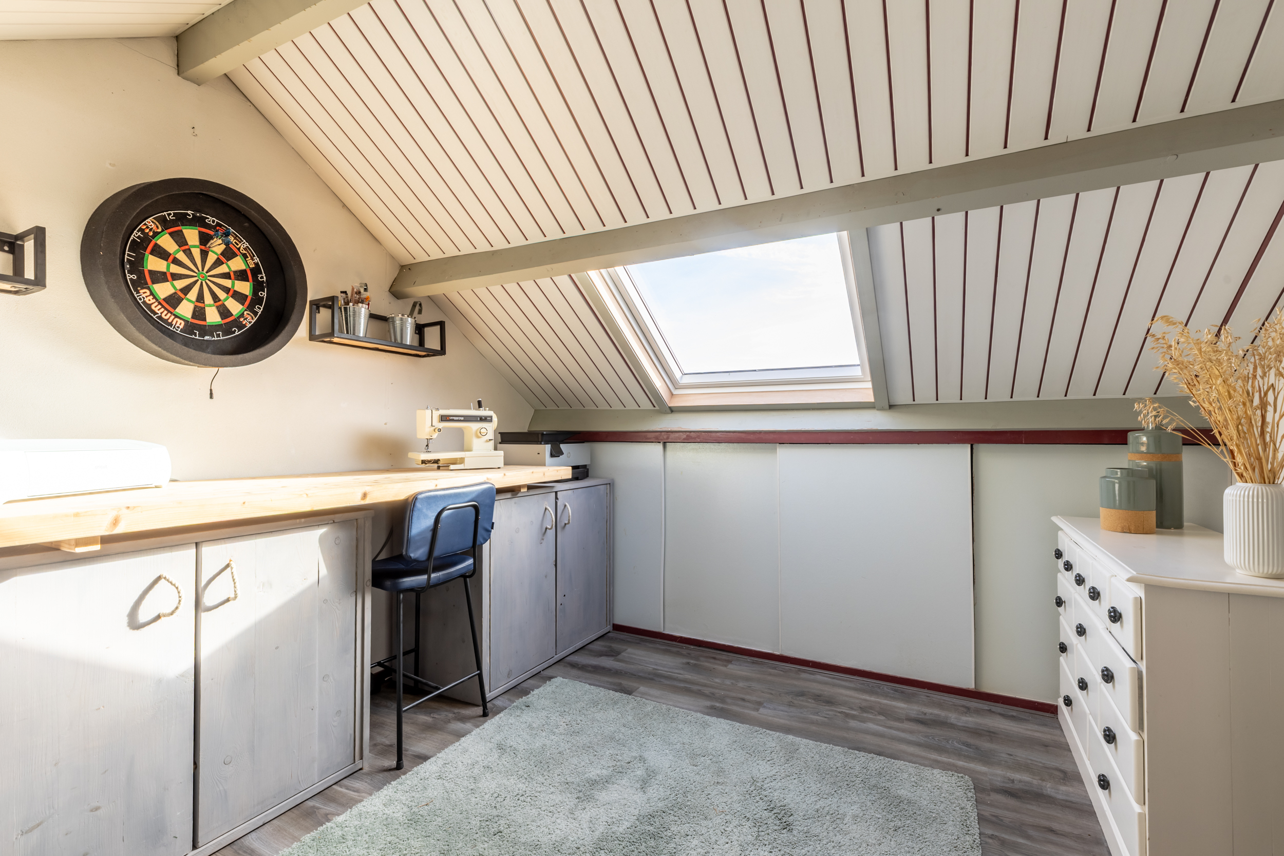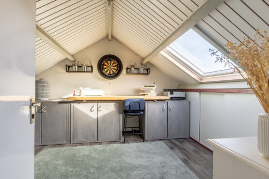Een vaste trap leidt ons naar de 2e verdieping. We komen aan op de voorzolder, waar zich de HR-combiketel bevindt, evenals de aansluitingen voor de wasapparatuur. is. Ook zijn hangt hier de omvormer voor de 8 zonnepanelen. Het tweede gedeelte van de zolder is gereserveerd voor de 4e slaapkamer. Een groot Velux dakraam zorgt voor lekker veel lichtinval. Er is veel opbergruimte gecreëerd achter de knieschotten.