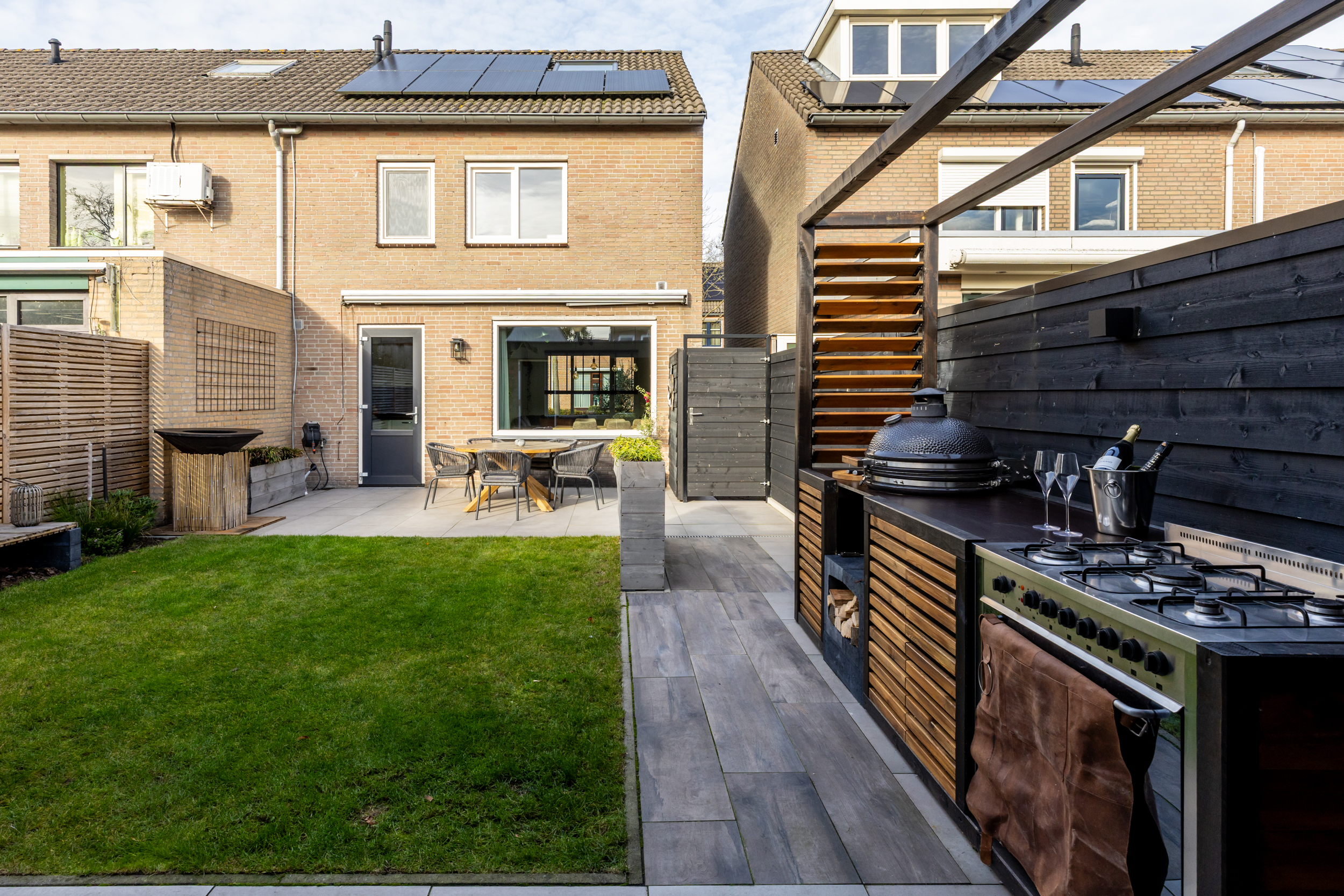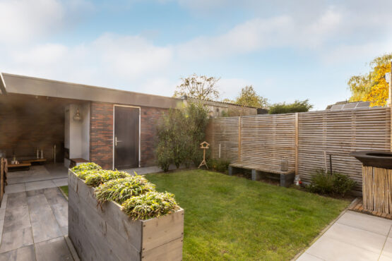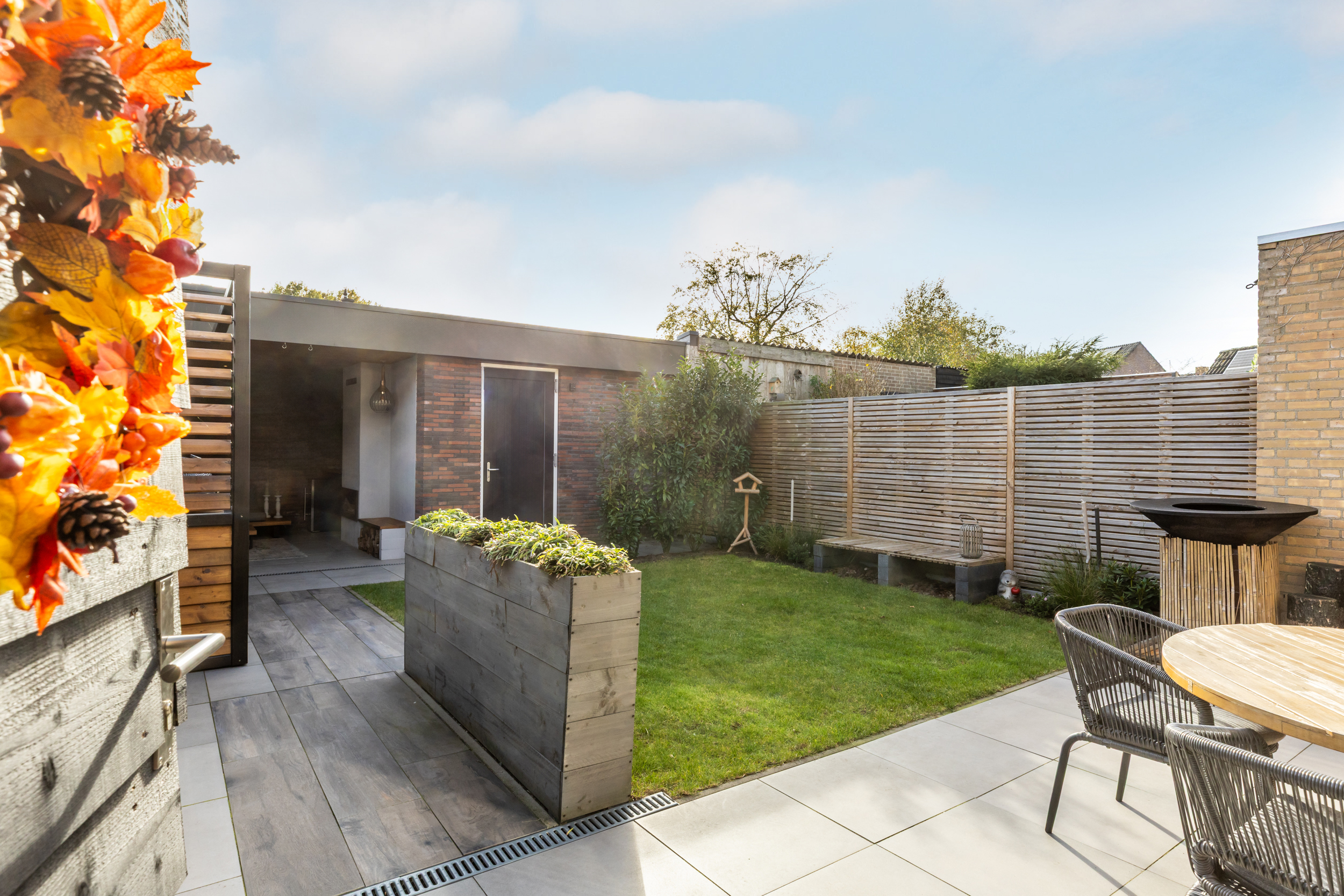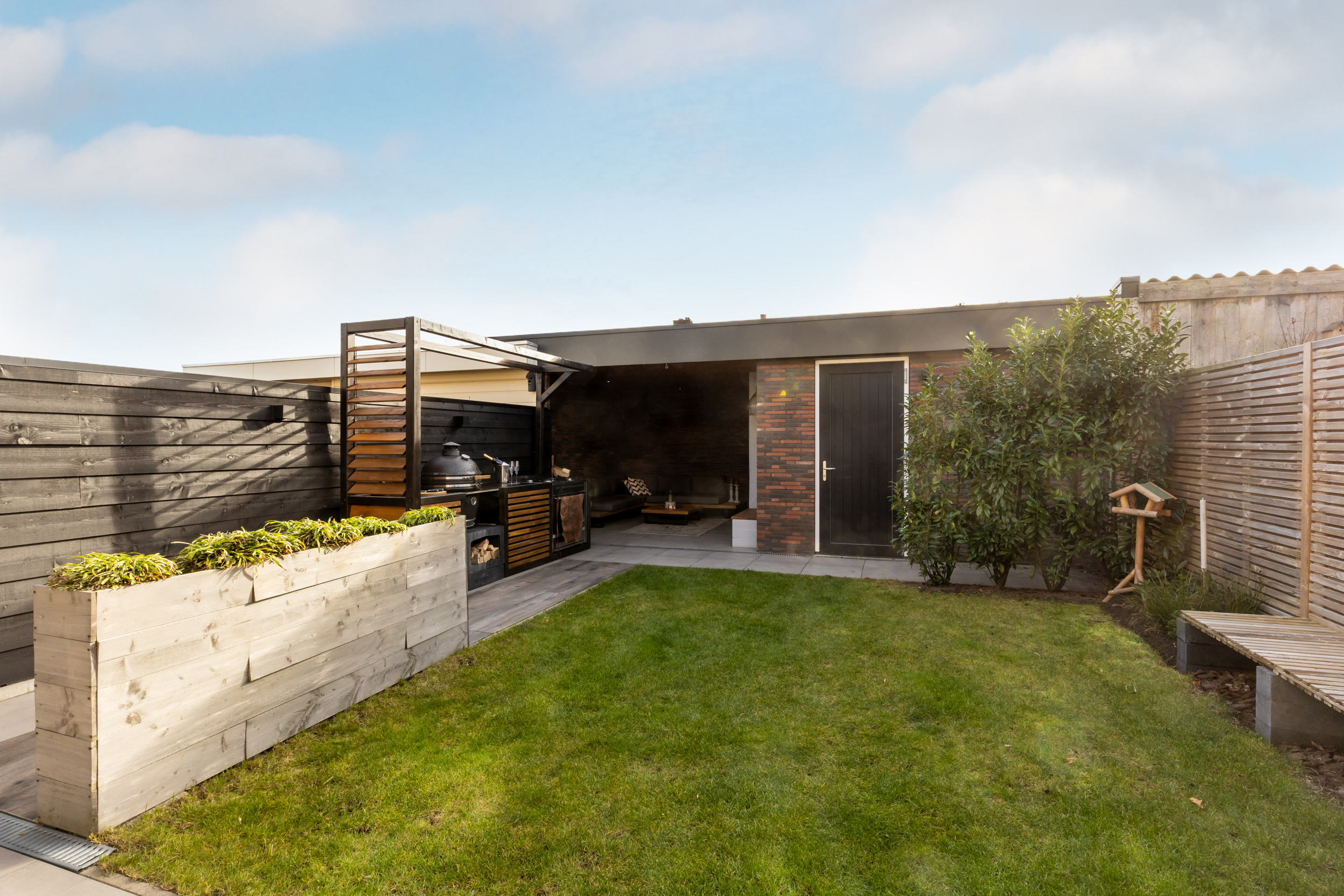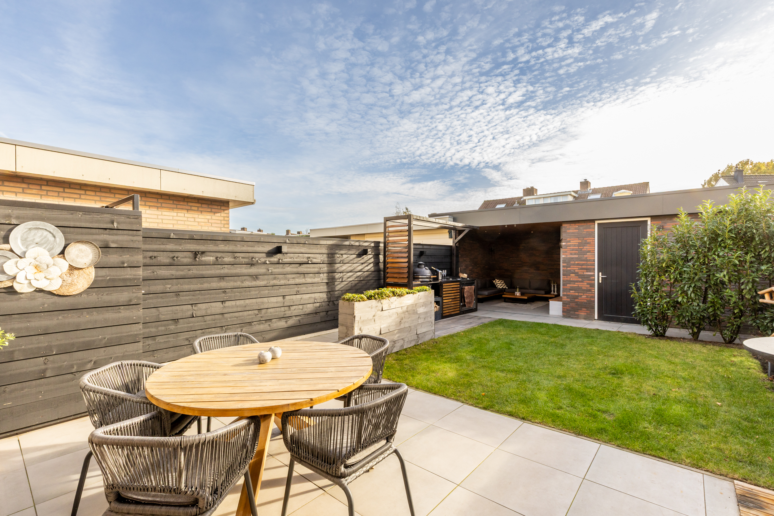 De achtertuin ligt op het zonnige zuiden en is net zo verzorgd als de woning. Direct achter het huis is een groot terras met keramische tegels. Aan de achtergevel is een zonneluifel aangebracht. Verder zien we een gazon en borders. Een afsluitbare poort geeft toegang tot het naastgelegen voetpad richting de Calluna. Dat is dus de gang die we aan de voorzijde gezien hebben. Op de plek van de oude garage is in 2022 een compleet nieuwe garage gebouwd. Deze is geïsoleerd en voorzien van een elektrische roldeur. Aan de garage is een sfeervolle overkapping gemaakt met een schouw met bio-ethanol haard. Een plek om te genieten met die jouw lief zijn.