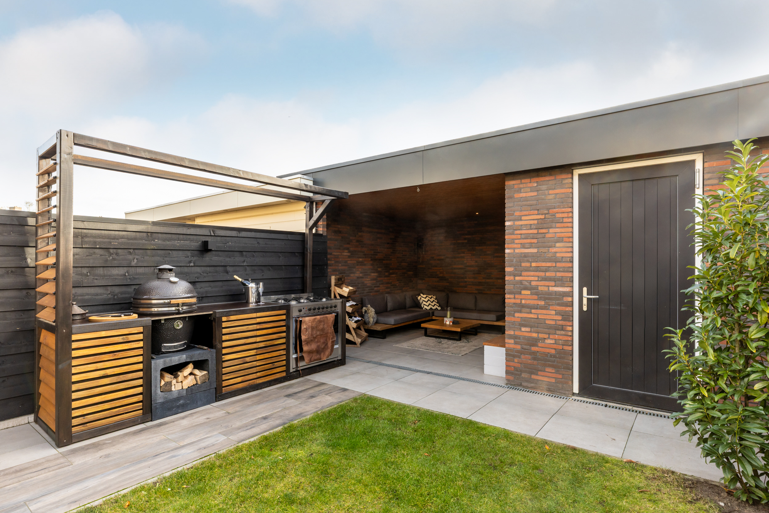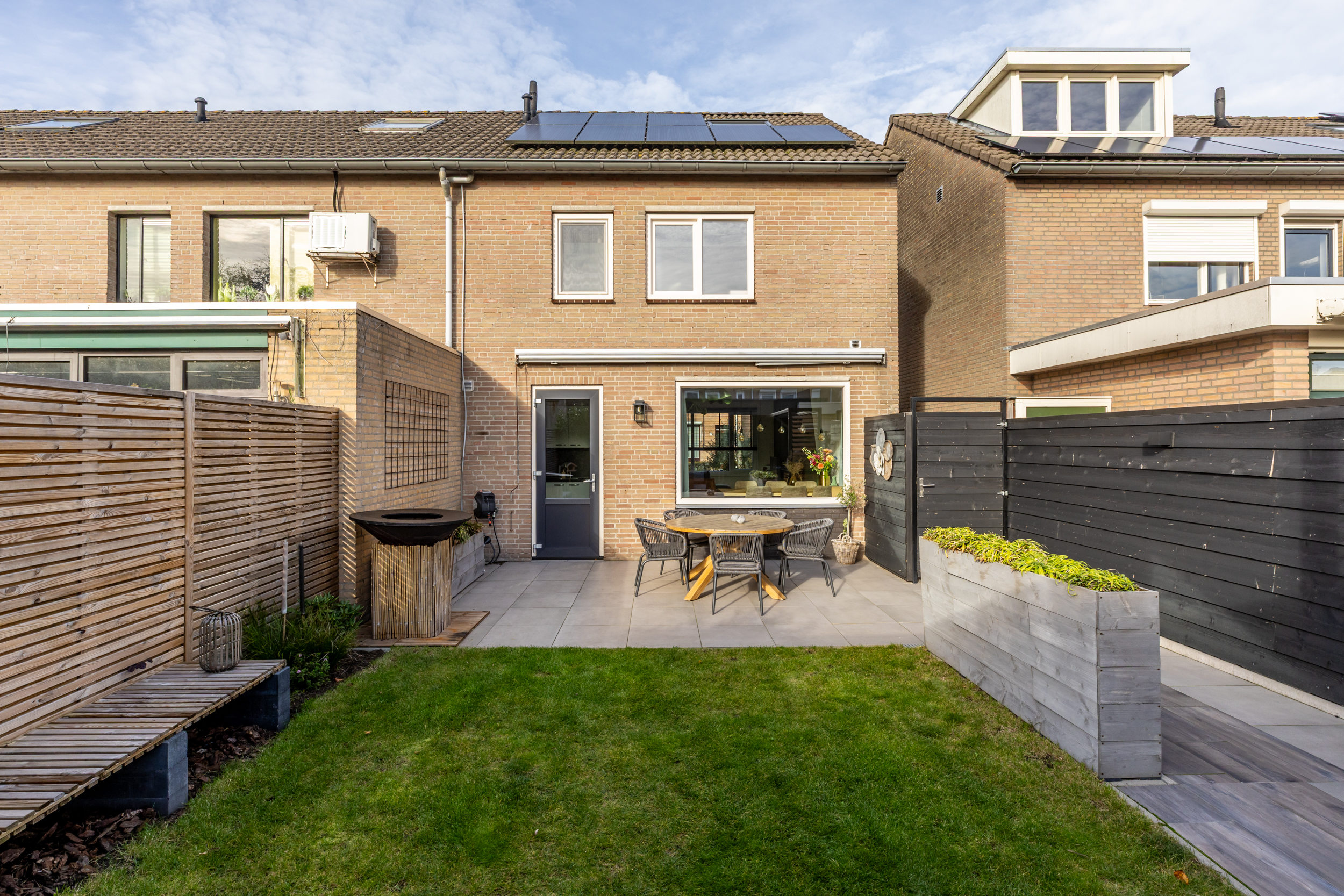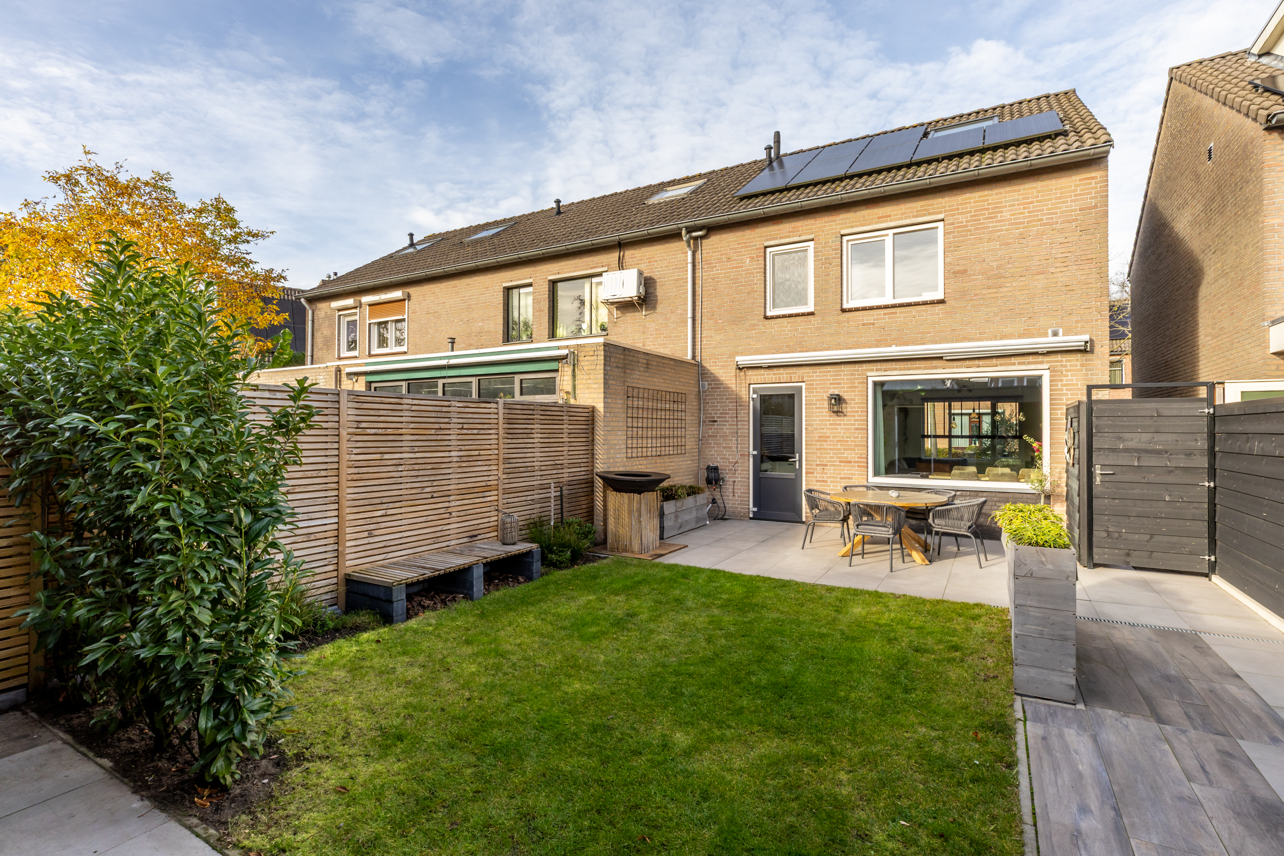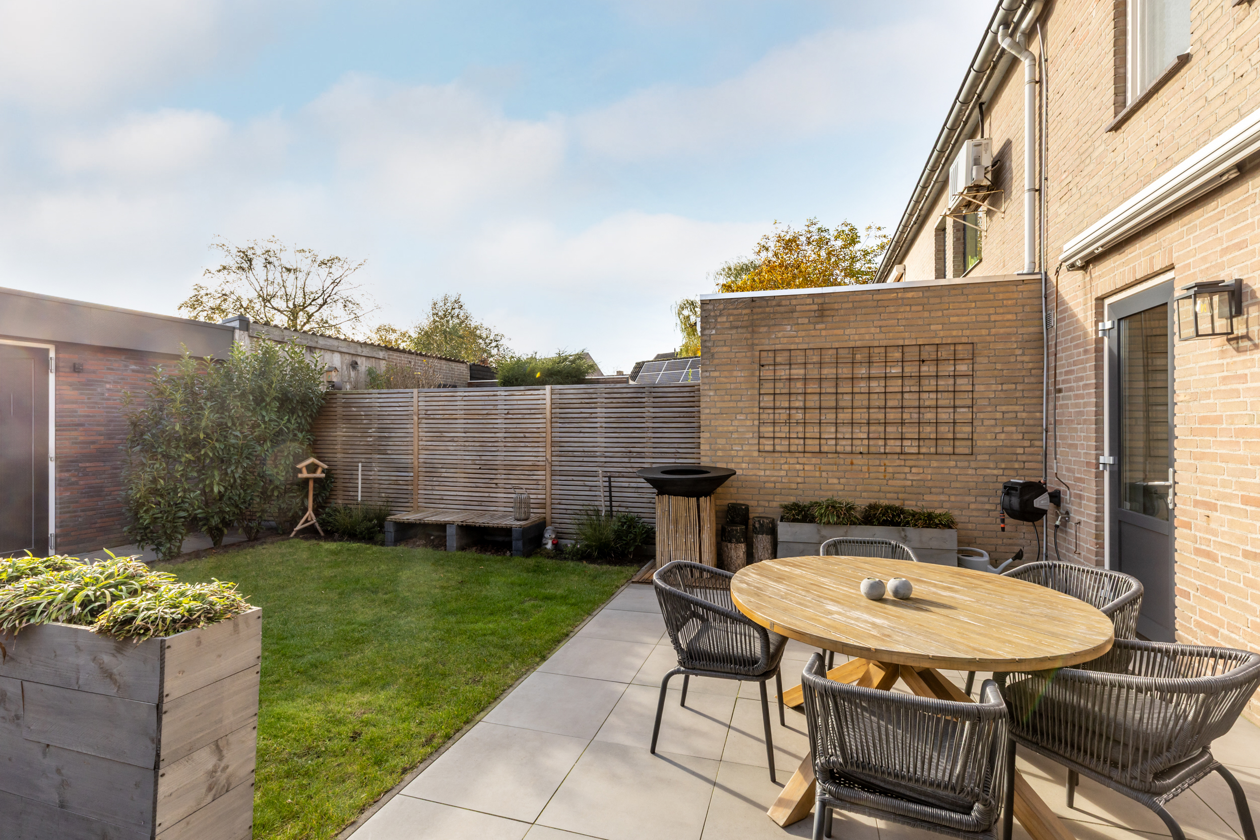 De achtertuin ligt op het zonnige zuiden en is net zo verzorgd als de woning. Direct achter het huis is een groot terras met keramische tegels. Aan de achtergevel is een zonneluifel aangebracht. Verder zien we een gazon en borders. Een afsluitbare poort geeft toegang tot het naastgelegen voetpad richting de Calluna. Dat is dus de gang die we aan de voorzijde gezien hebben. Op de plek van de oude garage is in 2022 een compleet nieuwe garage gebouwd. Deze is geïsoleerd en voorzien van een elektrische roldeur. Aan de garage is een sfeervolle overkapping gemaakt met een schouw met bio-ethanol haard. Een plek om te genieten met die jouw lief zijn.