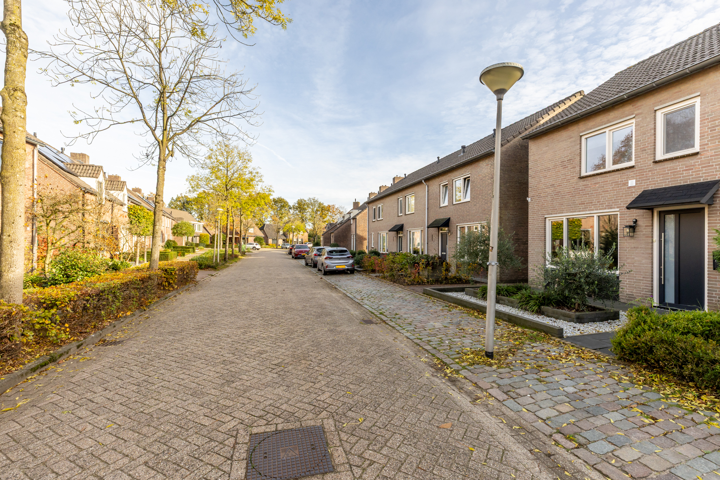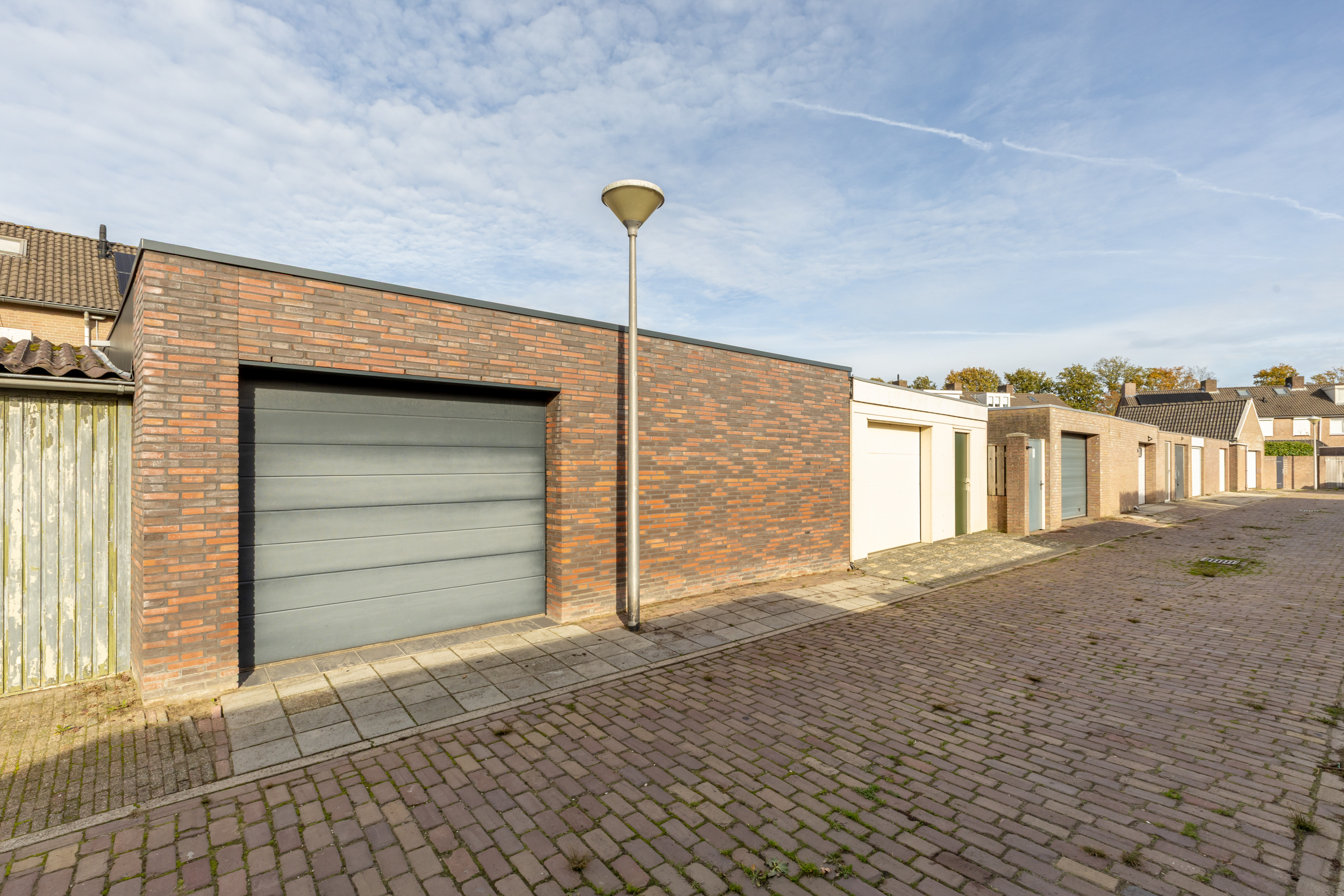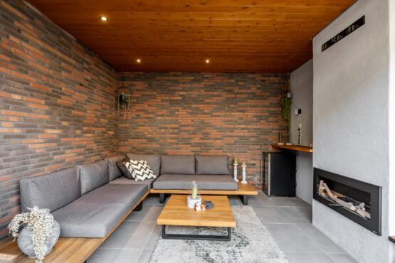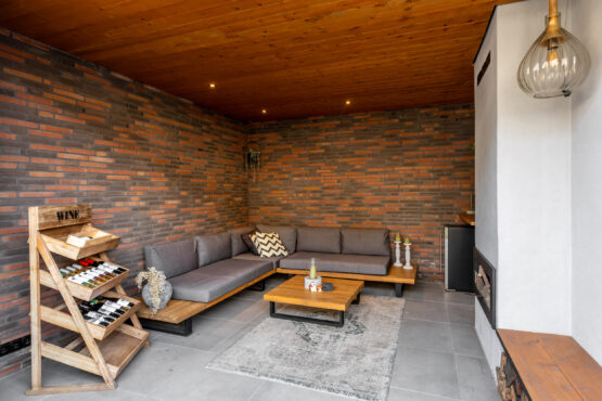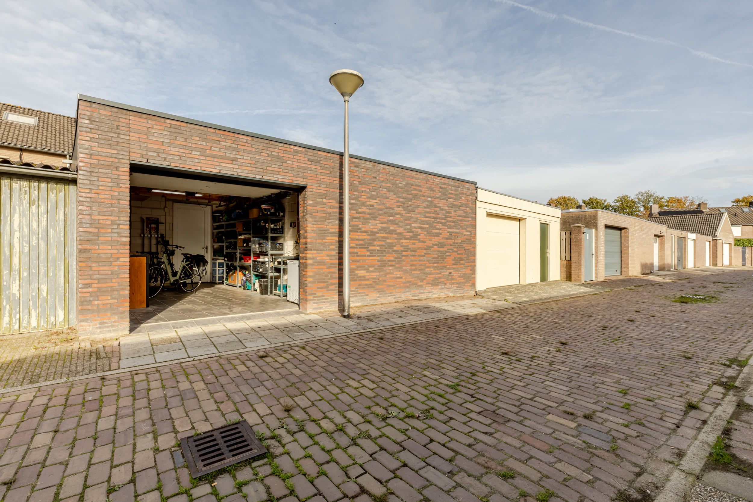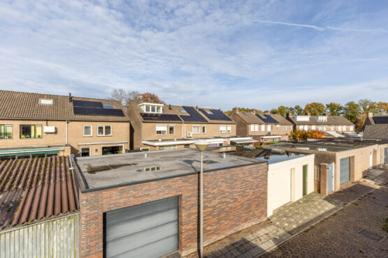 De achtertuin ligt op het zonnige zuiden en is net zo verzorgd als de woning. Direct achter het huis is een groot terras met keramische tegels. Aan de achtergevel is een zonneluifel aangebracht. Verder zien we een gazon en borders. Een afsluitbare poort geeft toegang tot het naastgelegen voetpad richting de Calluna. Dat is dus de gang die we aan de voorzijde gezien hebben. Op de plek van de oude garage is in 2022 een compleet nieuwe garage gebouwd. Deze is geïsoleerd en voorzien van een elektrische roldeur. Aan de garage is een sfeervolle overkapping gemaakt met een schouw met bio-ethanol haard. Een plek om te genieten met die jouw lief zijn.