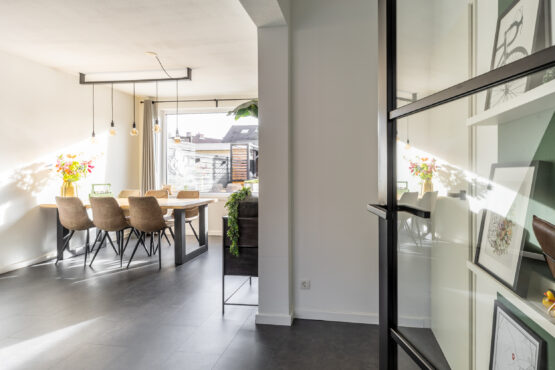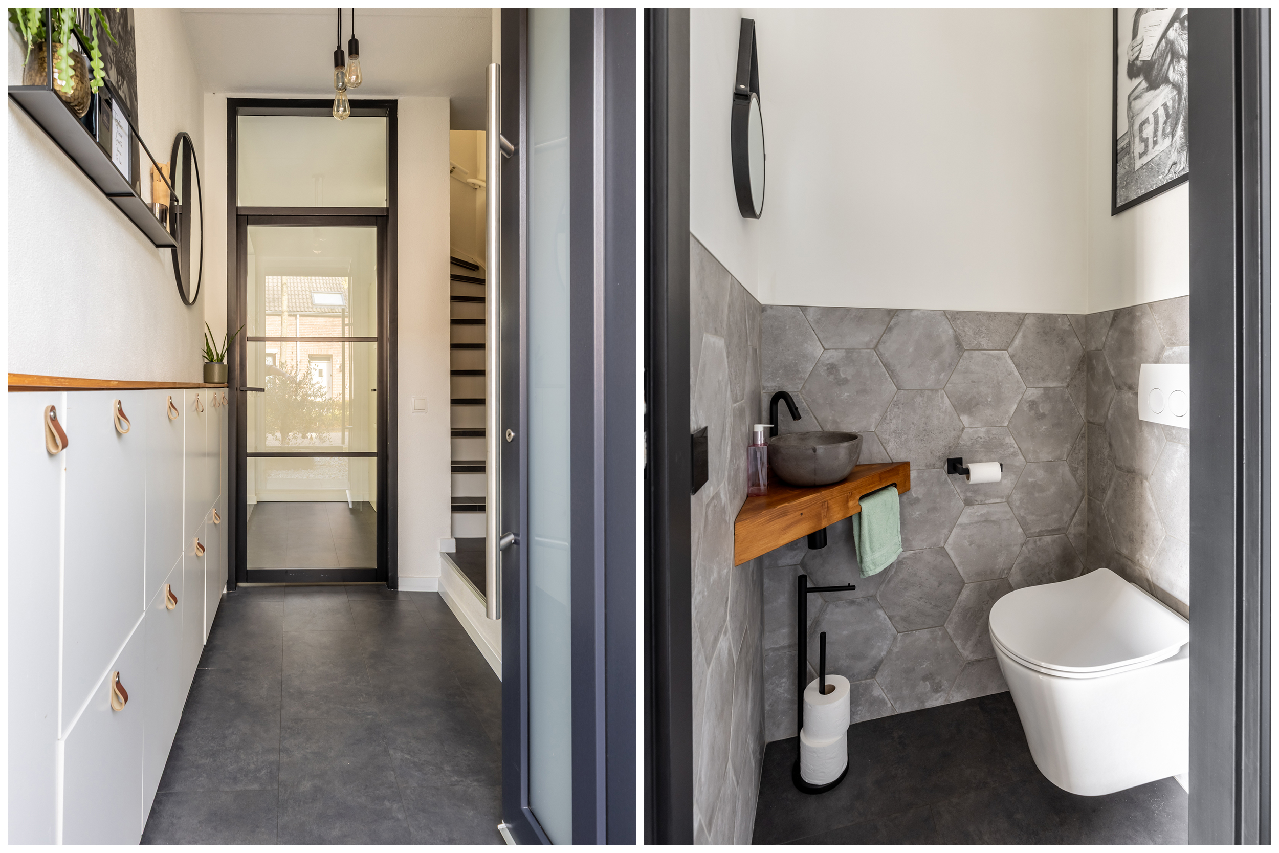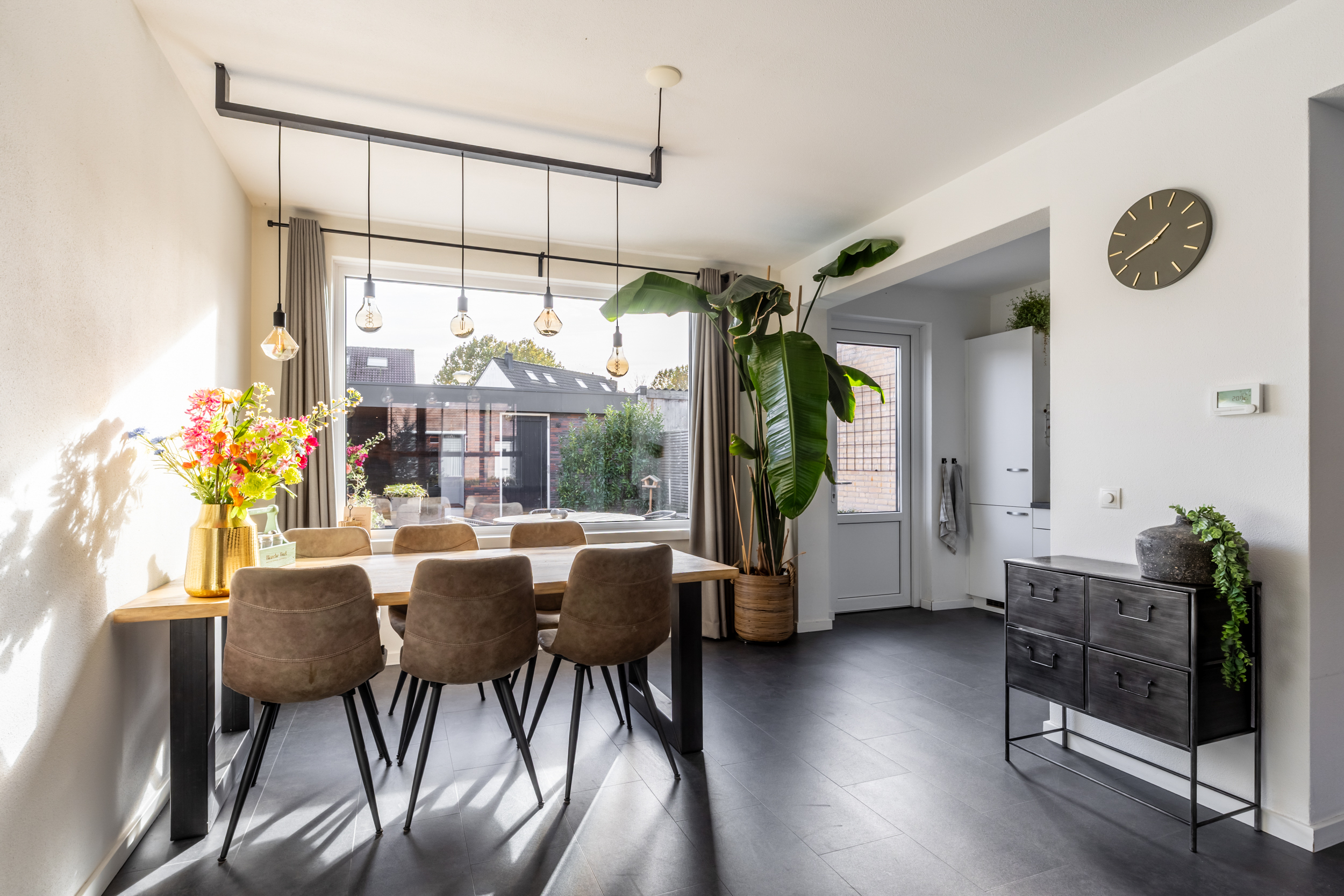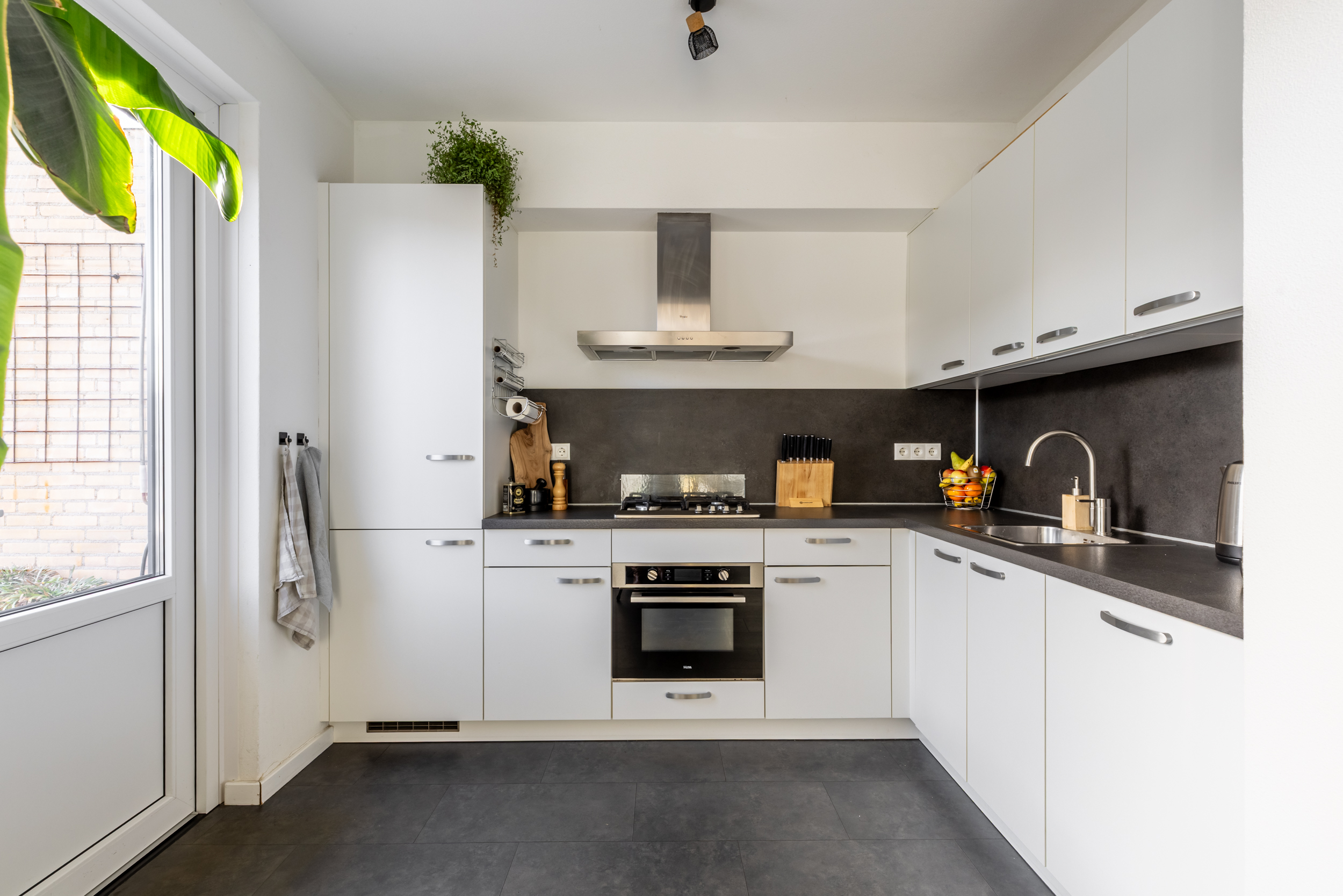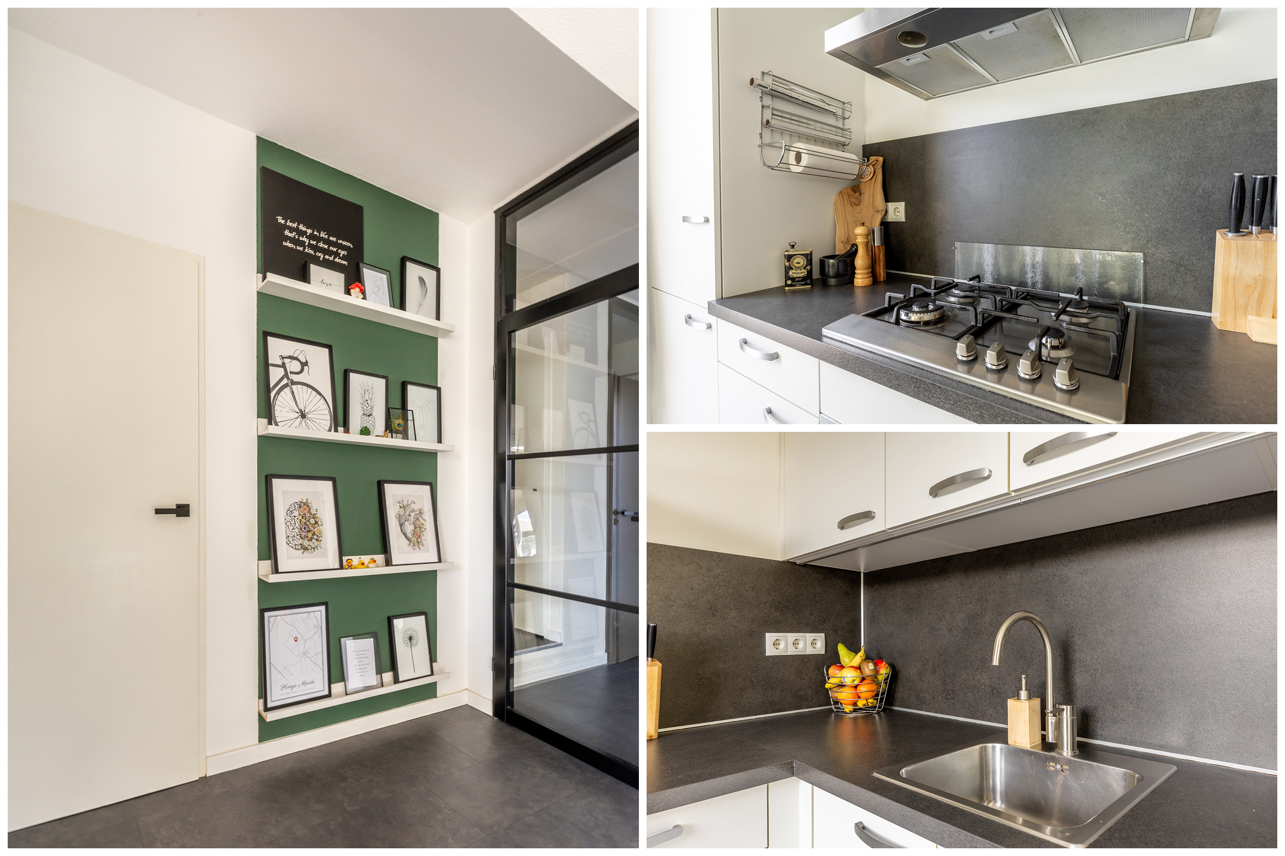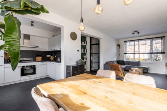 We lopen richting de voordeur, openen deze en stappen in de hal. Meteen rechts van ons is het toilet met hangcloset en een fonteintje. De afwerking is fraai en modern. Superhandig is dat in hal tegen de wand diverse schoenenkasten zijn gemaakt. Wat een goed idee! We lopen verder, passeren rechts van ons de meterkast en de trapopgang en zien voor ons een mooie glazen deur in steel-look. Achter deze deur lonkt de woonkamer, dus we lopen snel door. De woonkamer is ruim, licht en sfeervol afgewerkt. De zithoek is aan de voorzijde en de eethoek aan de achterzijde. Halverwege de kamer zien we rechts een deur naar een grote provisiekast. De woonkamer is een heerlijk lichte ruimte. Er zijn namelijk grote ramen aan zowel de voor- als de achterkant van de kamer. De houten kozijnen zijn hier vervangen door kunststof kozijnen met triple glas wat bijdraagt aan het wooncomfort. Strak stuc- en spuitwerk de kleuraccenten van de muurverf geven het geheel een moderne uitstraling. Op de vloer zien we een strakke PVC-vloer die over de hele begane grond is aangebracht. Hier ook geen radiators, want onder de geïsoleerde vloer in de woonkamer en keuken ligt behaaglijke vloerverwarming! Verder naar achter lopend komen we in de open keuken. Deze fris-witte keuken is in 2016 geplaatst en voorzien van Whirlpool inbouwapparatuur, zoals een vaatwasser, combi-oven, rvs afzuigkap en een koel-vries combinatie. Het aanrechtblad is van donkergrijs kunststof, dat ook is doorgetrokken op de achterwand. Verder zien we een vierpits gasfornuis en een spoelbak met design-kraan.