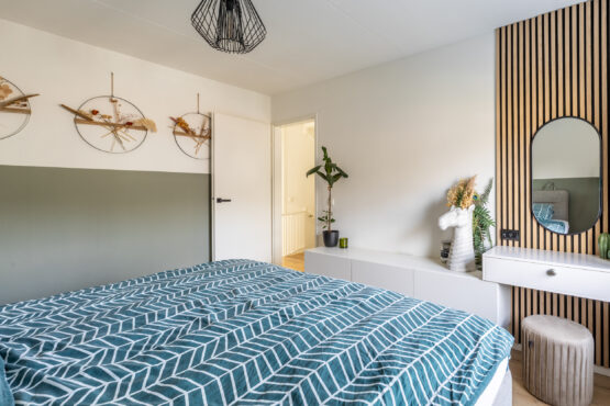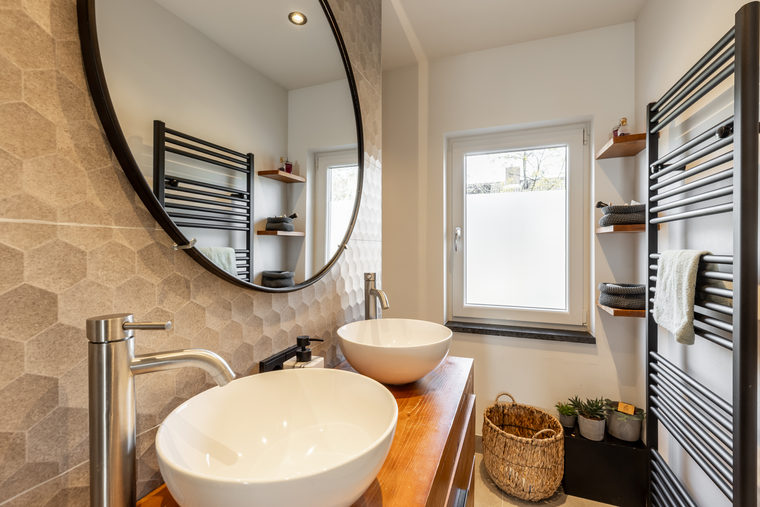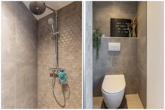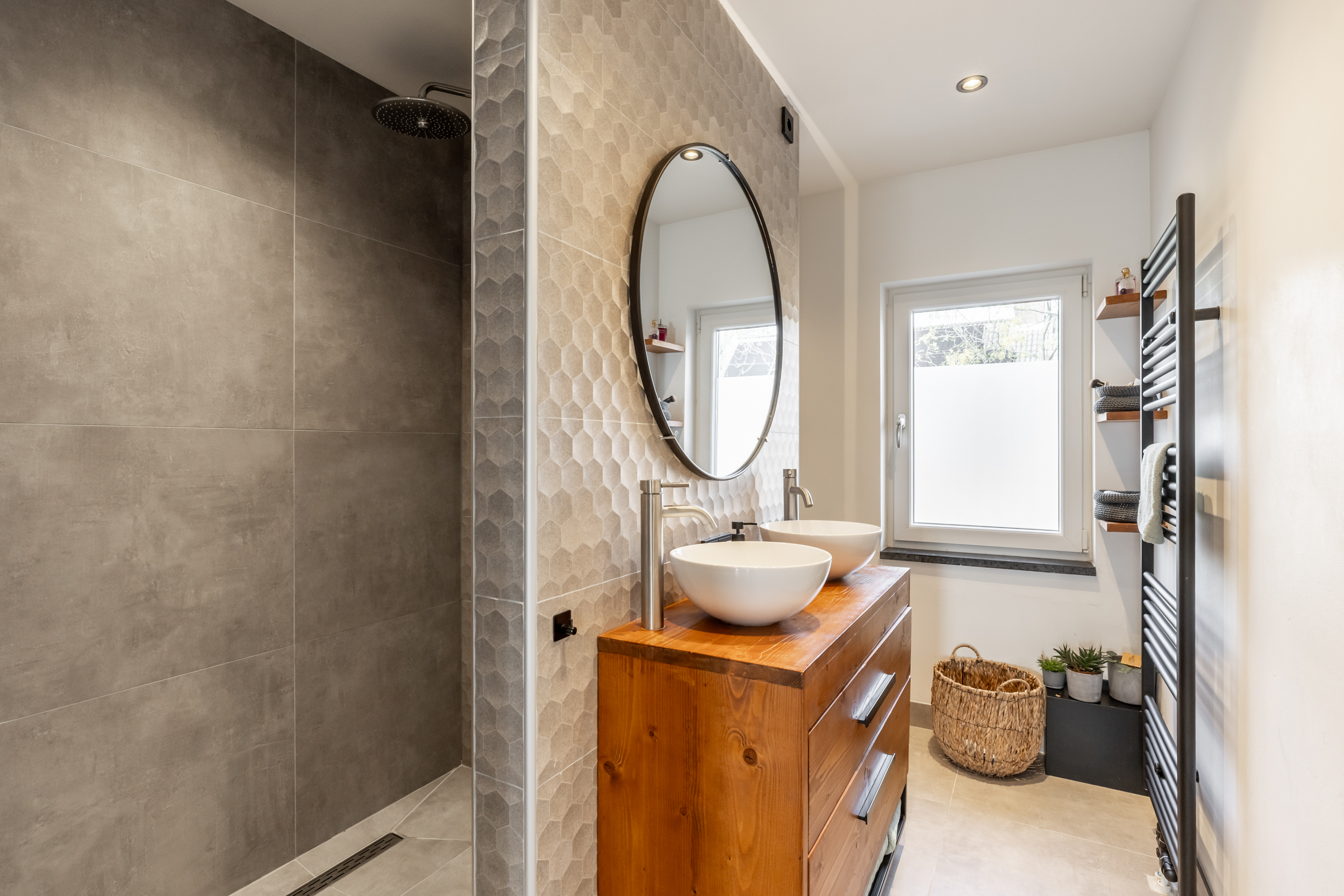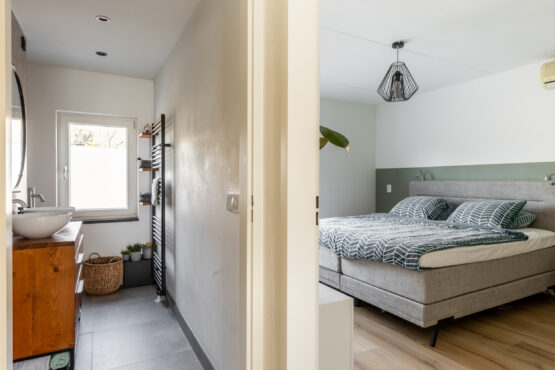 De laatste ruimte op deze verdieping is de badkamer. Deze moderne badkamer is in 2020 nog compleet vernieuwd en is helemaal van nu qua look en feel. Er is een grote inloopdouche met regen- en handdouche, een badmeubel met dubbele waskom, een toilet en een desigradiator. De vloertegels zijn uitgerust met vloerverwarming. Wat ons betreft een bijzonder aangename aanvulling voor een badkamer. Heerlijk, die warme voetjes.
