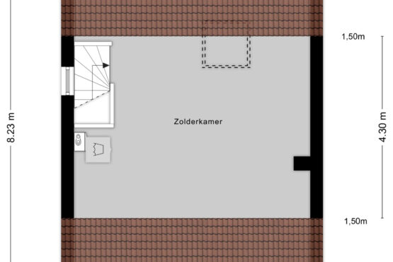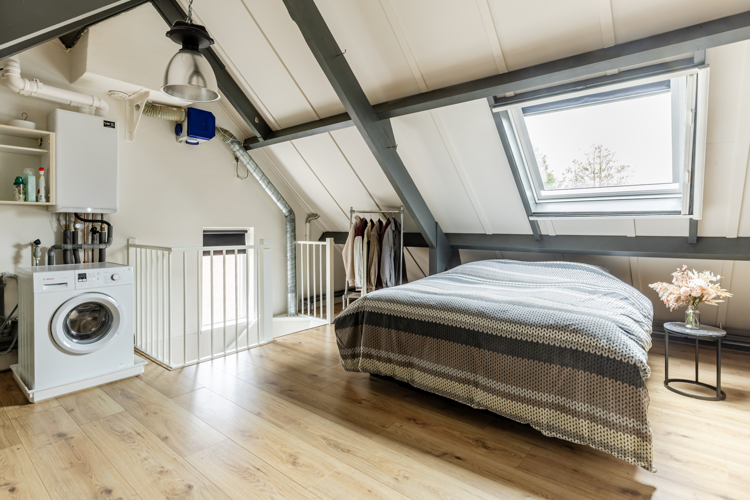 Met een vaste trap gaan we naar de 2e verdieping. Ook hier is een zee aan ruimte. Het is nu feitelijk een groot vertrek, maar je zou hier nog prima een of meerdere slaapkamers kunnen maken! Aan de zijgevel hangt de HR-combiketel (2024), de MV-unit en de omvormer van de zonnepanelen. Op het dak liggen nl 11 zonnepanelen.