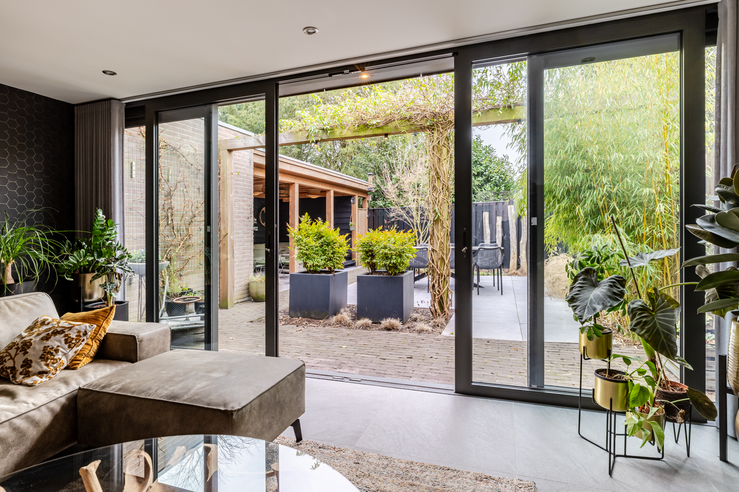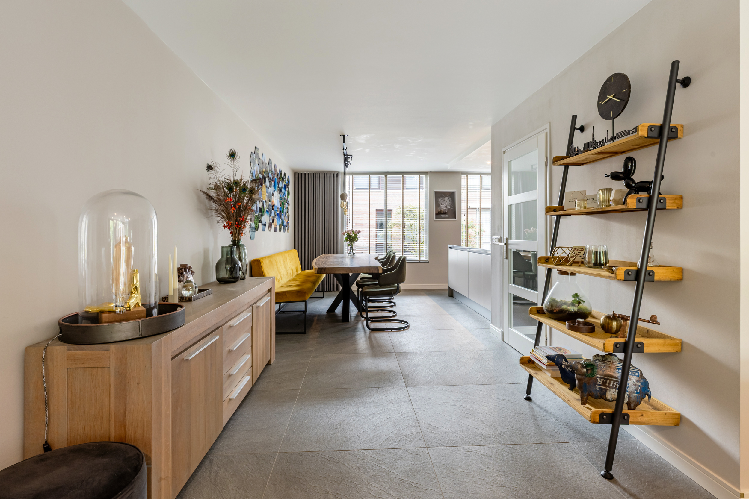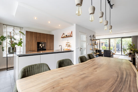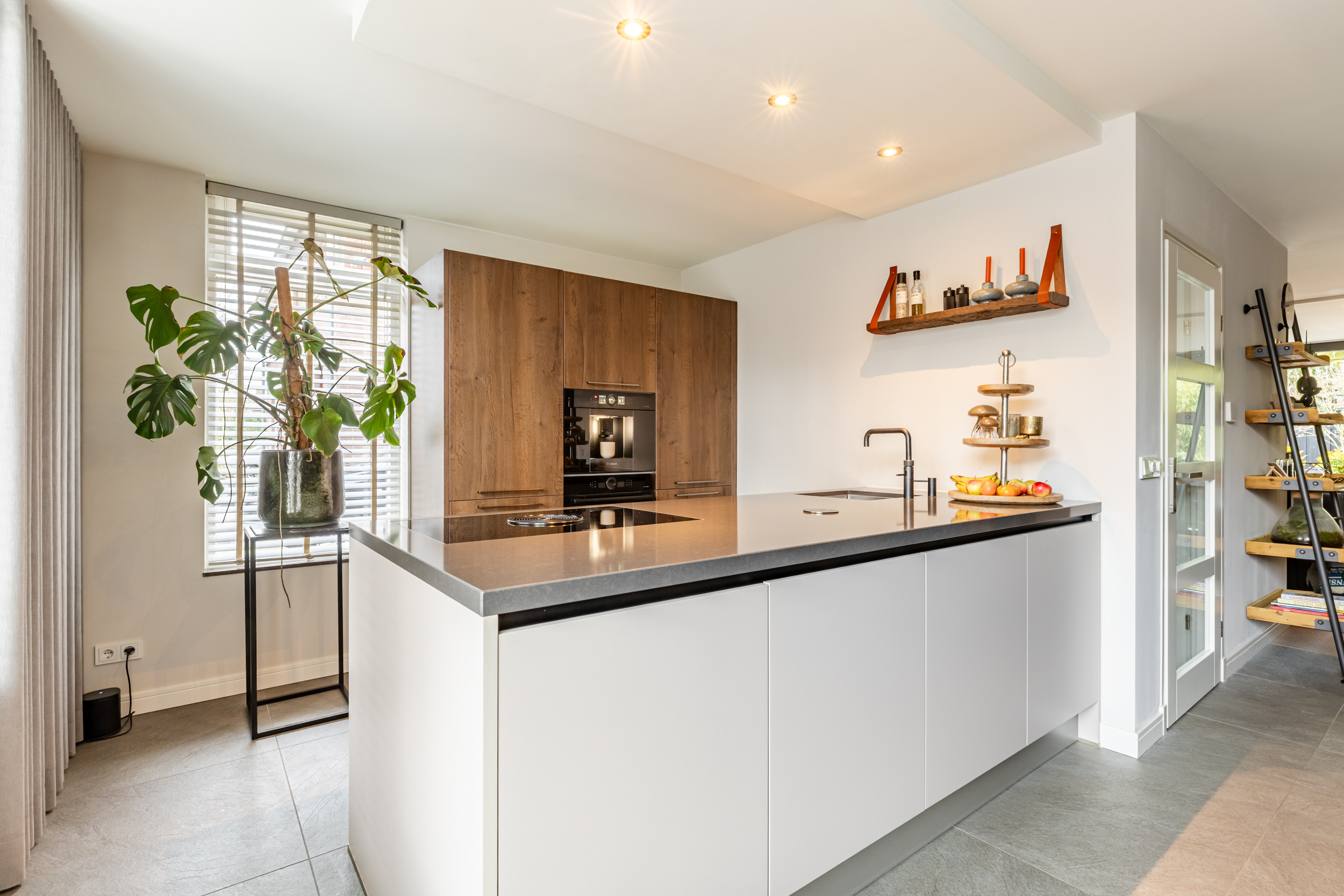 Bij binnenkomst in de hal krijgen we een eerste indruk van het afwerkingsniveau van het huis. De trap is gerenoveerd, deuren uitgerust met een modern beslag en een strakke grijze tegelvloer. De begane grondvloer is vervangen door een geïsoleerde betonvloer met vloerverwarming als hoofdverwarming. Energiezuinig en aangenaam! We lopen richting de woonkamer. Rechts van ons is een garderobenis en links van ons bevindt zich de meterkast voorzien van een gemoderniseerde en uitgebreide groepenkast. De volgende deur links is van het toilet. Dit moderne toilet is compleet met hangcloset en een fonteintje. Via een deur met glas bereiken we de woonkamer. Deze is meteen links van ons. De woning blijkt aan de achterzijde fors uitgebouwd en dat zorgt voor een zee aan ruimte! Hier kun je met gemak een grote zithoek kwijt. Vanuit de woonkamer is er toegang tot een bergkast onder trap. De achtergevel is feitelijk grotendeels voorzien van glas in een aluminium schuifpui-constructie. Door het glas vangen we een eerste glimp op van de achtertuin. Die maakt ons meteen nieuwsgierig, maar we gaan natuurlijk eerst de rest van het huis bekijken. Om te beginnen de keuken. De oorspronkelijk keuken zat aan de achterzijde van het huis, maar tijdens de grote verbouwing in 2019/2020 is de locatie van de keuken verplaatst naar de voorzijde van het huis. Volgens ons een goede keuze! Zo is er meer dan voldoende plek voor een leefkeuken en zo hou je de woonkamer volledig tuingericht. De keuken zelf is rijkelijk uitgerust met inbouwapparatuur als een Bora inductiekookplaat met geïntegreerde afzuiging, een vaatwasser, koelkast met vrieslades, combi-oven, koffieautomaat en een Quooker voor kokend water-afgifte en de bijbehorende zeepdispenser. Er is een hoge kastenwand en een schiereiland met veel werk – en bergruimte. Boven het eiland hangt een verlaagd plafond met inbouwspots. Grenzend aan de keuken is plek voor een grote eethoek.