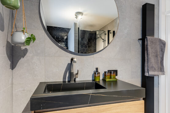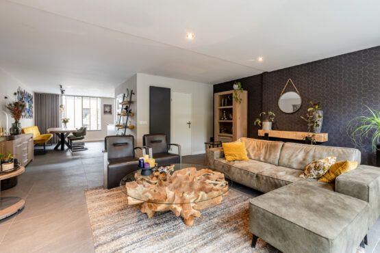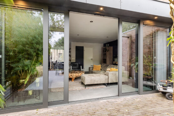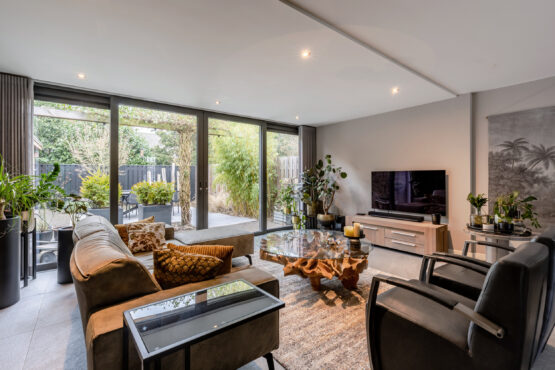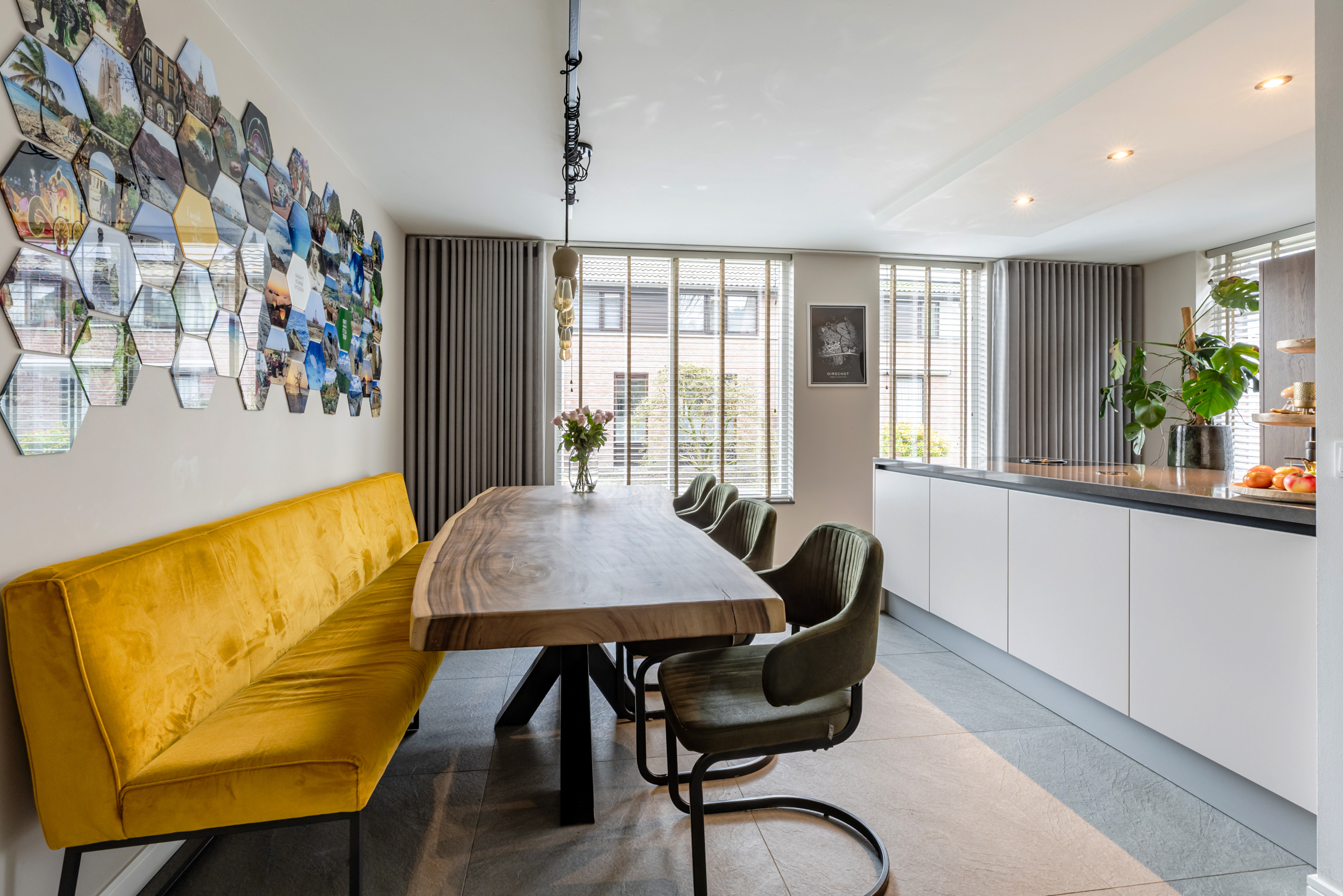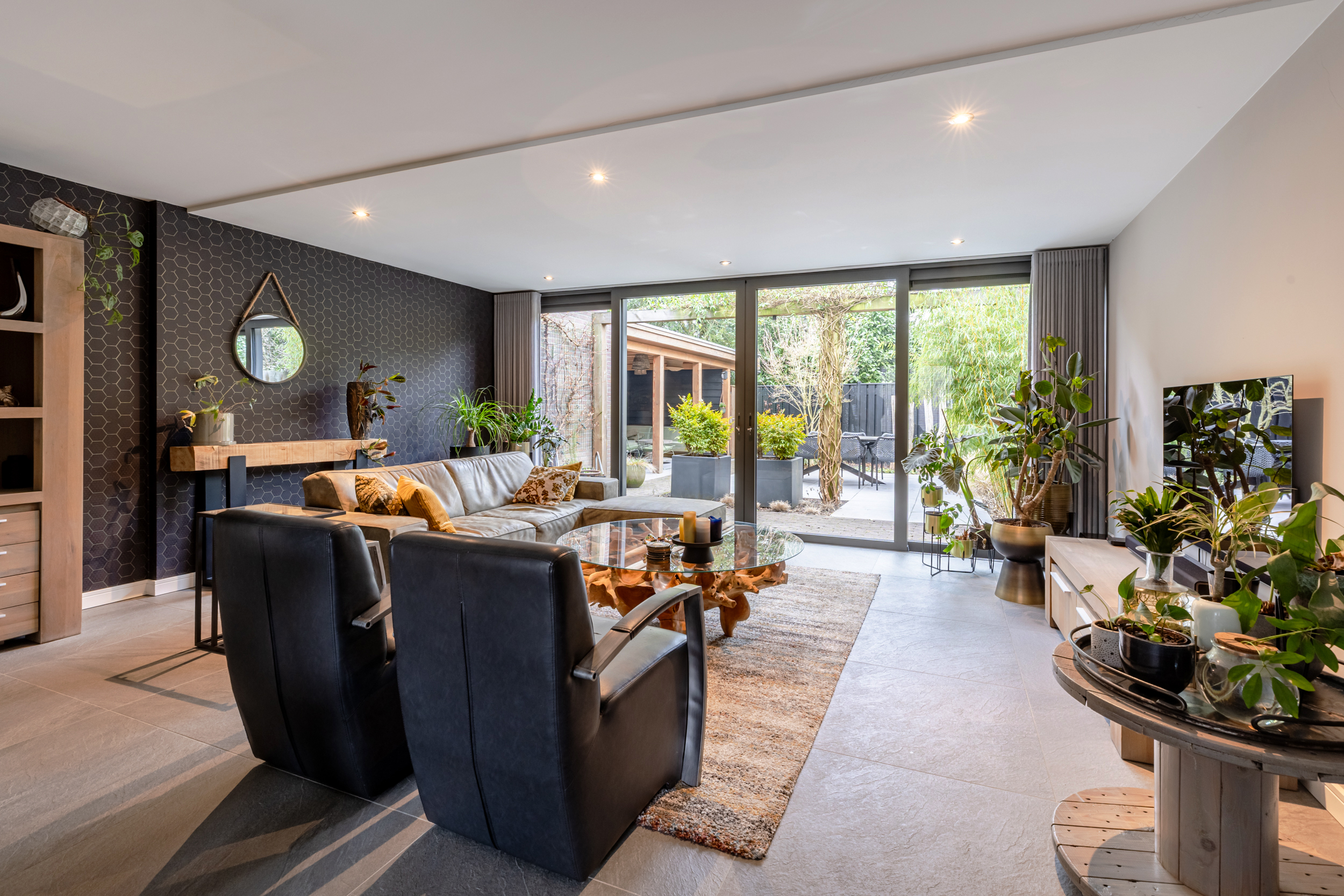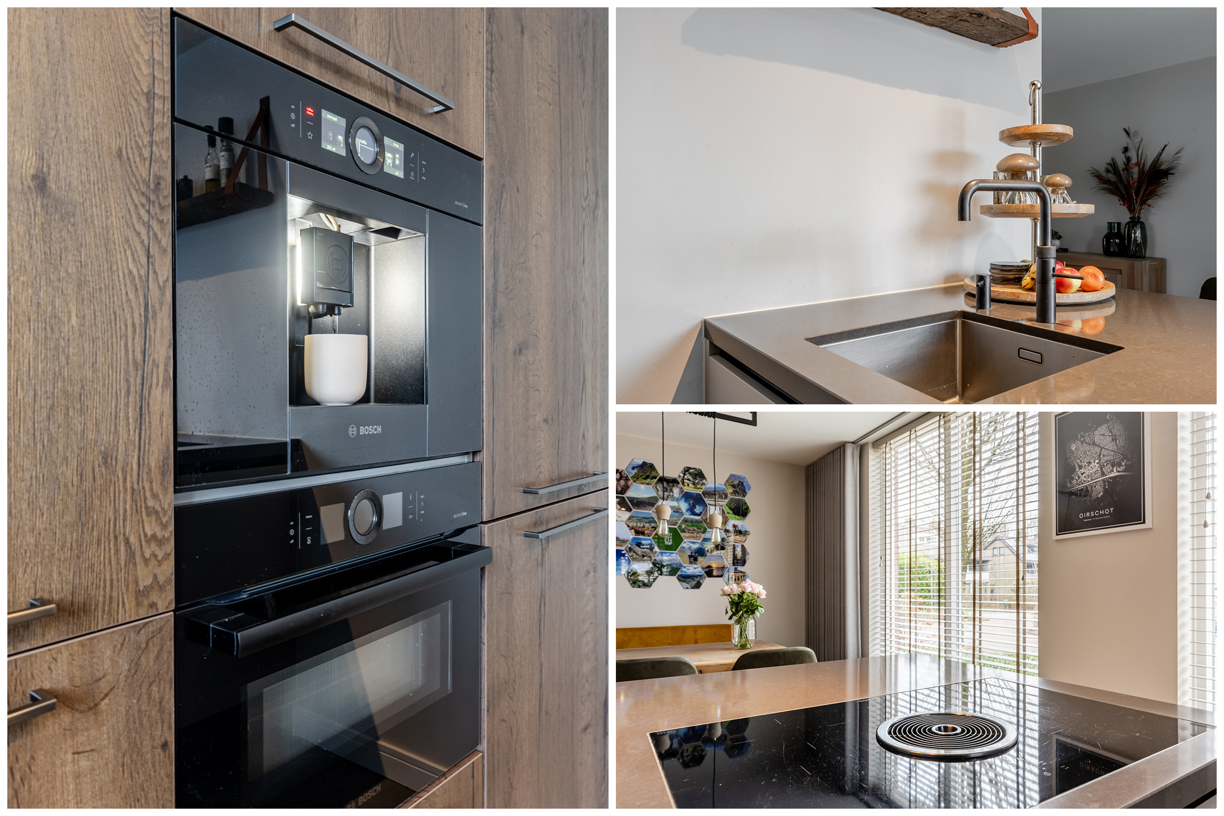 Bij binnenkomst in de hal krijgen we een eerste indruk van het afwerkingsniveau van het huis. De trap is gerenoveerd, deuren uitgerust met een modern beslag en een strakke grijze tegelvloer. De begane grondvloer is vervangen door een geïsoleerde betonvloer met vloerverwarming als hoofdverwarming. Energiezuinig en aangenaam! We lopen richting de woonkamer. Rechts van ons is een garderobenis en links van ons bevindt zich de meterkast voorzien van een gemoderniseerde en uitgebreide groepenkast. De volgende deur links is van het toilet. Dit moderne toilet is compleet met hangcloset en een fonteintje. Via een deur met glas bereiken we de woonkamer. Deze is meteen links van ons. De woning blijkt aan de achterzijde fors uitgebouwd en dat zorgt voor een zee aan ruimte! Hier kun je met gemak een grote zithoek kwijt. Vanuit de woonkamer is er toegang tot een bergkast onder trap. De achtergevel is feitelijk grotendeels voorzien van glas in een aluminium schuifpui-constructie. Door het glas vangen we een eerste glimp op van de achtertuin. Die maakt ons meteen nieuwsgierig, maar we gaan natuurlijk eerst de rest van het huis bekijken. Om te beginnen de keuken. De oorspronkelijk keuken zat aan de achterzijde van het huis, maar tijdens de grote verbouwing in 2019/2020 is de locatie van de keuken verplaatst naar de voorzijde van het huis. Volgens ons een goede keuze! Zo is er meer dan voldoende plek voor een leefkeuken en zo hou je de woonkamer volledig tuingericht. De keuken zelf is rijkelijk uitgerust met inbouwapparatuur als een Bora inductiekookplaat met geïntegreerde afzuiging, een vaatwasser, koelkast met vrieslades, combi-oven, koffieautomaat en een Quooker voor kokend water-afgifte en de bijbehorende zeepdispenser. Er is een hoge kastenwand en een schiereiland met veel werk – en bergruimte. Boven het eiland hangt een verlaagd plafond met inbouwspots. Grenzend aan de keuken is plek voor een grote eethoek.