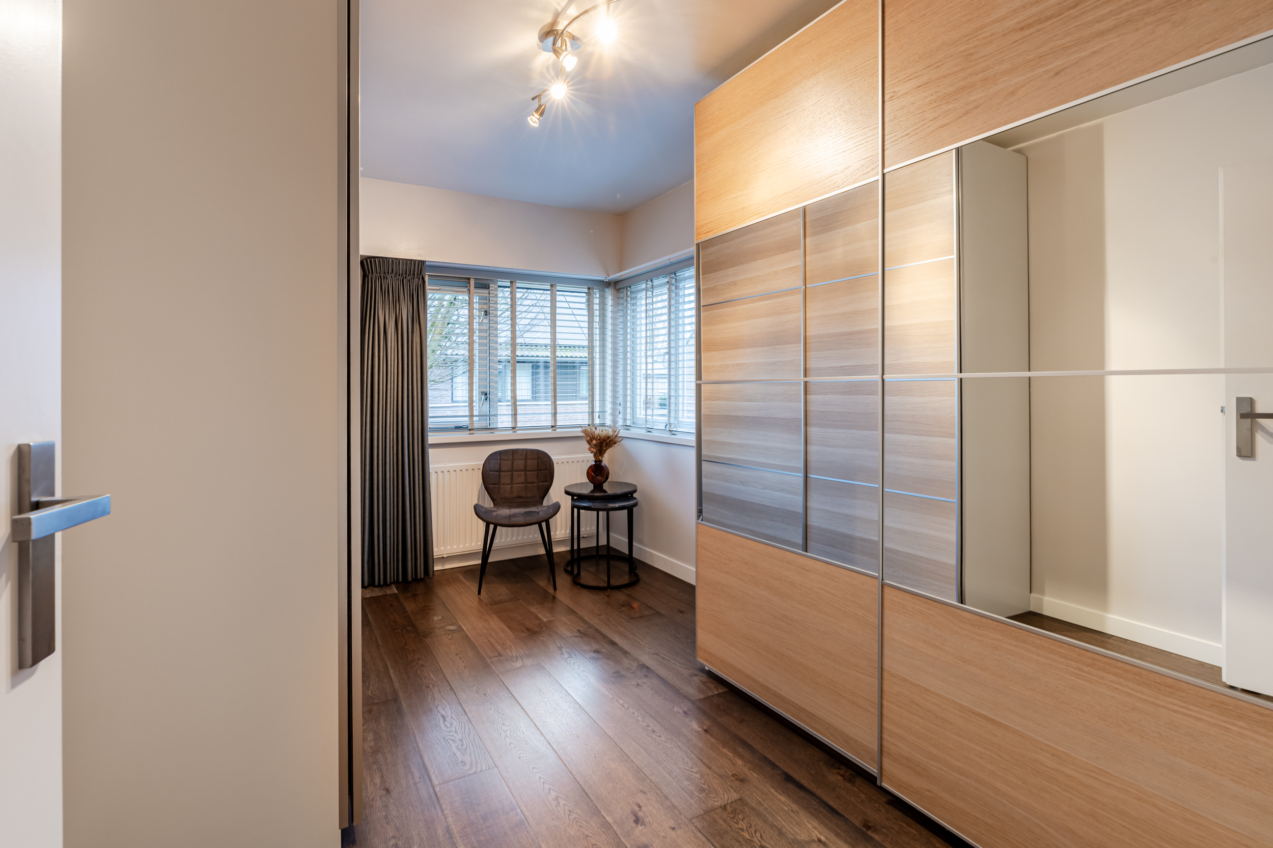 Op de 1e verdieping zijn er 3 slaapkamers. Net als op de begane grond, zien we hier strak gestucte wanden en plafonds en een hoogwaardig afwerkingsniveau. Wat ook meteen opvalt is de ruimte op deze woonlaag. Alle slaapkamers hebben een goed formaat. Op de vloer van de slaapkamers en de overloop ligt een eiken multiplank-vloerafwerking. De ramen zijn hier, net als in de rest van het huis, vervangen door HR++ beglazing. De badkamer is een plaatje om te zien. Geheel betegeld, waarbij de vloer is uitgerust met elektrische vloerverwarming. Er is een grote inloopdouche met zitbankje en een regen – en handdouche. Het badmeubel is ook bijzonder fraai wat ons betreft!