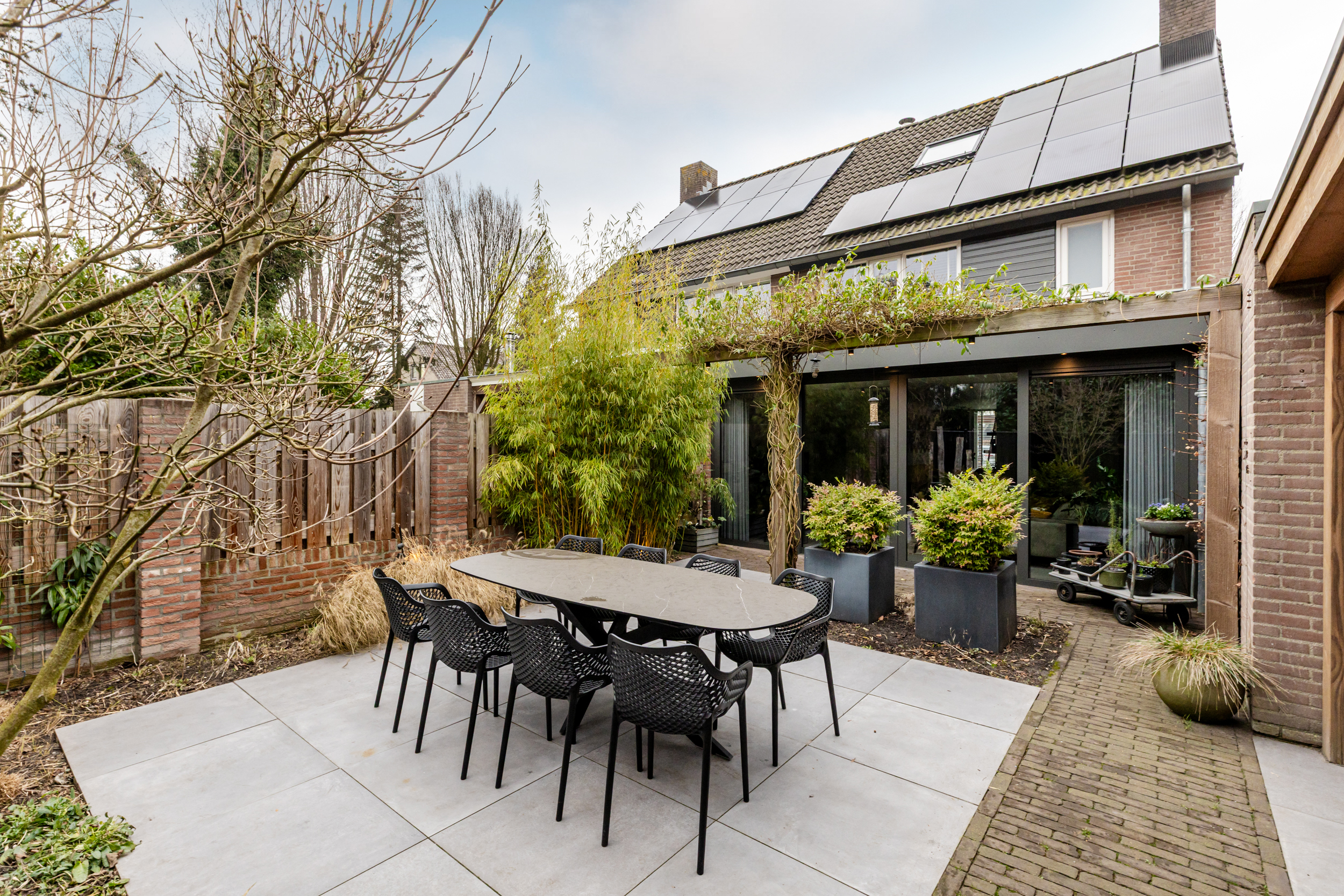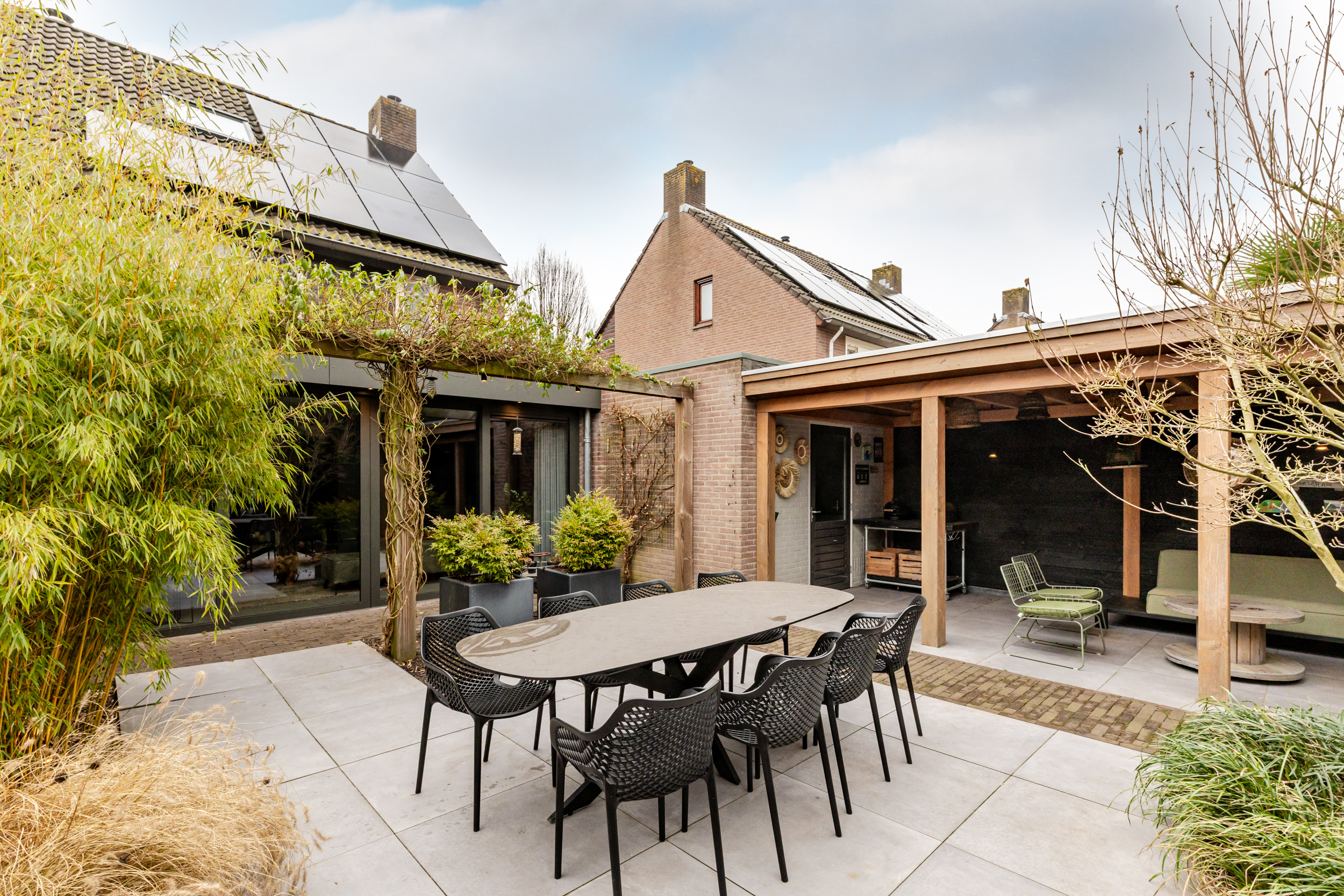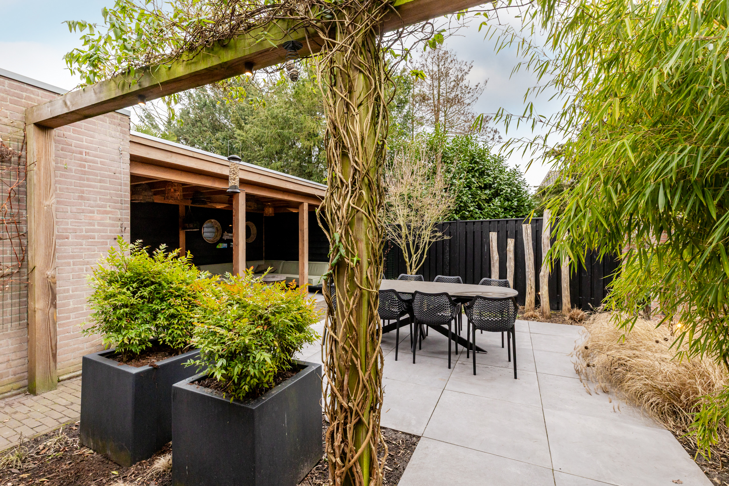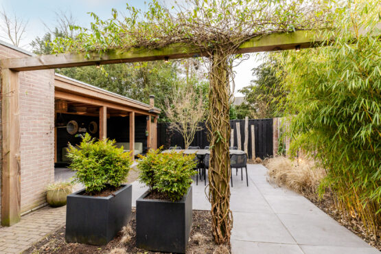 De achtertuin is een lust voor het oog. Met liefde aangelegd en onderhouden. Gepositioneerd op het zuidwesten, dus qua zon zit je hier goed. We zien strakke bestrating en enkele plantvakken, ook een pergola. Links achterin is een prachtige overkapping van Douglas-hout. Hier kun je natuurlijk heerlijk beschut tot in de late uurtjes genieten. Aangrenzend is nog extra bergruimte onder een overkapping, ideaal voor bijvoorbeeld de kliko’s. Direct achter het huis ligt een woonhuis op een groot perceel, waardoor je in deze tuin een aangenaam vrij gevoel hebt. Bij het huis hoort ook nog een inpandige garage met 2 houten opslaande deuren naar de oprit.