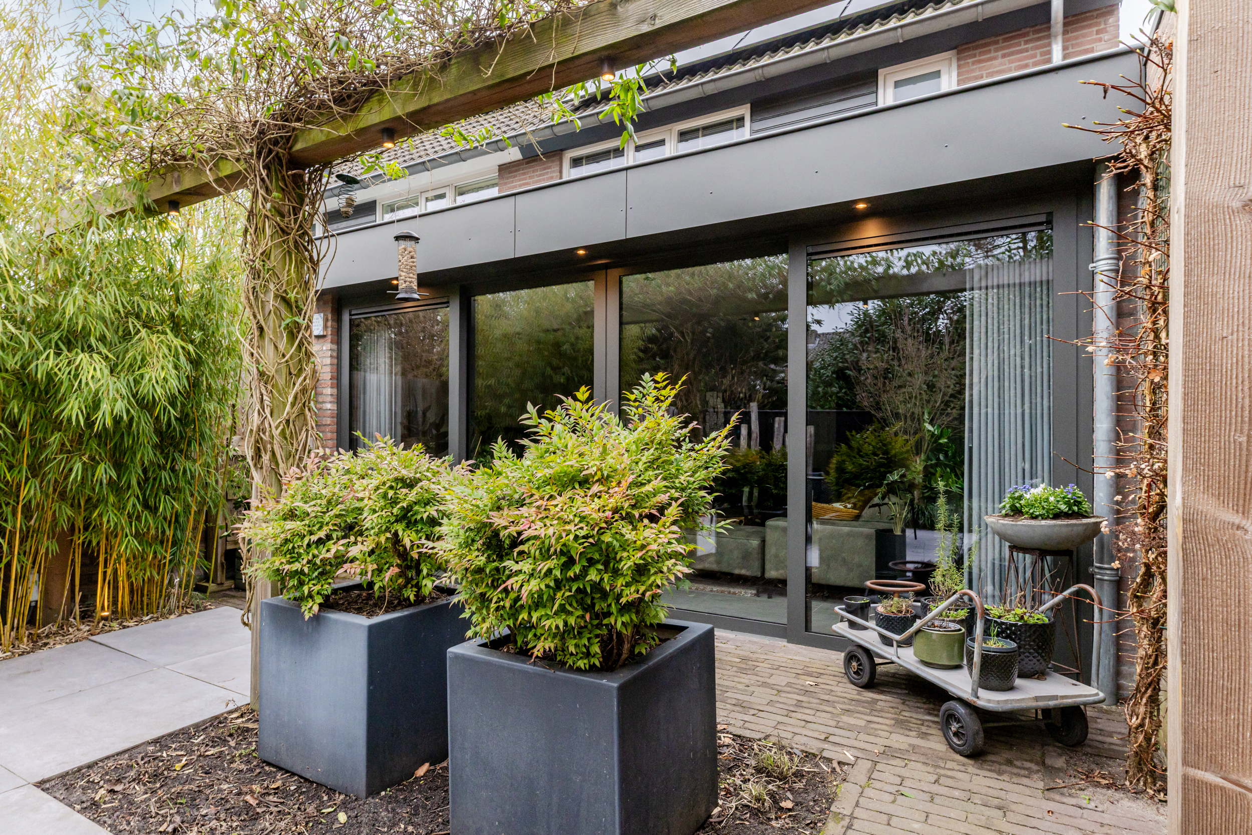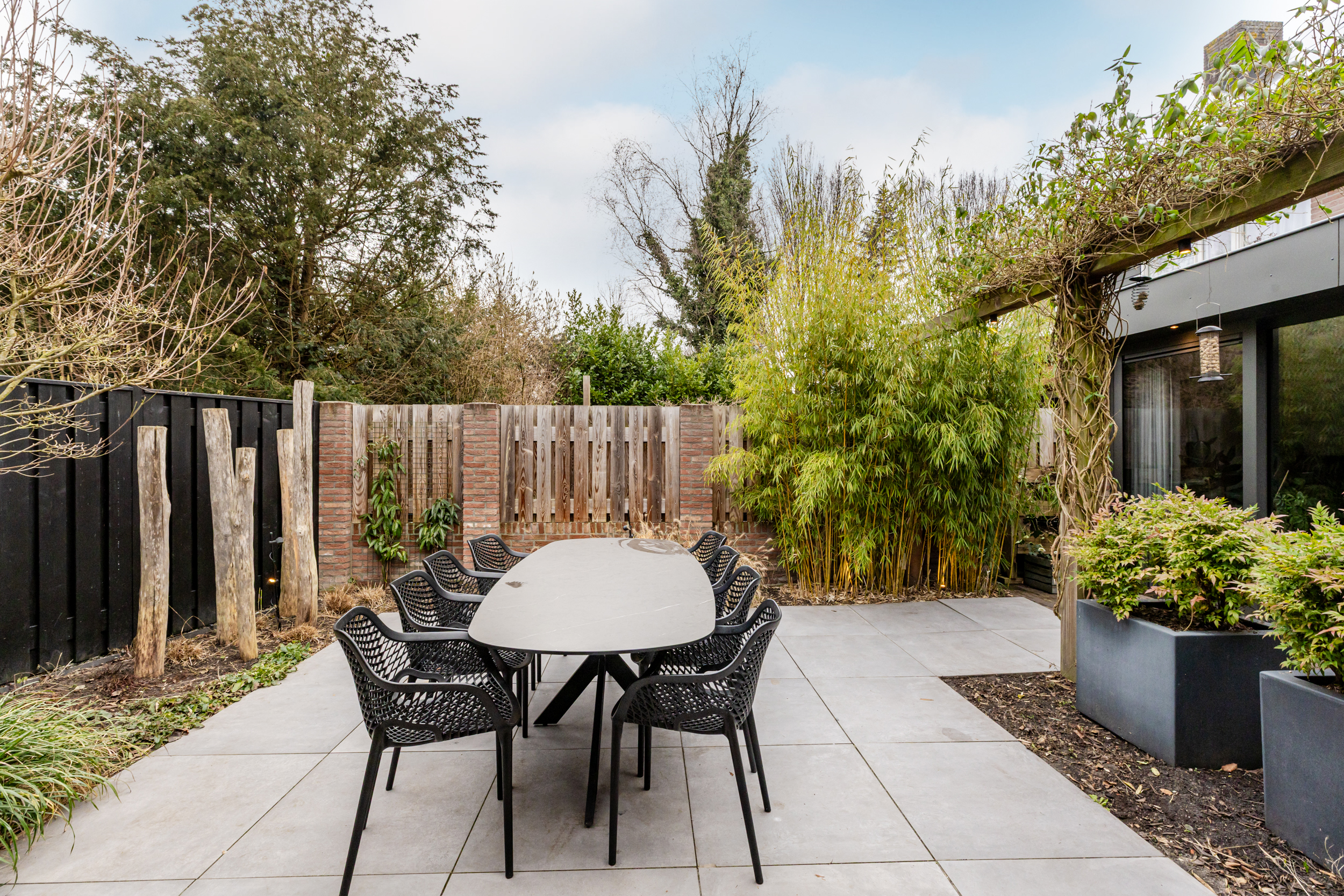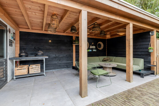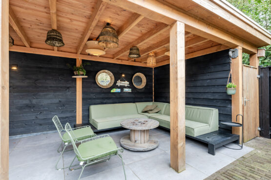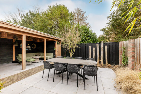 De achtertuin is een lust voor het oog. Met liefde aangelegd en onderhouden. Gepositioneerd op het zuidwesten, dus qua zon zit je hier goed. We zien strakke bestrating en enkele plantvakken, ook een pergola. Links achterin is een prachtige overkapping van Douglas-hout. Hier kun je natuurlijk heerlijk beschut tot in de late uurtjes genieten. Aangrenzend is nog extra bergruimte onder een overkapping, ideaal voor bijvoorbeeld de kliko’s. Direct achter het huis ligt een woonhuis op een groot perceel, waardoor je in deze tuin een aangenaam vrij gevoel hebt. Bij het huis hoort ook nog een inpandige garage met 2 houten opslaande deuren naar de oprit.
