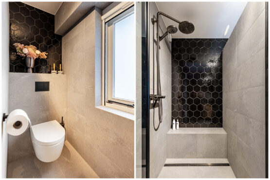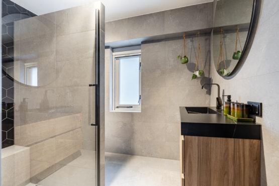 – moderne badkamer met inloopdouche, toilet en vloerverwarming