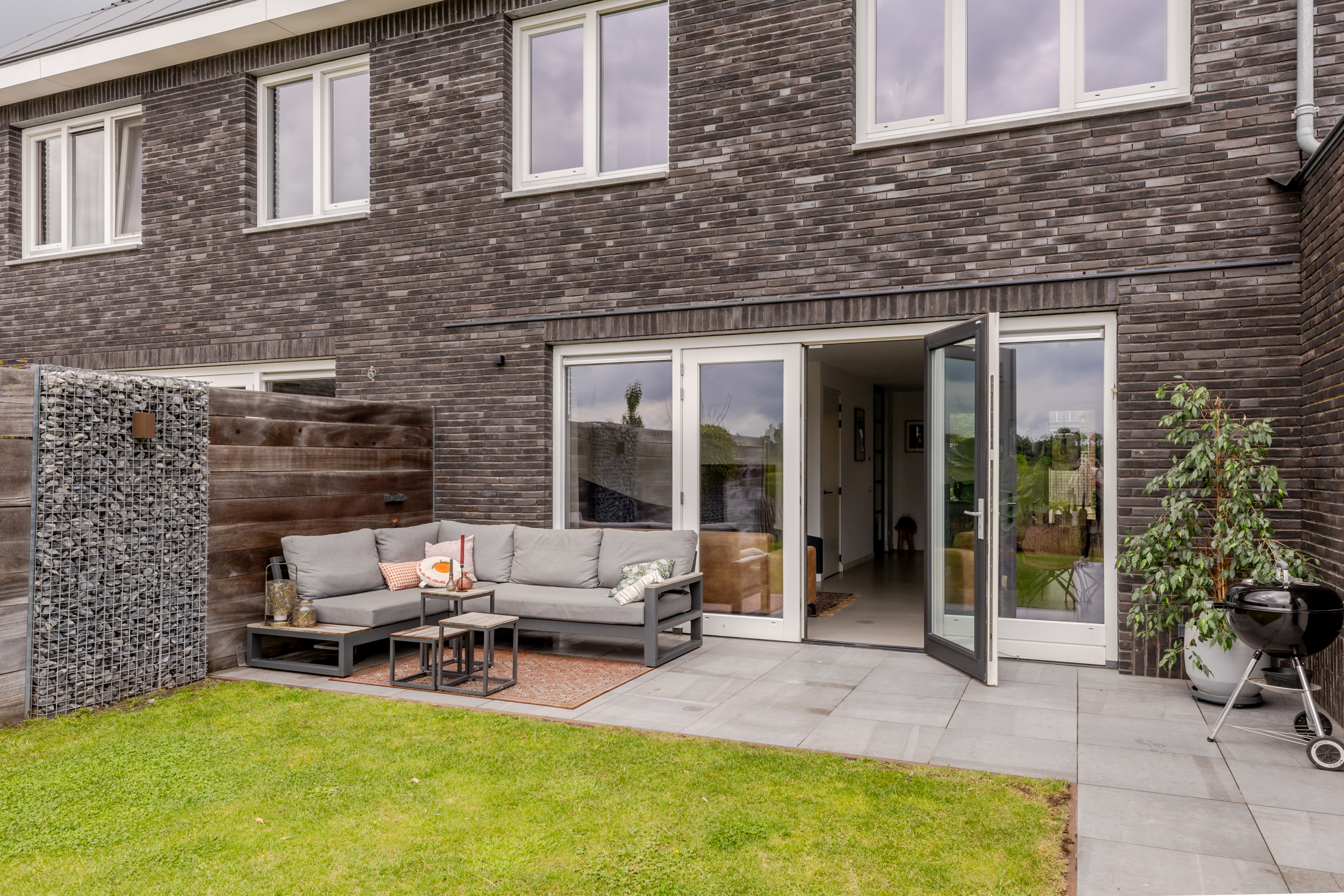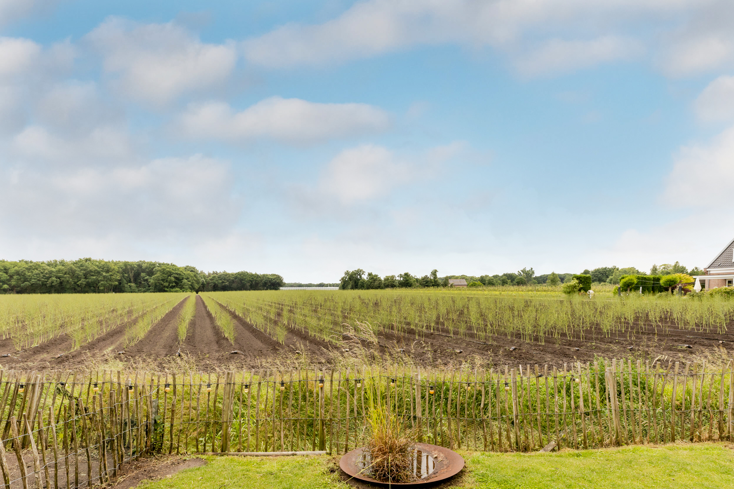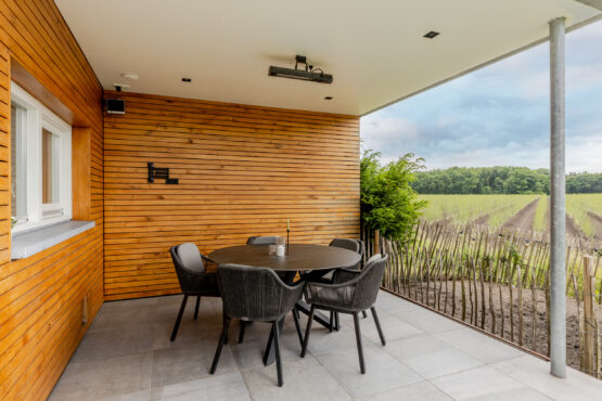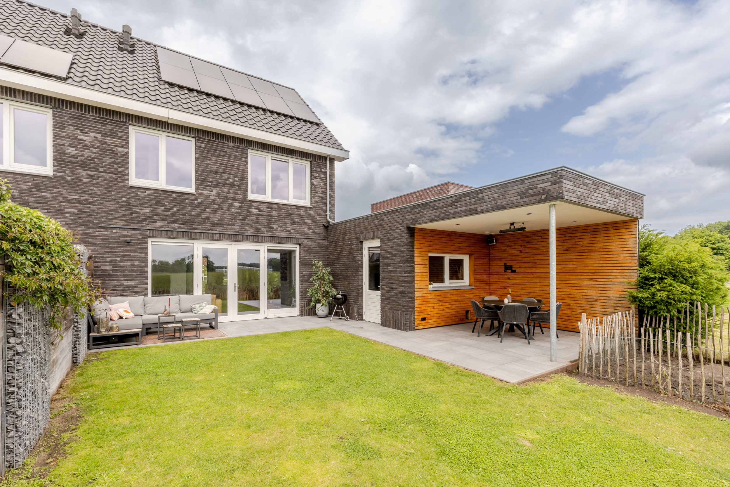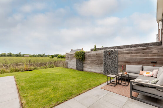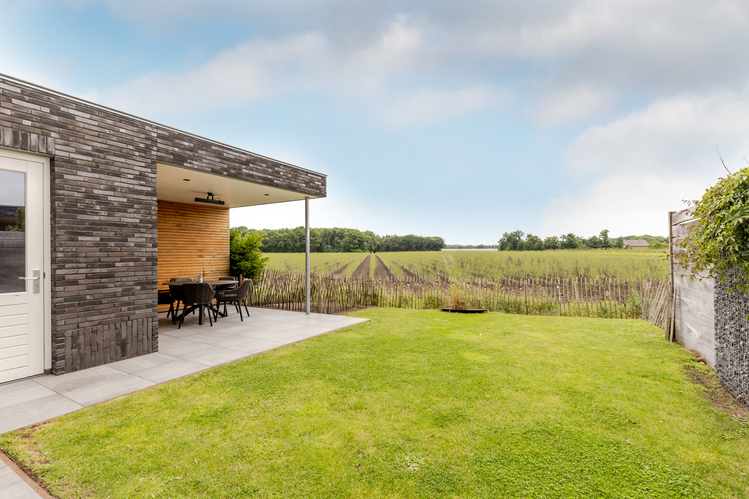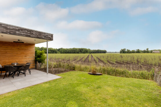 Nu we binnen hebben gezien, gaan we buiten kijken. Vanuit de woonkamer gaan we door de openslaande tuindeuren de achtertuin in. Direct achter het huis is een terras en een groot gazon. Vanaf hier heb je een prachtig uitzicht over de achtergelegen landerijen. Tijdens ons bezoek stonden er asperges op het akkerland en waren de scheuten al zichtbaar. Aan het huis is een fraaie overkapping gemaakt waar je natuurlijk heerlijk overdekt van het uitzicht kunt genieten.