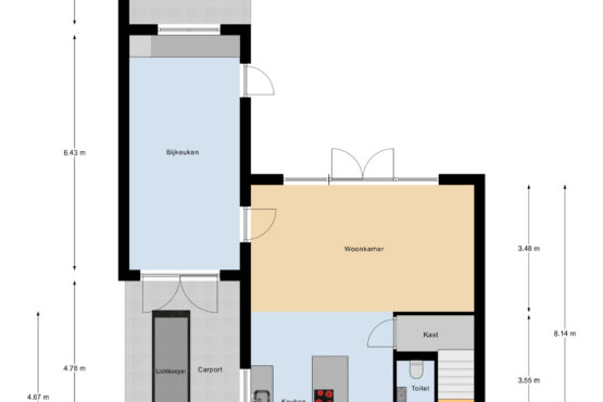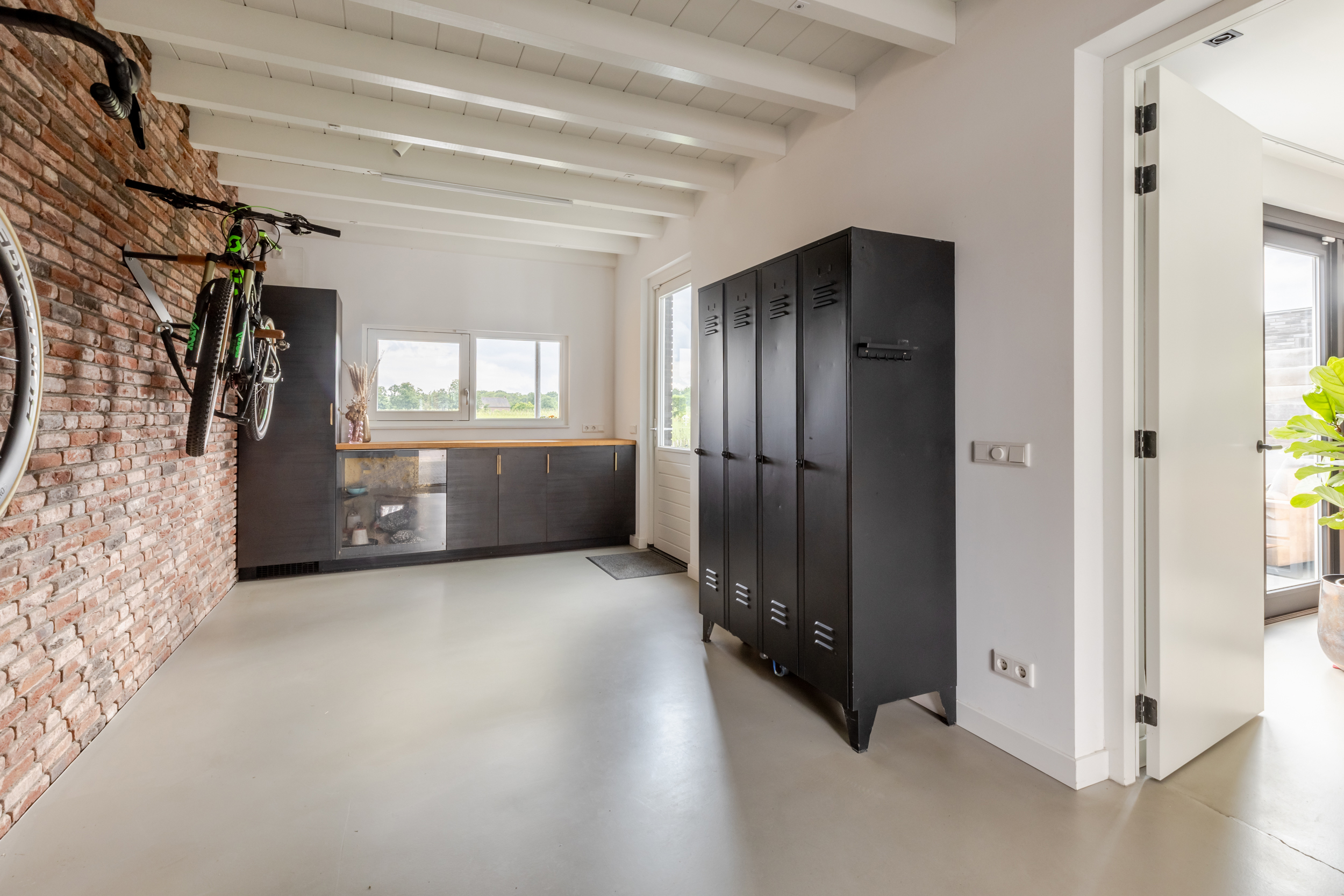 Vanuit de woonkamer kunnen we naar de inpandige multifunctionele ruimte. Ook hier zien we het hoge afwerkingsniveau terug en de gietvloer met vloerverwarming. Glad pleisterwerk op de wanden en een wand voorzien van prachtige steenstrips. Aan de voorzijde zijn openslaande deuren naar de oprit en aan de achterzijde is een pantryblok gemaakt. Wat we erg gaaf vinden is dat er een gedeelte van het keukenblok voorzien is van plexiglas, waar achter je de kippen kunt zien. Wat een leuk idee! Doordat deze ruimte is verwarmd en zo is afgewerkt, is deze ook relatief goed bruikbaar als speelkamer/praktijkruimte/kantoor.