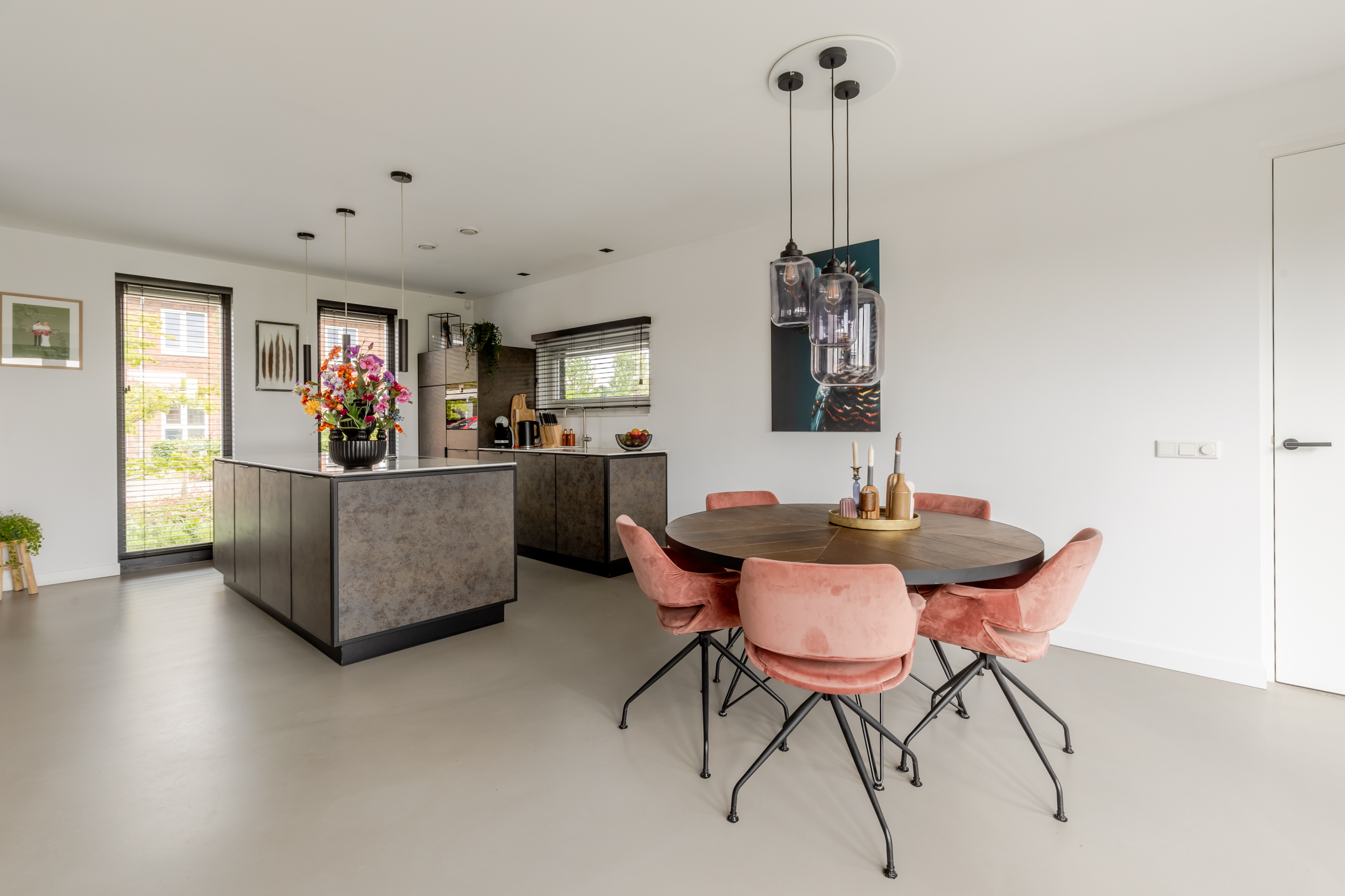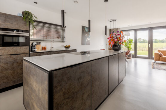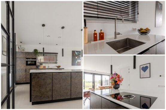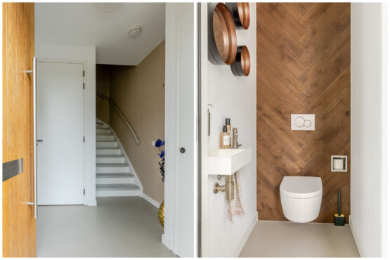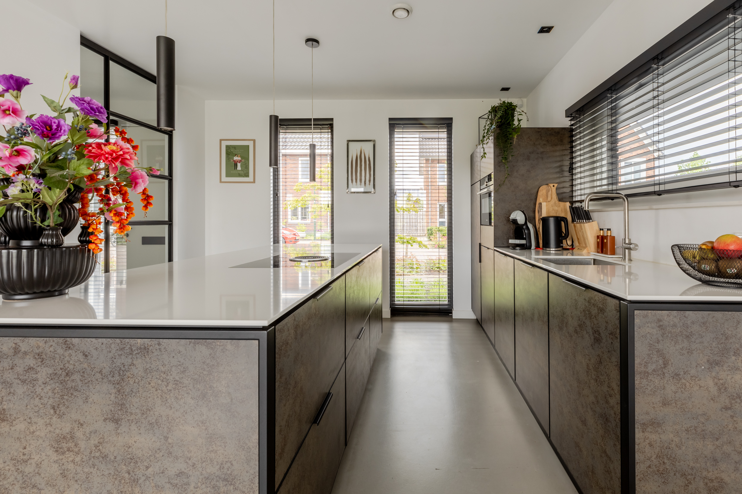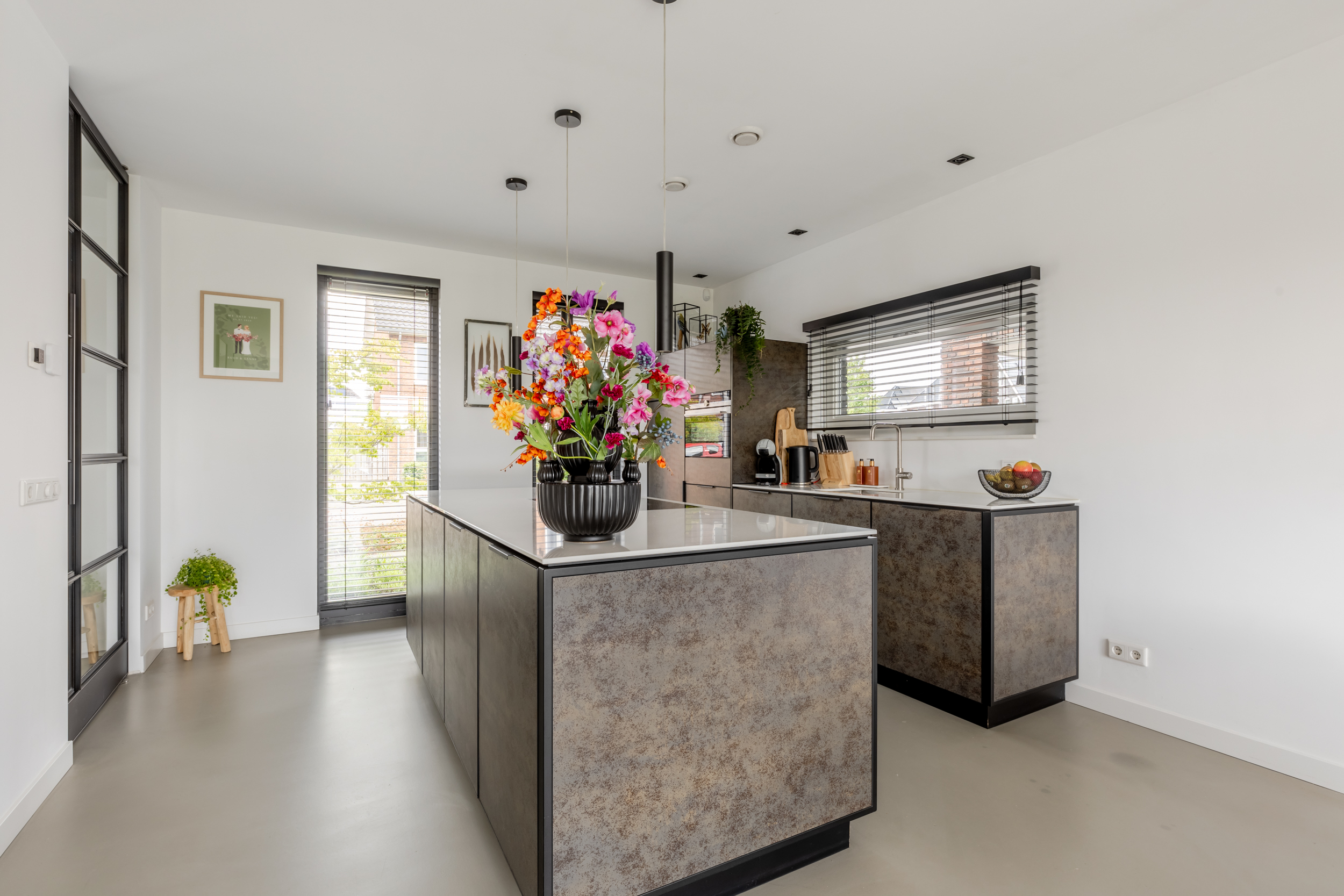 We starten onze bezichtiging in de hal. Op de vloer zien we een moderne gietvloer. Deze ligt over de gehele begane grond en is voorzien van vloerverwarming als hoofdverwarming. De fris witte plinten geven een mooi contrast. De muren en plafonds zijn glad gestuct. Direct rechts van ons is de meterkast en voor ons het toilet. Het toilet is uitgerust met een hangcloset en een houten achterwandafwerking in visgraat motief. Het hout zorgt voor een warm accent bij de moderne afwerking. Aan de wand hangt een fonteintje. Een waar pronkstuk is de stalen deur die een afscheiding vormt tussen de hal en de keuken. De moderne keuken met eiland lijkt ons een heerlijke plek om onze favoriete gerechten te bereiden. Het eiland zorgt voor veel werk en bergruimte en in het blad is de inductiekookplaat met geïntegreerde afzuiging opgenomen. Qua apparatuur is er nog een koelkast, vaatwasser en combioven aanwezig. Waar we ook blij van worden, is dat het hier een open keuken betreft, in verbinding met de woonkamer. Direct bij de keuken is een ruime trapkast. Hier bevindt zich ook de verdeelunit van de vloerverwarming. De muren op deze woonlaag zijn glad gestuct, net als het plafond waarin diverse inbouwspots zijn geplaatst. Vanuit de keuken, eethoek en zithoek heb je door de grote pui met openslaande deuren een geweldig uitzicht over de tuin en de daarachter gelegen landerijen. Net als in de hal, zien we ook in deze ruimte houten binnendeur kozijnen met stompe deuren voorzien van een deurbeslag in een moderne, zwarte look. Daar is goed over nagedacht bij de bouw, het zijn de details die vaak het verschil maken!