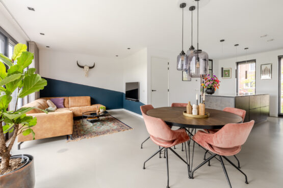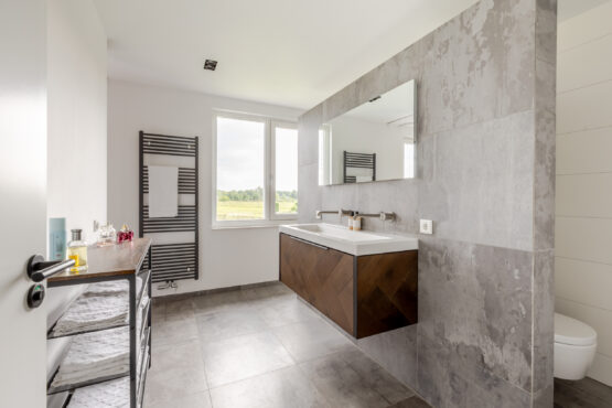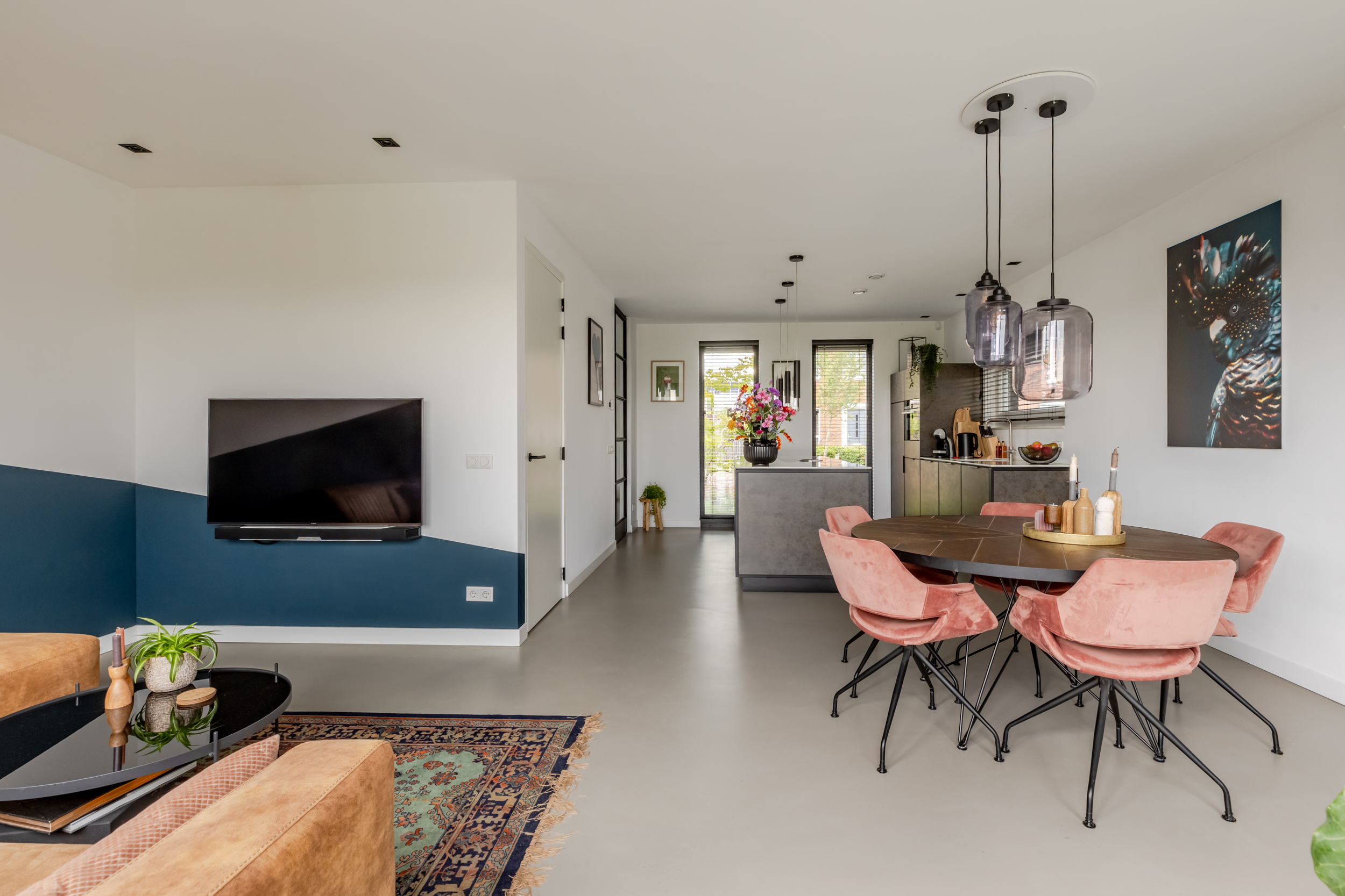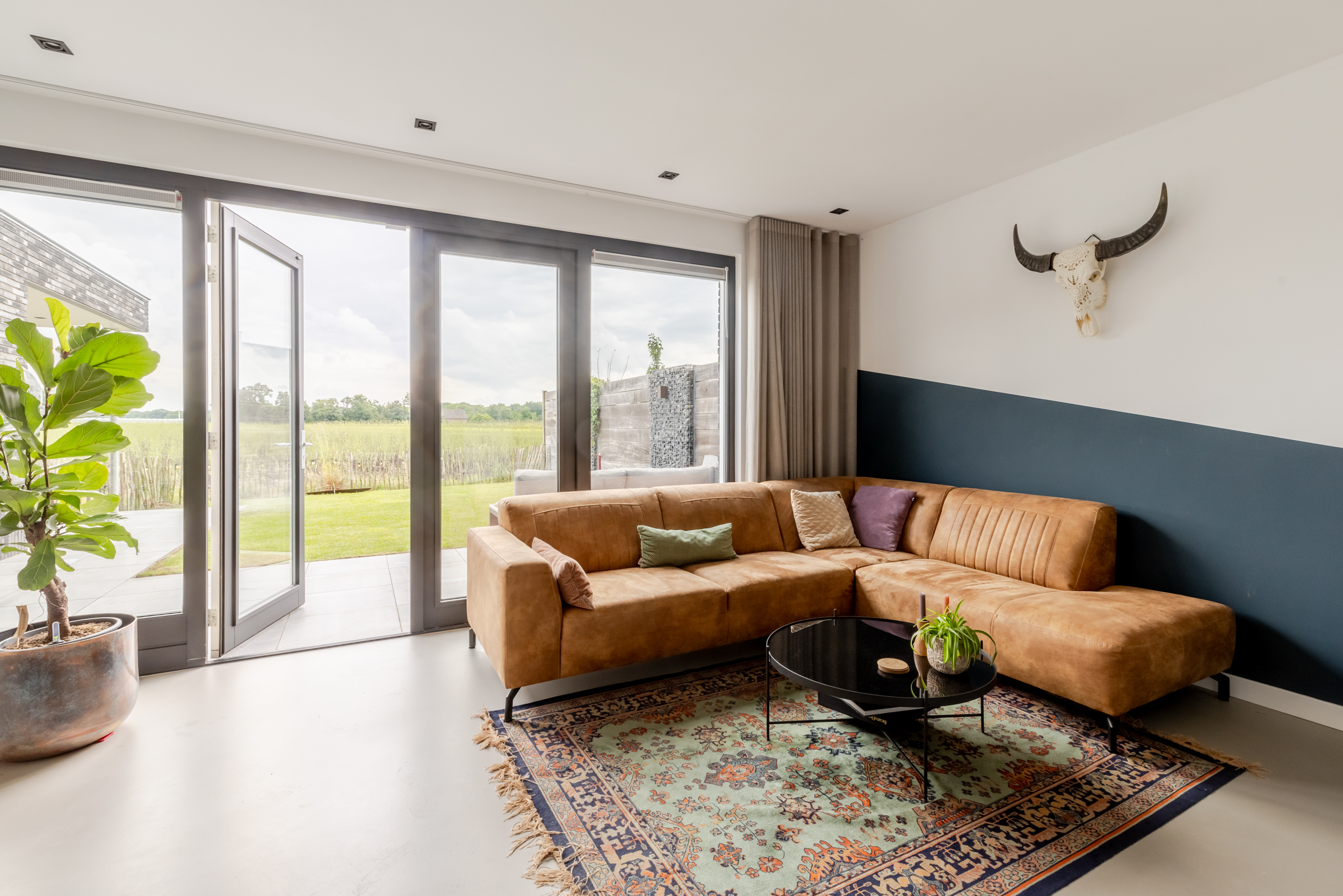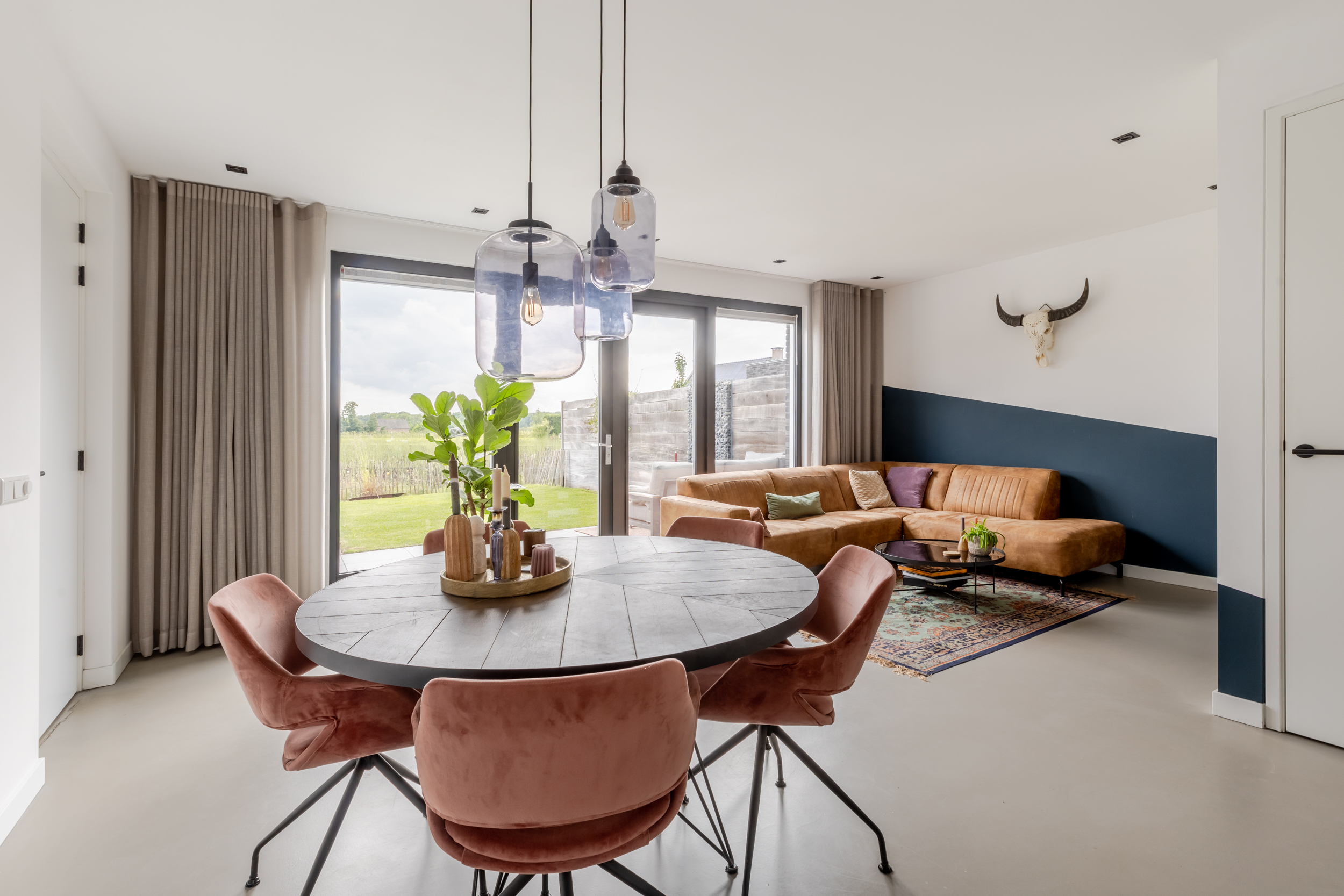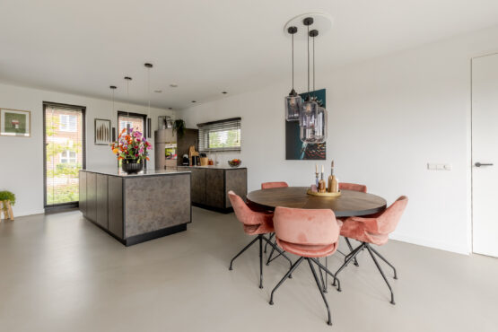 We starten onze bezichtiging in de hal. Op de vloer zien we een moderne gietvloer. Deze ligt over de gehele begane grond en is voorzien van vloerverwarming als hoofdverwarming. De fris witte plinten geven een mooi contrast. De muren en plafonds zijn glad gestuct. Direct rechts van ons is de meterkast en voor ons het toilet. Het toilet is uitgerust met een hangcloset en een houten achterwandafwerking in visgraat motief. Het hout zorgt voor een warm accent bij de moderne afwerking. Aan de wand hangt een fonteintje. Een waar pronkstuk is de stalen deur die een afscheiding vormt tussen de hal en de keuken. De moderne keuken met eiland lijkt ons een heerlijke plek om onze favoriete gerechten te bereiden. Het eiland zorgt voor veel werk en bergruimte en in het blad is de inductiekookplaat met geïntegreerde afzuiging opgenomen. Qua apparatuur is er nog een koelkast, vaatwasser en combioven aanwezig. Waar we ook blij van worden, is dat het hier een open keuken betreft, in verbinding met de woonkamer. Direct bij de keuken is een ruime trapkast. Hier bevindt zich ook de verdeelunit van de vloerverwarming. De muren op deze woonlaag zijn glad gestuct, net als het plafond waarin diverse inbouwspots zijn geplaatst. Vanuit de keuken, eethoek en zithoek heb je door de grote pui met openslaande deuren een geweldig uitzicht over de tuin en de daarachter gelegen landerijen. Net als in de hal, zien we ook in deze ruimte houten binnendeur kozijnen met stompe deuren voorzien van een deurbeslag in een moderne, zwarte look. Daar is goed over nagedacht bij de bouw, het zijn de details die vaak het verschil maken!