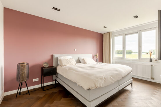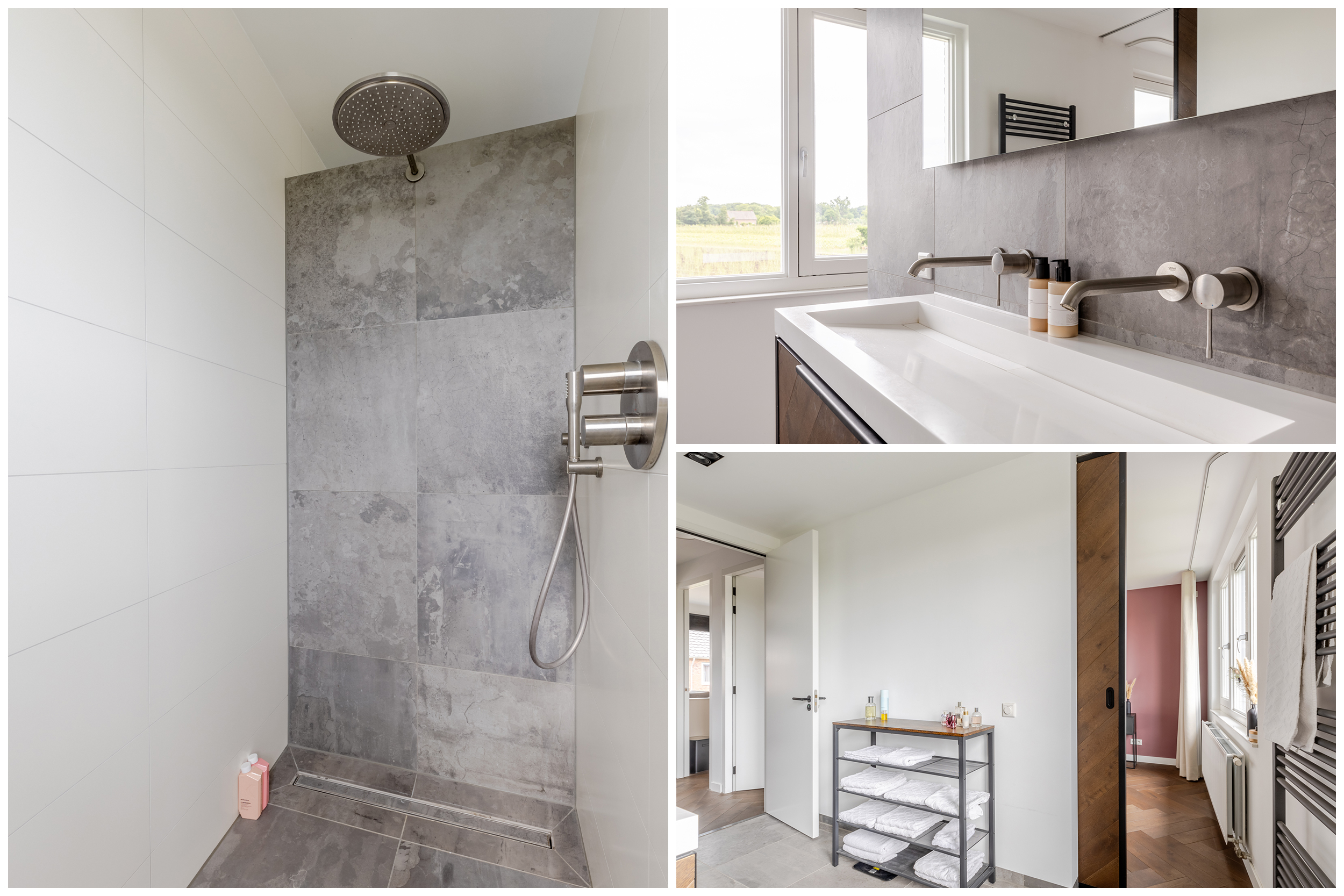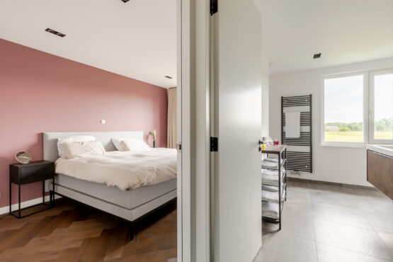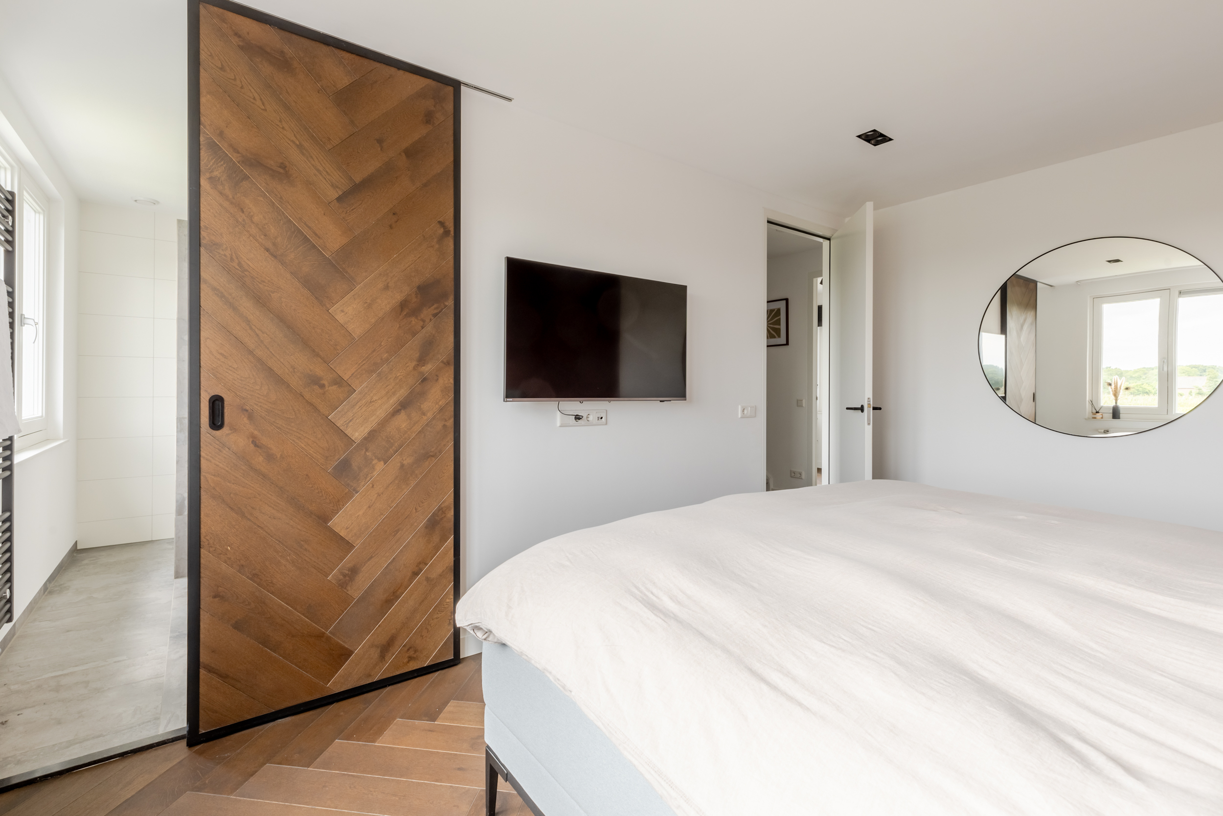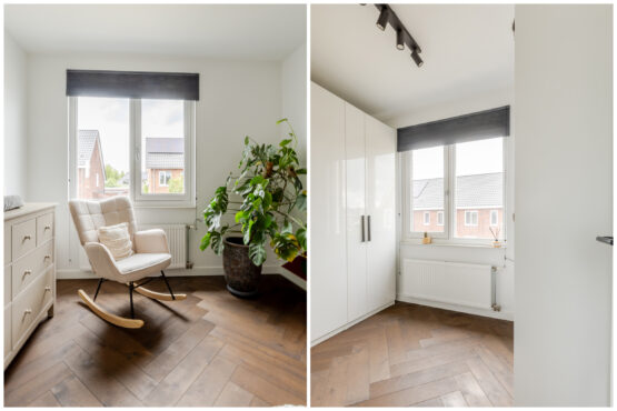We lopen terug naar de hal en begeven ons via de mooie witte trap naar de 1e verdieping. Op de 1e verdieping zijn er 3 slaapkamers en de badkamer. Alle slaapkamers en de overloop hebben een sfeervolle eikenhouten vloerafwerking in visgraatmotief. Ook hier zijn we de glad gestucte wanden en plafonds met inbouwspots terug en de houten kozijnen met stompe deuren en zwart beslag. Aan de voorzijde van het huis zijn 2 slaapkamers, waarvan de kleinste nu in gebruik is als kastenkamer, maar ook een prima slaapkamer of werkplek zou kunnen zijn. De “master bedroom” is aan de achterzijde en door de ramen heb je hier een prachtig uitzicht. Een mooie schuifdeur scheid hier de slaapkamer en de badkamer. Dat is fijn, je kunt hier dus direct vanuit de slaapkamer naar de badkamer! De ruime badkamer is erg praktisch ingedeeld met een wand in het midden, waarachter een inloopdouche is gemaakt en een toilet. Tegen de wand hangt een meubel met wastafel. Het meubel is, net als de schuifdeur, afgewerkt met dezelfde eiken vloerdelen als op de vloer aangebracht zijn. Aan een wand hangt een designradiator en de tegelvloer is voorzien van comfortabele vloerverwarming, wat uiteraard erg aangenaam is in de badkamer. De badkamer is ook direct vanaf de overloop te bereiken.