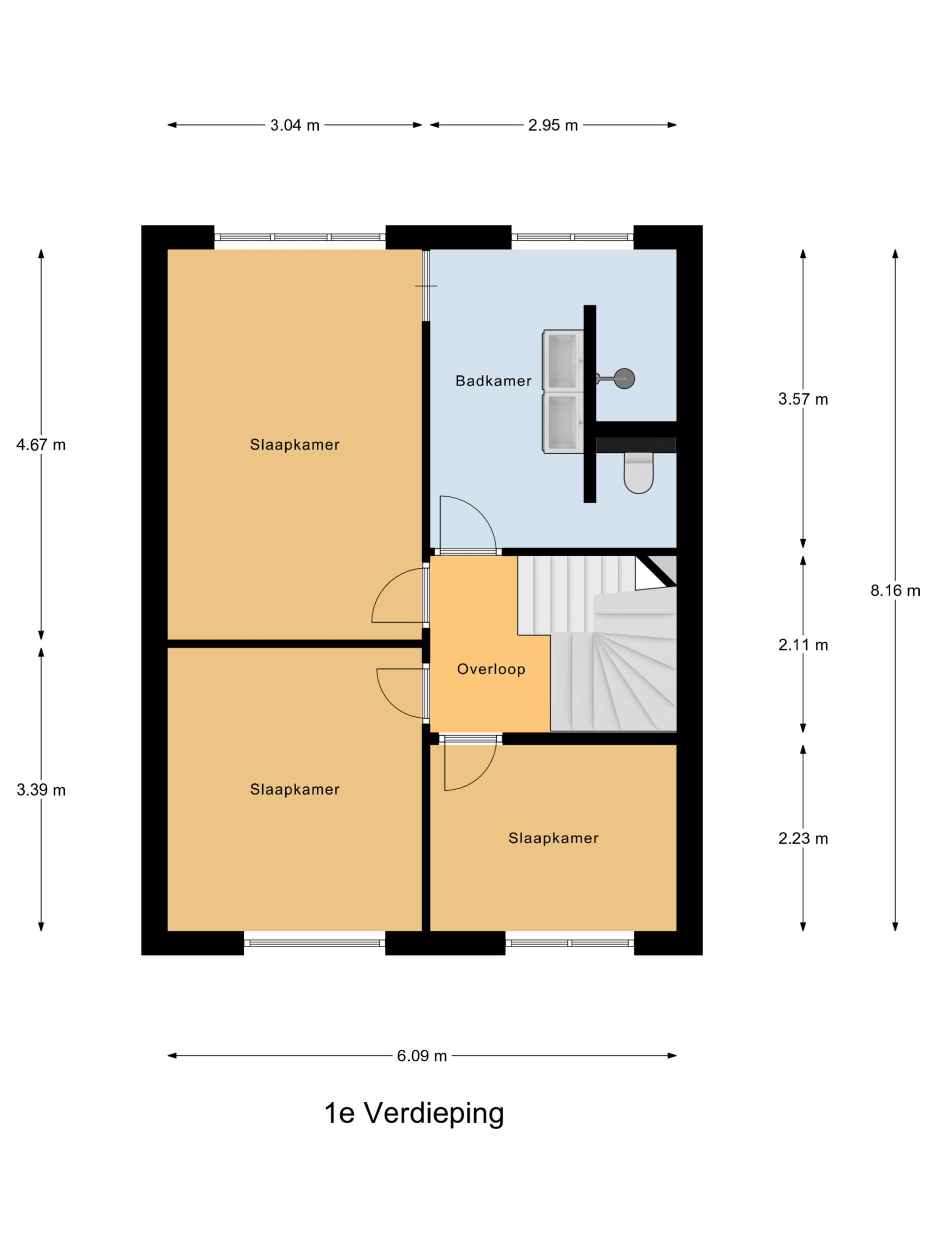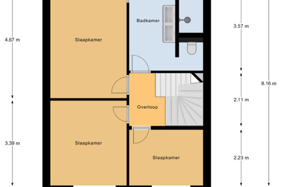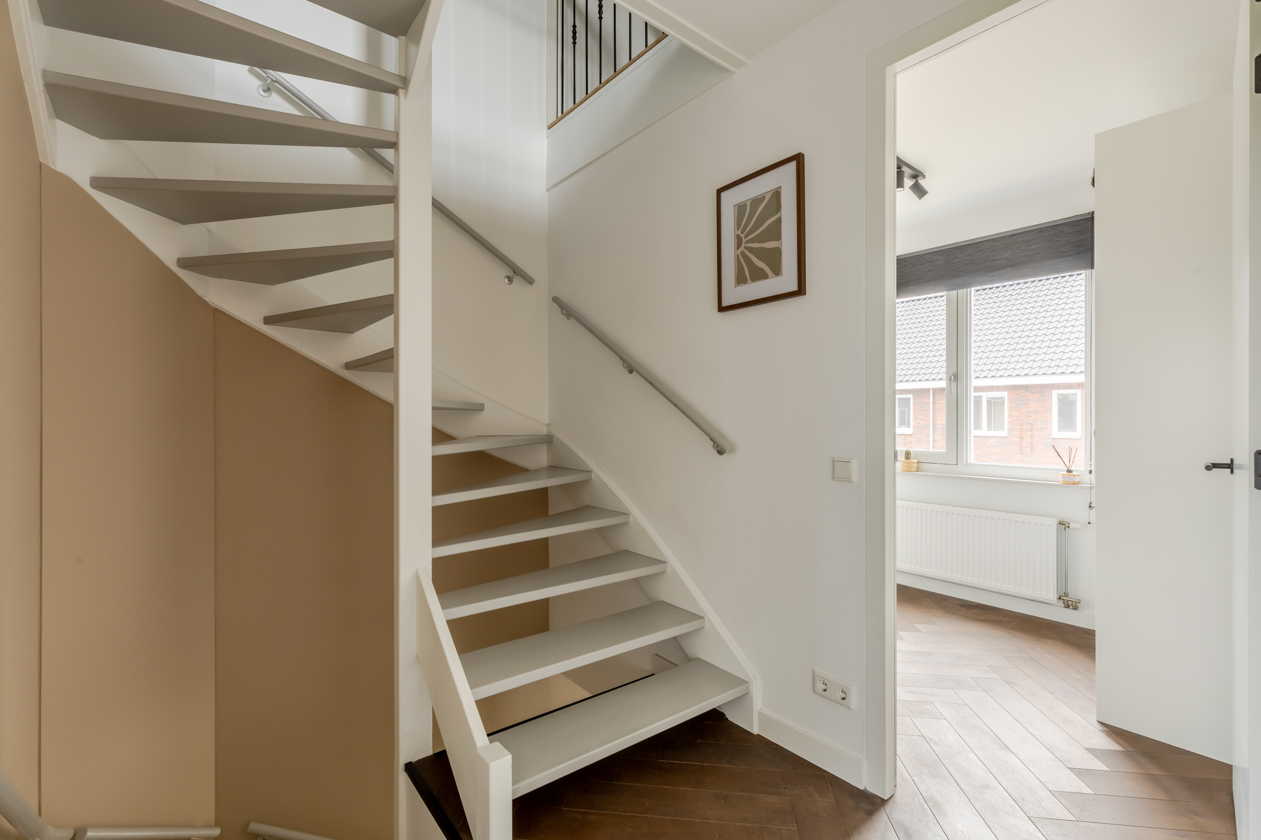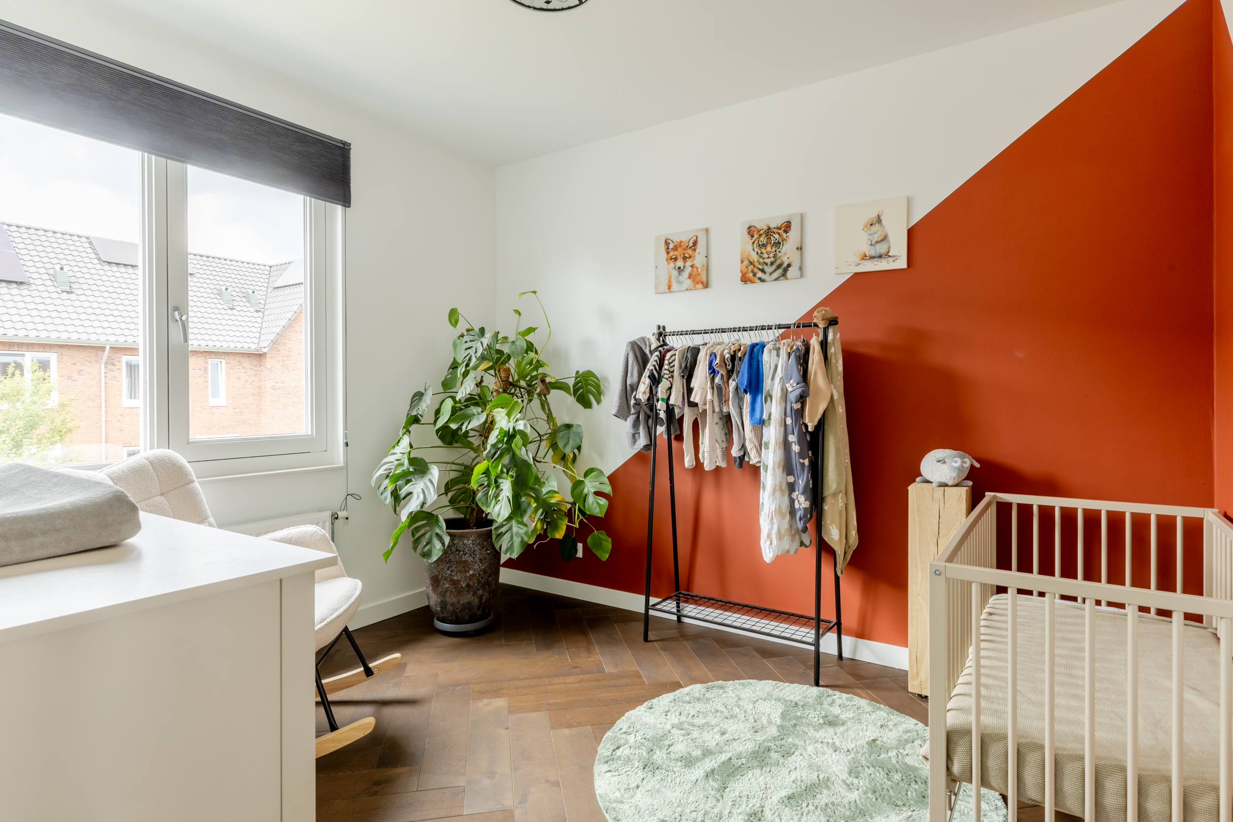 We lopen terug naar de hal en begeven ons via de mooie witte trap naar de 1e verdieping. Op de 1e verdieping zijn er 3 slaapkamers en de badkamer. Alle slaapkamers en de overloop hebben een sfeervolle eikenhouten vloerafwerking in visgraatmotief. Ook hier zijn we de glad gestucte wanden en plafonds met inbouwspots terug en de houten kozijnen met stompe deuren en zwart beslag. Aan de voorzijde van het huis zijn 2 slaapkamers, waarvan de kleinste nu in gebruik is als kastenkamer, maar ook een prima slaapkamer of werkplek zou kunnen zijn. De “master bedroom” is aan de achterzijde en door de ramen heb je hier een prachtig uitzicht. Een mooie schuifdeur scheid hier de slaapkamer en de badkamer. Dat is fijn, je kunt hier dus direct vanuit de slaapkamer naar de badkamer! De ruime badkamer is erg praktisch ingedeeld met een wand in het midden, waarachter een inloopdouche is gemaakt en een toilet. Tegen de wand hangt een meubel met wastafel. Het meubel is, net als de schuifdeur, afgewerkt met dezelfde eiken vloerdelen als op de vloer aangebracht zijn. Aan een wand hangt een designradiator en de tegelvloer is voorzien van comfortabele vloerverwarming, wat uiteraard erg aangenaam is in de badkamer. De badkamer is ook direct vanaf de overloop te bereiken.