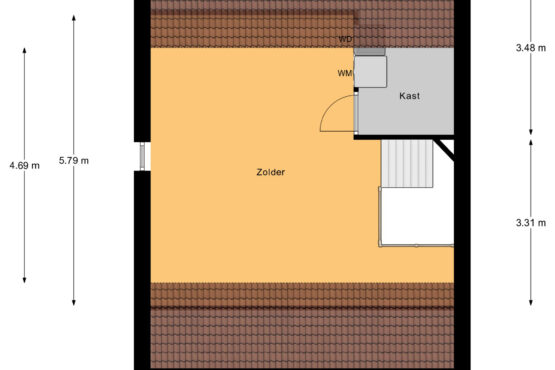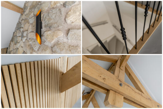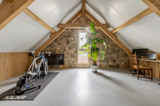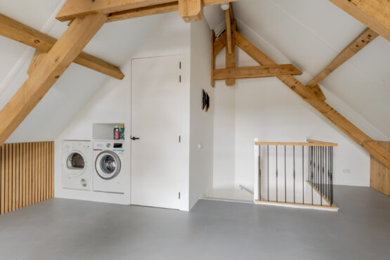 Met een vaste trap gaan we naar de 2e verdieping. Wat is dit een mooie ruimte! Er is een eiken houten spantconstructie geplaatst en er zijn diverse houten accenten aanwezig, zoals de knieschotten, maar ook op het spijlenhekwerk. Eyecatcher is de wand van flagstones, helemaal van nu, net als de vloerafwerking. De zolder is nu een open ruimte die uiteraard voor meerdere doeleinden geschikt is. Zo zou je hier eventueel een 4e slaapkamer kunnen maken. De CV-ketel en de ventilatie-unit zijn mooi uit het zicht in een kast en de wasapparatuur kunnen hier strak in de wand opgenomen worden.