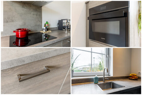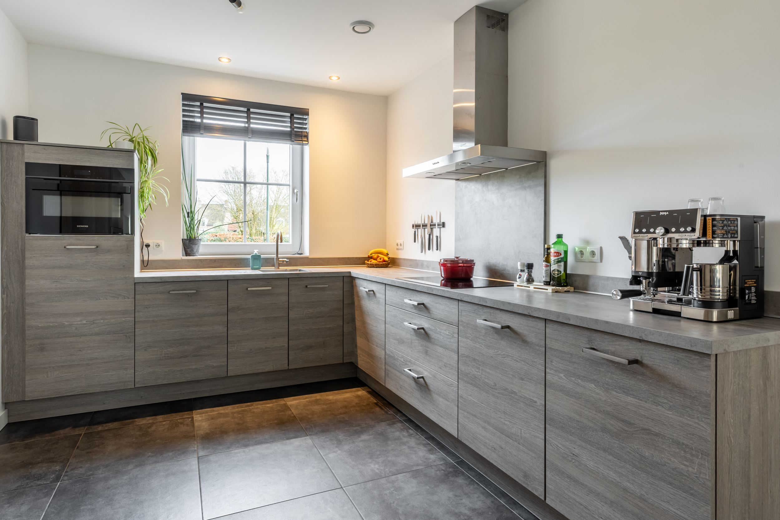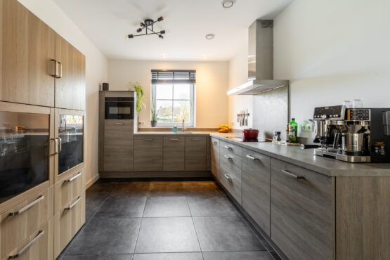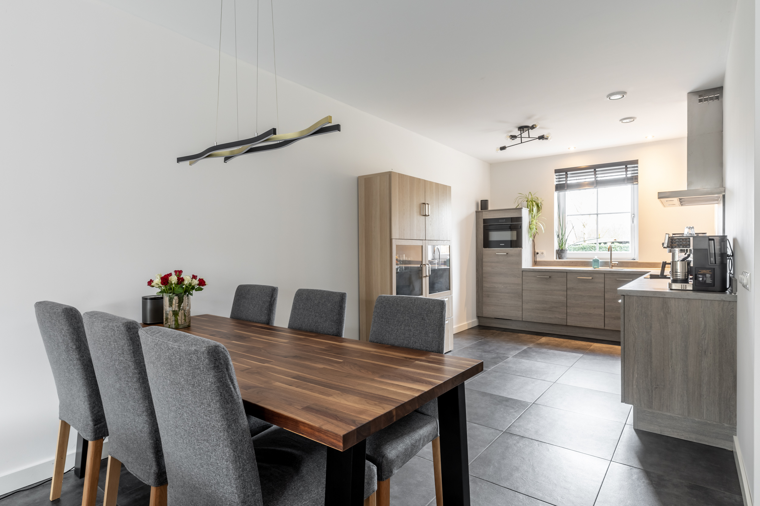 Wat een fijne ruimte! We zien rechts van ons de eettafel. Links is een trapkast met veel bergruimte en de unit van de vloerverwarming. Draaien we naar rechts dan wacht ons de keuken. Deze is aan de voorzijde van de woning. De afwerking is in een moderne houtlook en een kunststof werkblad. Het werkblad is van een flink formaat. Koken doen we hier op inductie en daarboven hangt een RVS-afzuigkap (recirculatie). Buiten de genoemde apparatuur is er een koelkast, vaatwasser en een combioven magnetron. De zithoek is aan de achterzijde van de woning en biedt plaats aan een groot bankstel. Er is een schuifpui en een loopdeur naar de achtertuin.