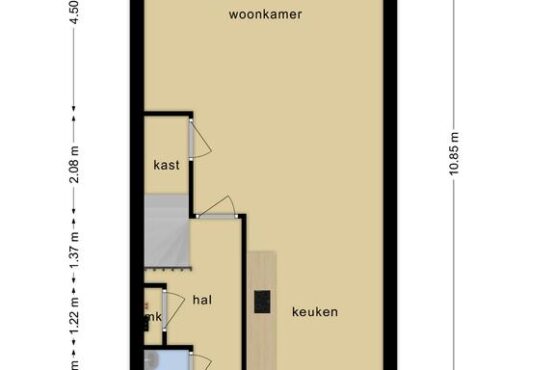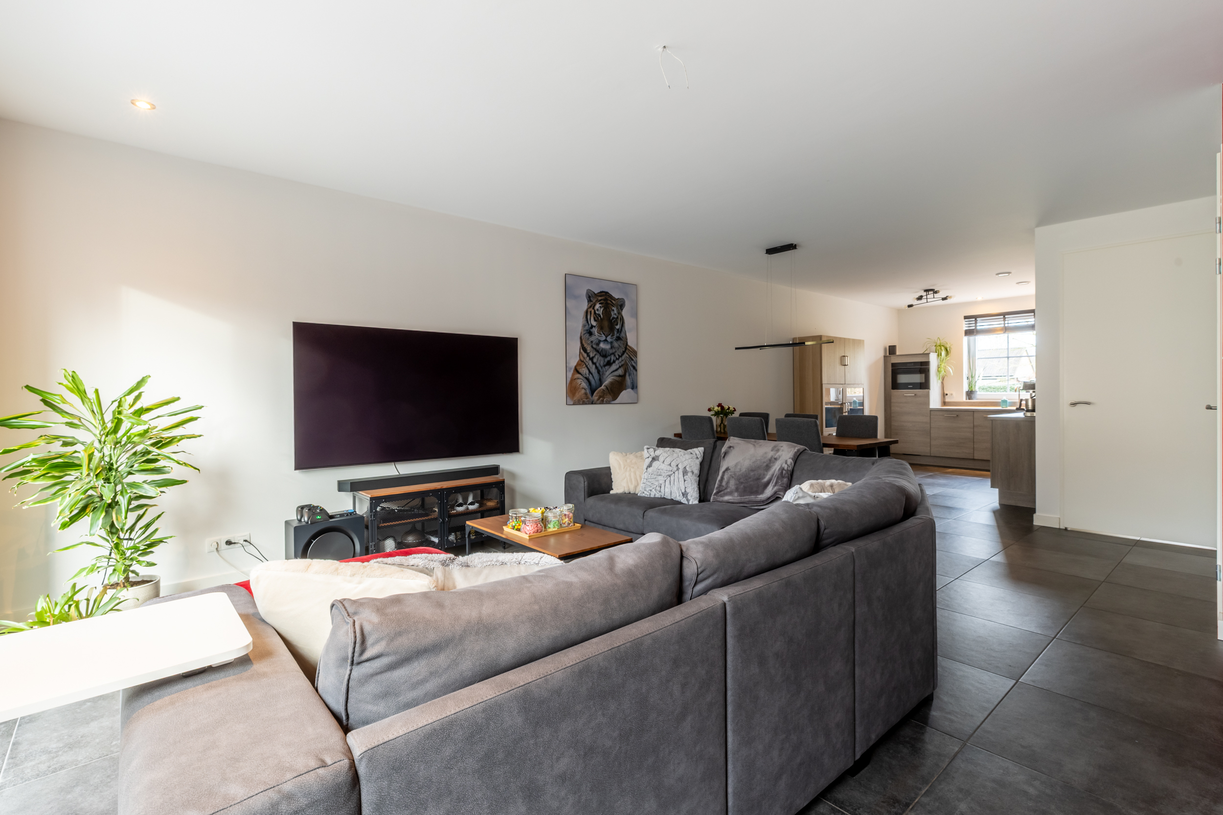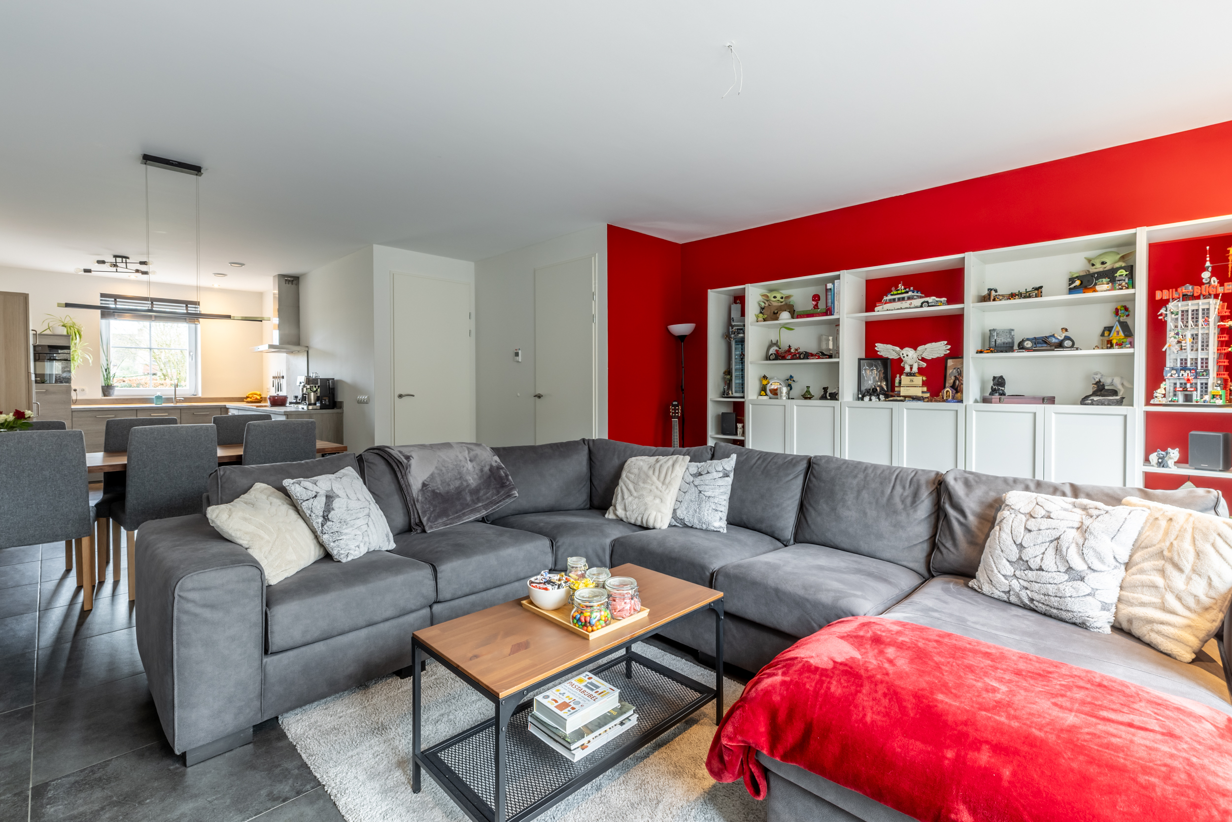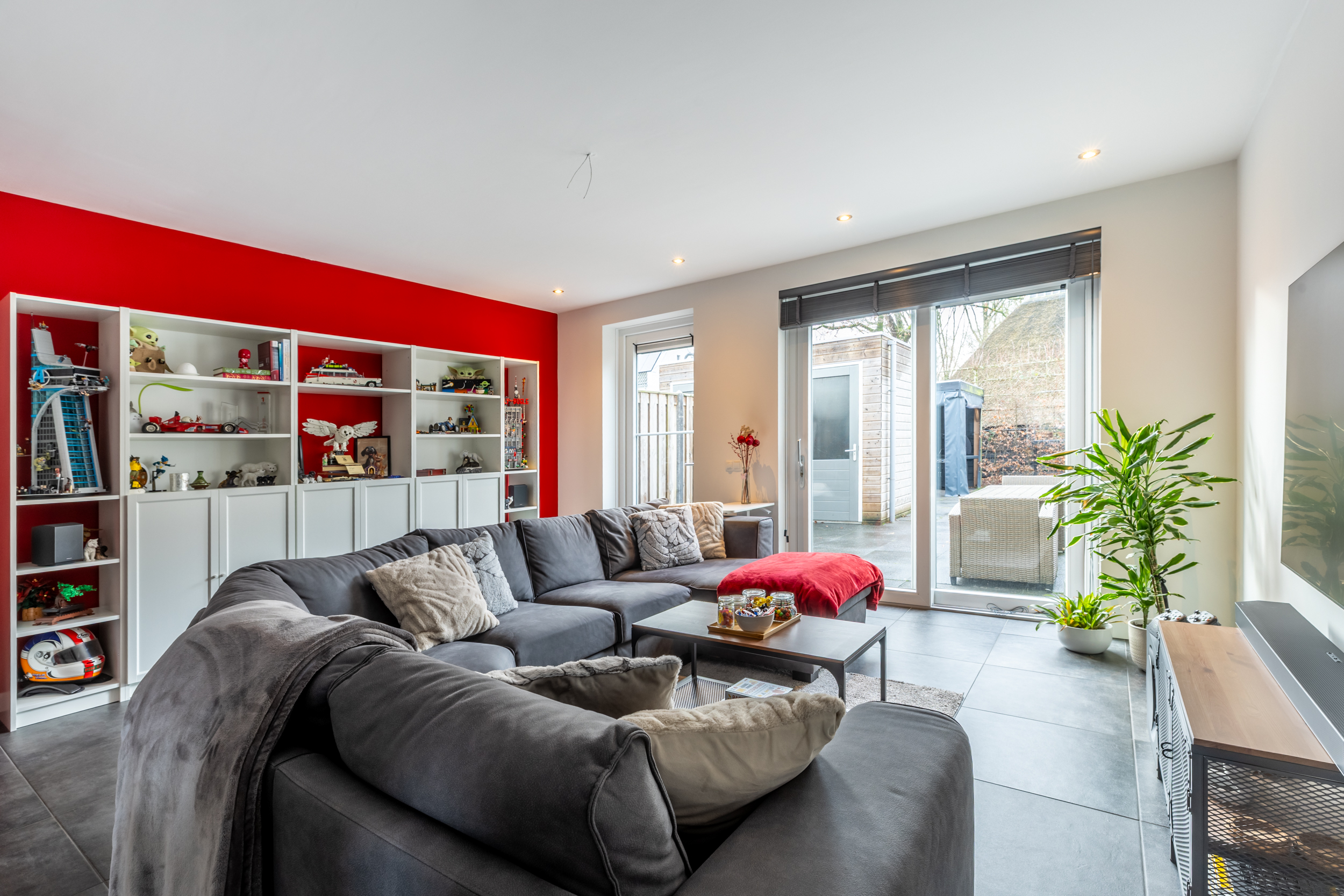 Wat een fijne ruimte! We zien rechts van ons de eettafel. Links is een trapkast met veel bergruimte en de unit van de vloerverwarming. Draaien we naar rechts dan wacht ons de keuken. Deze is aan de voorzijde van de woning. De afwerking is in een moderne houtlook en een kunststof werkblad. Het werkblad is van een flink formaat. Koken doen we hier op inductie en daarboven hangt een RVS-afzuigkap (recirculatie). Buiten de genoemde apparatuur is er een koelkast, vaatwasser en een combioven magnetron. De zithoek is aan de achterzijde van de woning en biedt plaats aan een groot bankstel. Er is een schuifpui en een loopdeur naar de achtertuin.