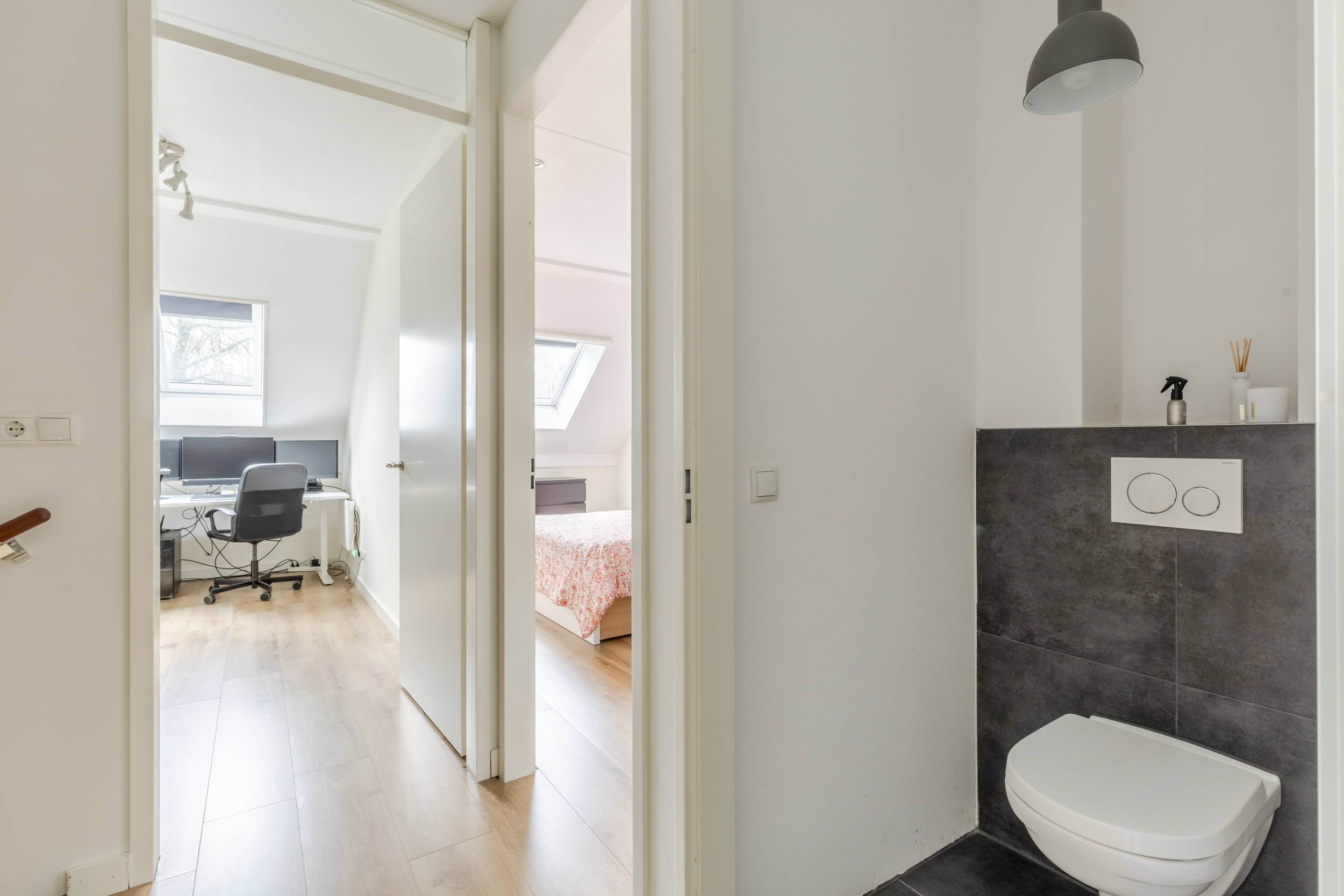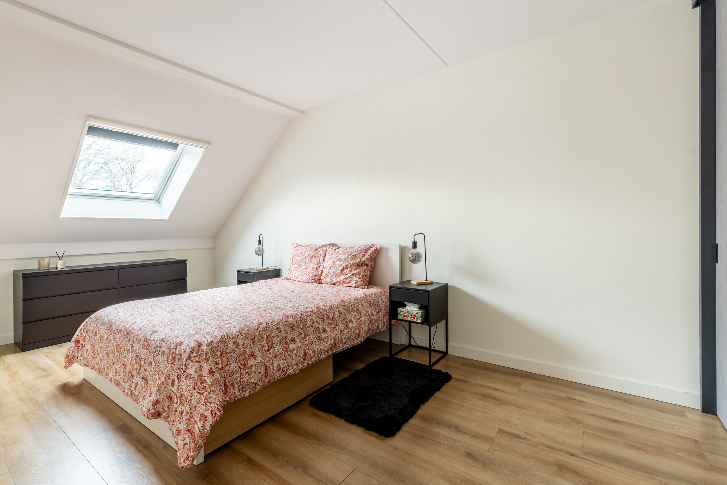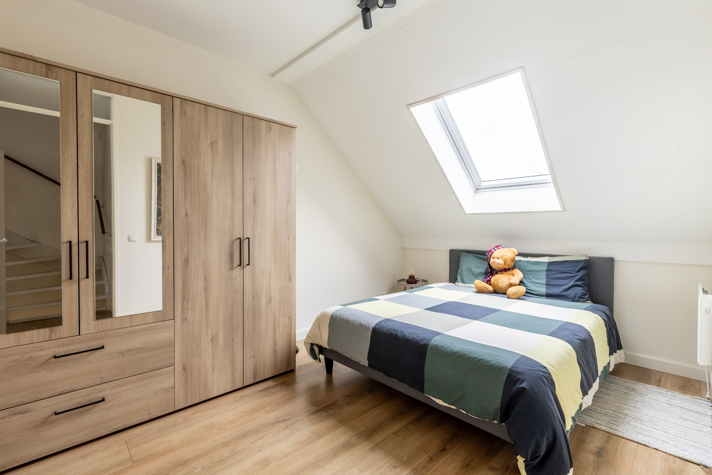 Op de 1e verdieping zijn er 3 slaapkamers, een badkamer en een toilet. De grootste slaapkamer heeft een inbouwkast. Alle slaapkamers hebben een dakraam. De badkamer is compleet met een wastafel in een meubel, een inloopdouche en een ligbad. Er is een separaat toilet, dat vanaf de overloop toegankelijk is. De slaapkamers en de badkamer hebben elektrische radiatoren.