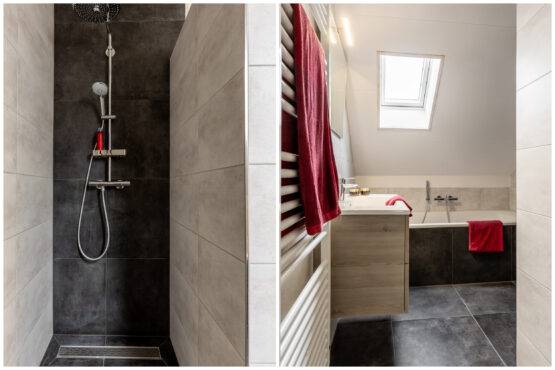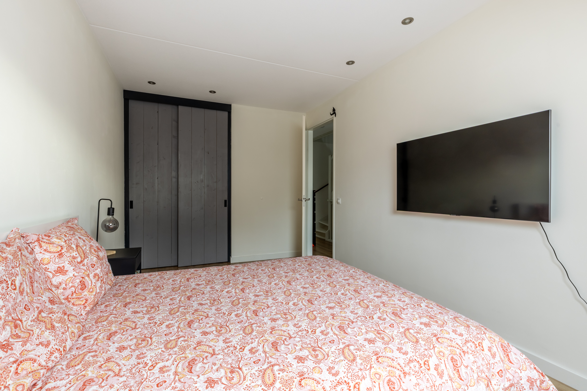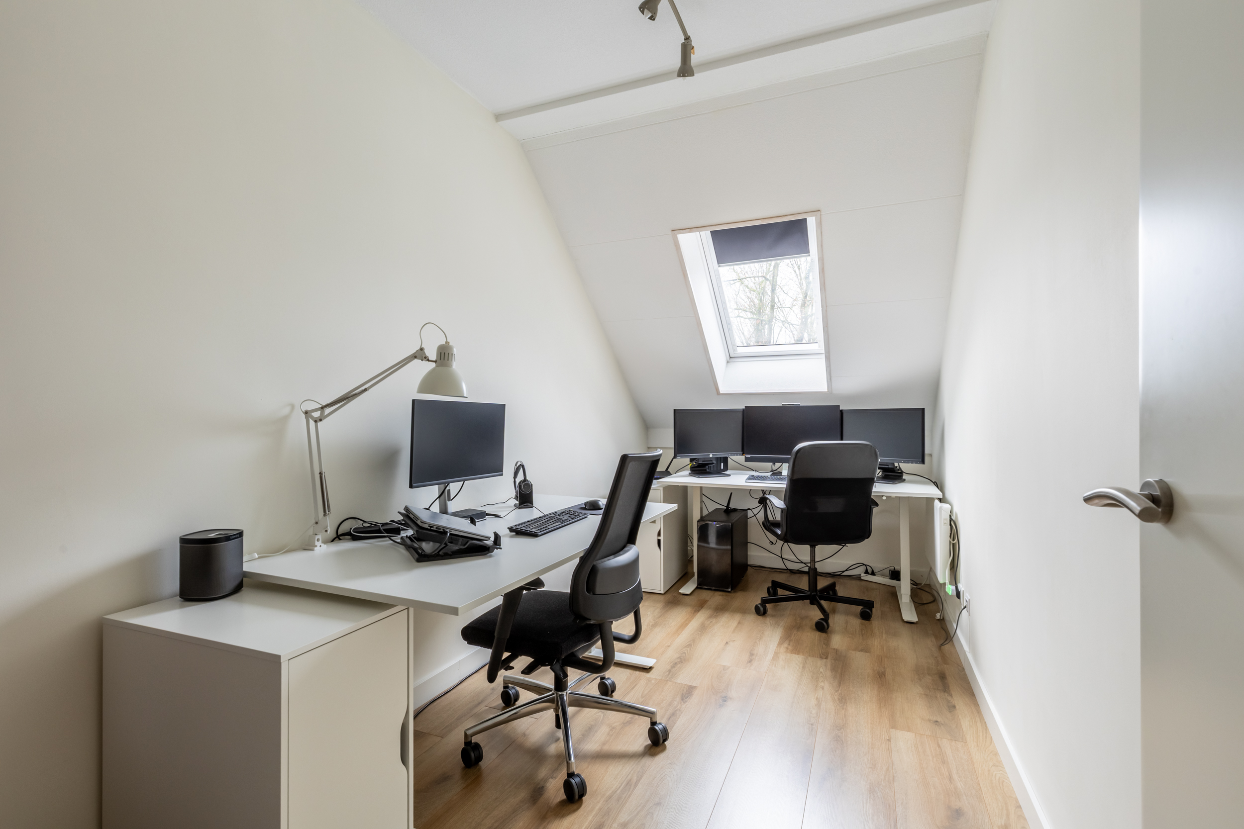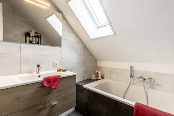 Op de 1e verdieping zijn er 3 slaapkamers, een badkamer en een toilet. De grootste slaapkamer heeft een inbouwkast. Alle slaapkamers hebben een dakraam. De badkamer is compleet met een wastafel in een meubel, een inloopdouche en een ligbad. Er is een separaat toilet, dat vanaf de overloop toegankelijk is. De slaapkamers en de badkamer hebben elektrische radiatoren.