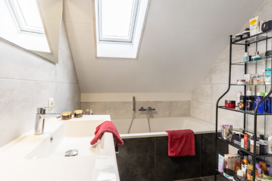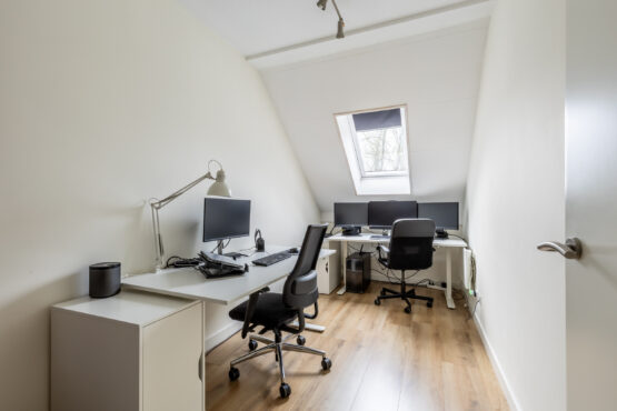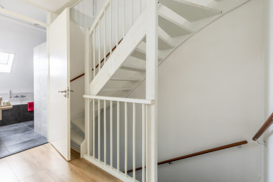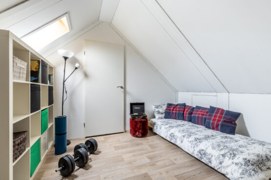 Met een vaste trap gaan we naar de 2e verdieping. Hier zien we een open ruimte met extra bergruimte onder de kapschuinte. Voor ons is een deur met hierachter de technische ruimte. Hier zijn de aansluitingen voor de wasapparatuur en hangt de warmtepomp, de warm water boiler en de omvormer van de zonnepanelen. TIP: doordat deze verdieping net te weinig daglicht heeft, wordt deze gerekend als “overige inpandige ruimte”. Op het moment dat je meer dan 0,5m2 daglicht aanbrengt, kun je de 14m2 overige inpandige ruimte bij het woonoppervlak optellen! Je kunt hier dan nog prima een extra slaapkamer maken of bijvoorbeeld een werkplek.