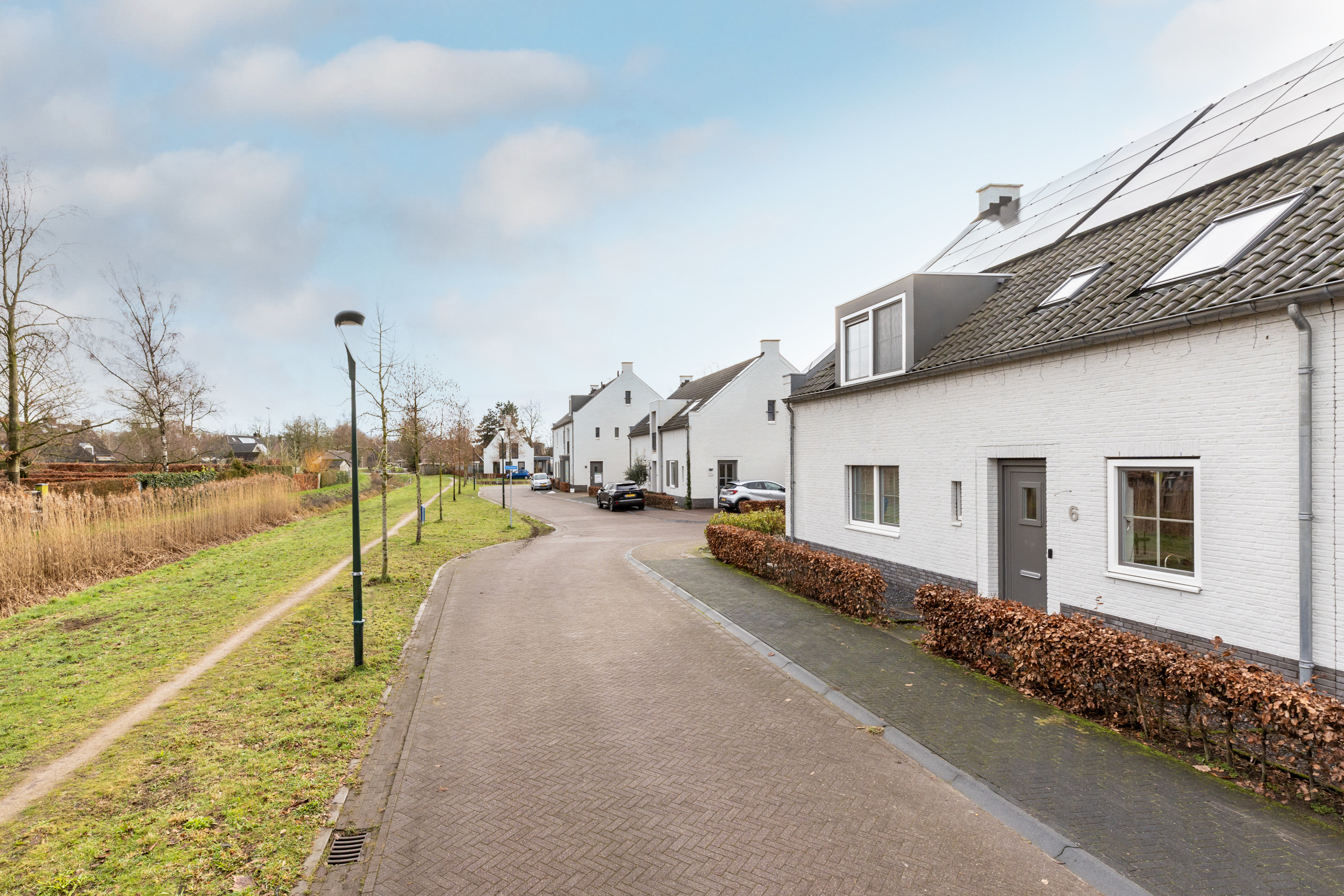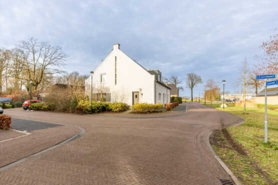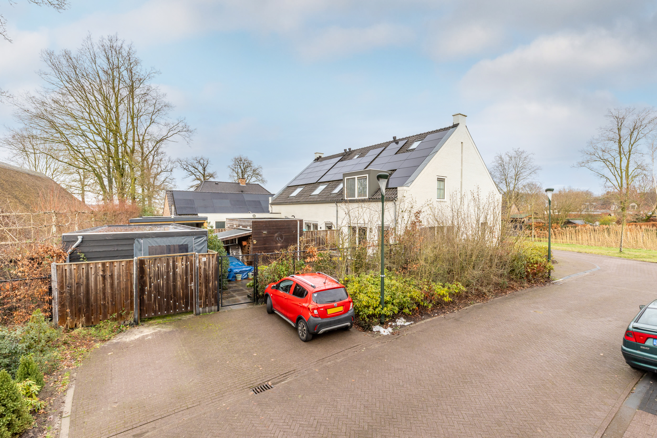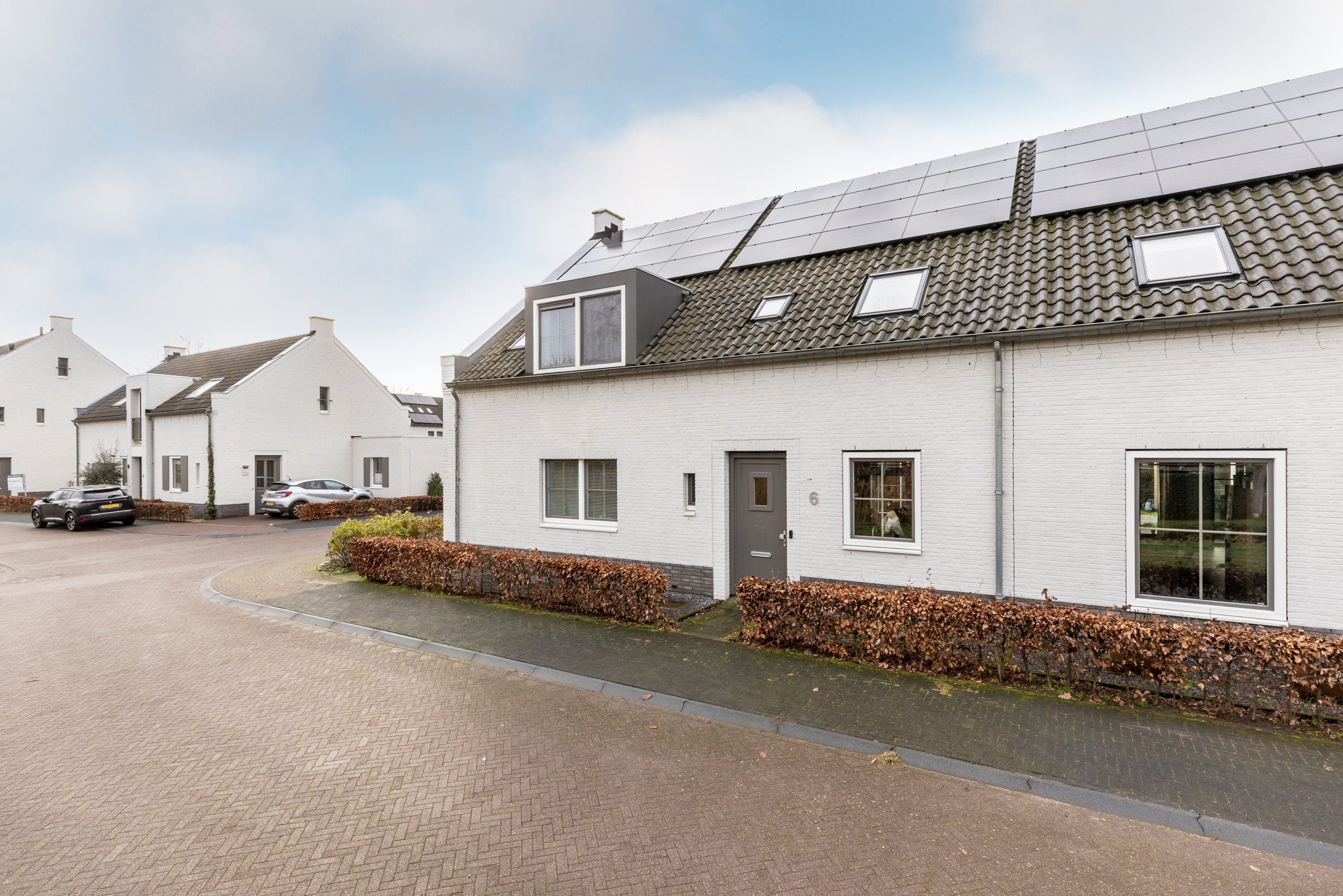 We rijden de Evershoef in en genieten van de ruime en groen opzet. Aan onze linkerzijde is een groene zone met een mooie watergang. Het huis dat we gaan bekijken ligt aan onze rechterzijde en heeft een mooi uitzicht op al dit groen. Het betreft een tussenwoning die architectonisch mooi is opgenomen tussen 2 hoekwoningen. Het geheel oogt als een grote vrijstaande woning. We zien op het dak 12 zonnepanelen liggen.