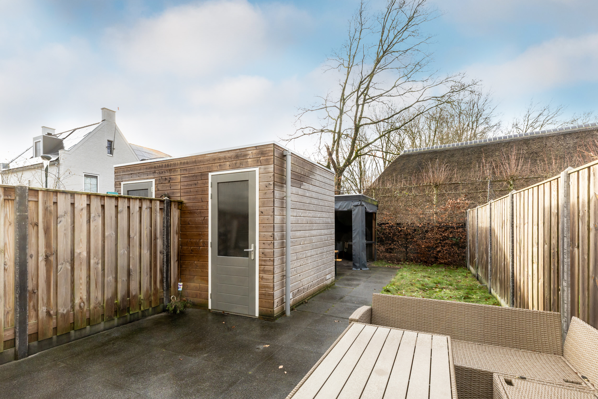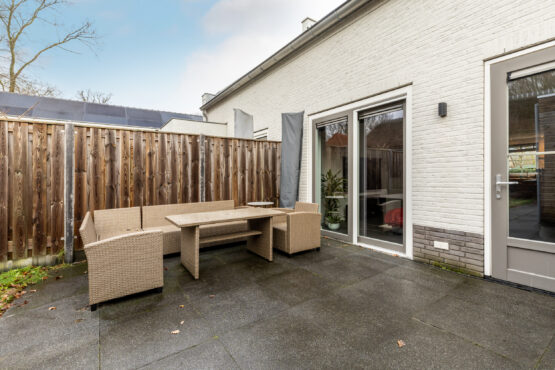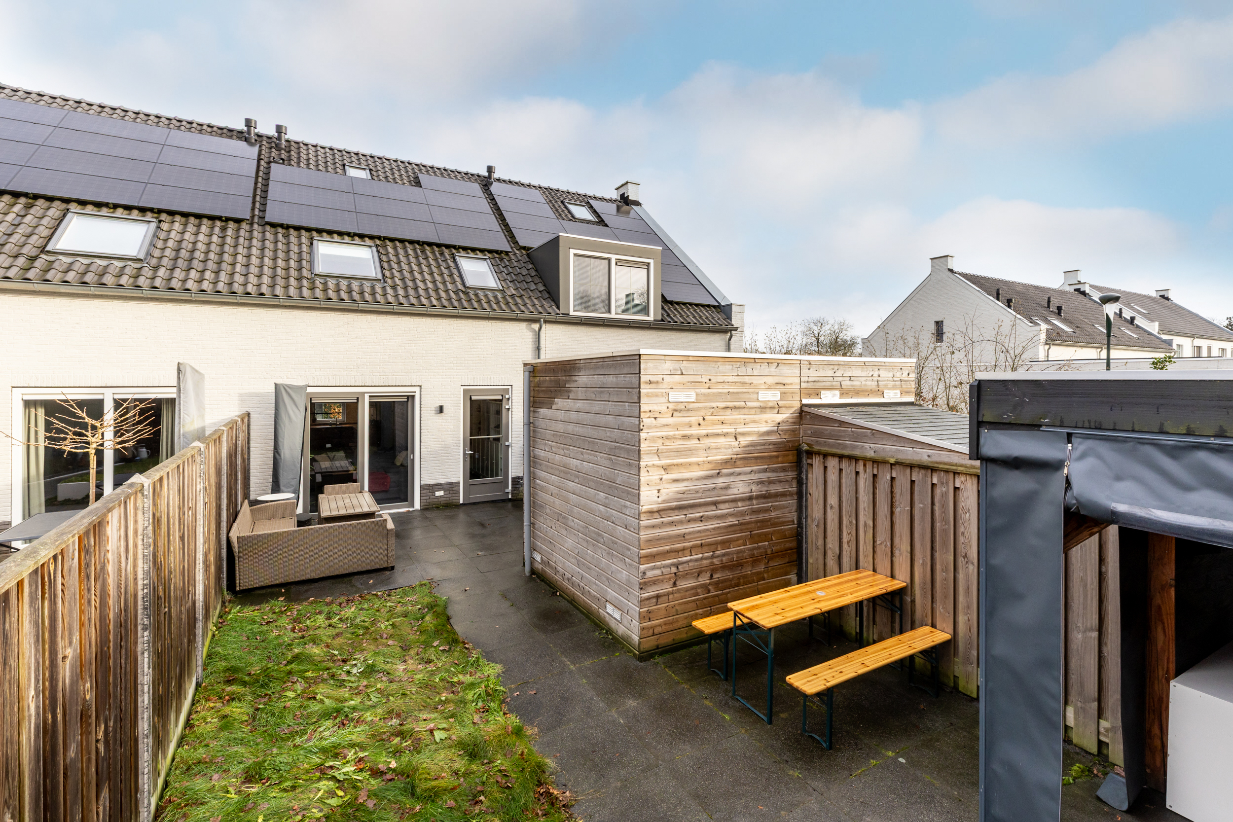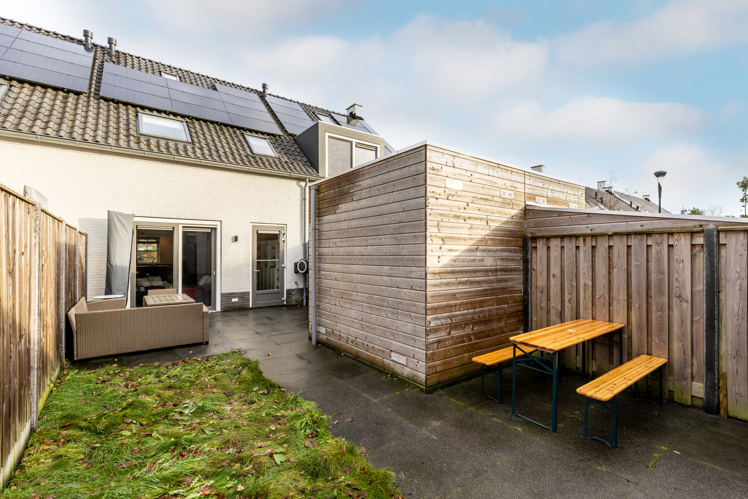 Nu we het huis hebben gezien gaan we buiten kijken. We gebruiken de loopdeur in de woonkamer en gaan naar de achtertuin. Direct achter het huis is een terras. We zien ook een houten fietsenberging. We lopen door naar de achterzijde van de tuin en draaien ons om naar het huis. Hier zien we dat aan deze zijde van het dak nog eens 10 zonnepanelen liggen, wat het totaal op 22 stuks maakt!
