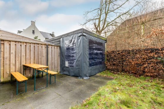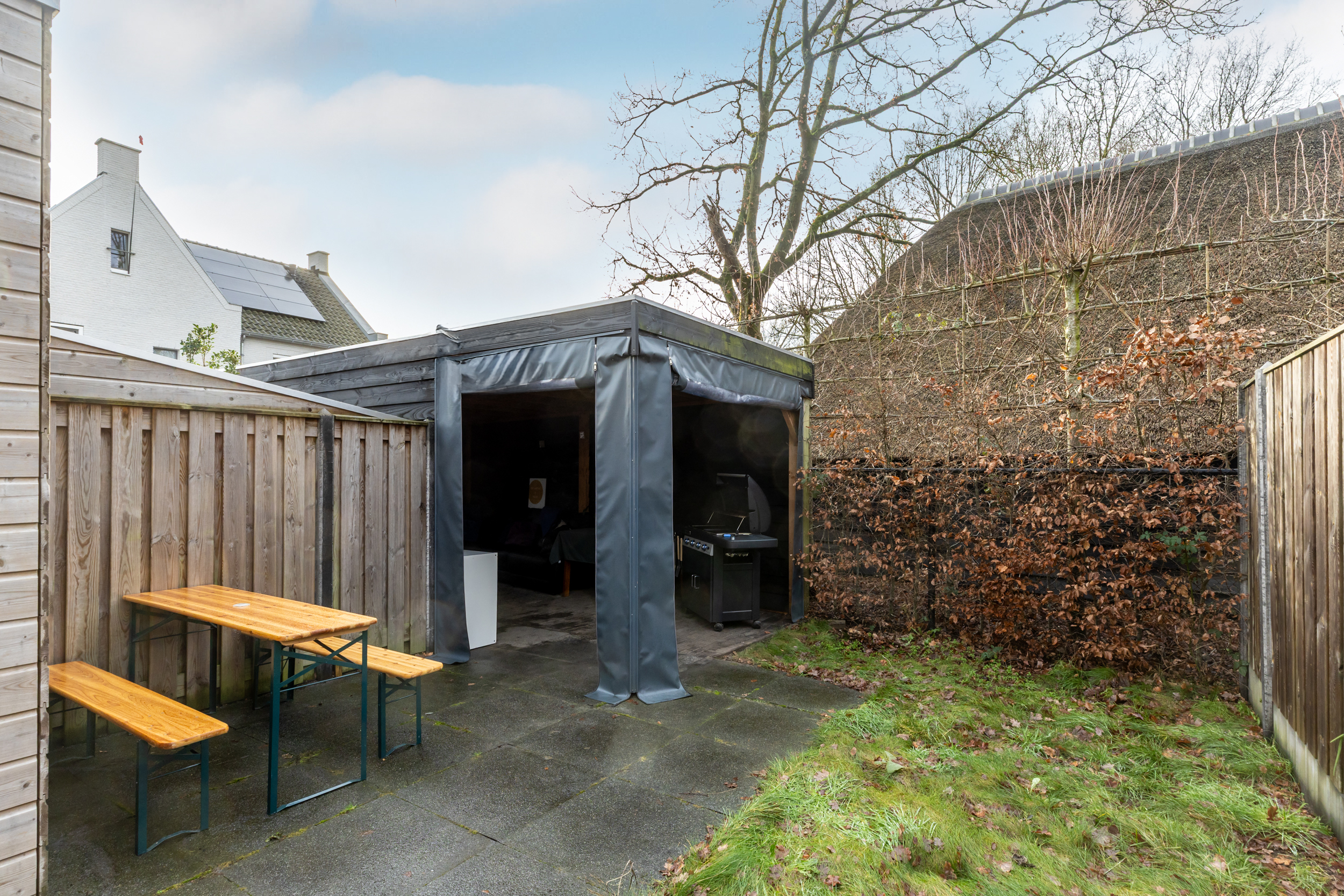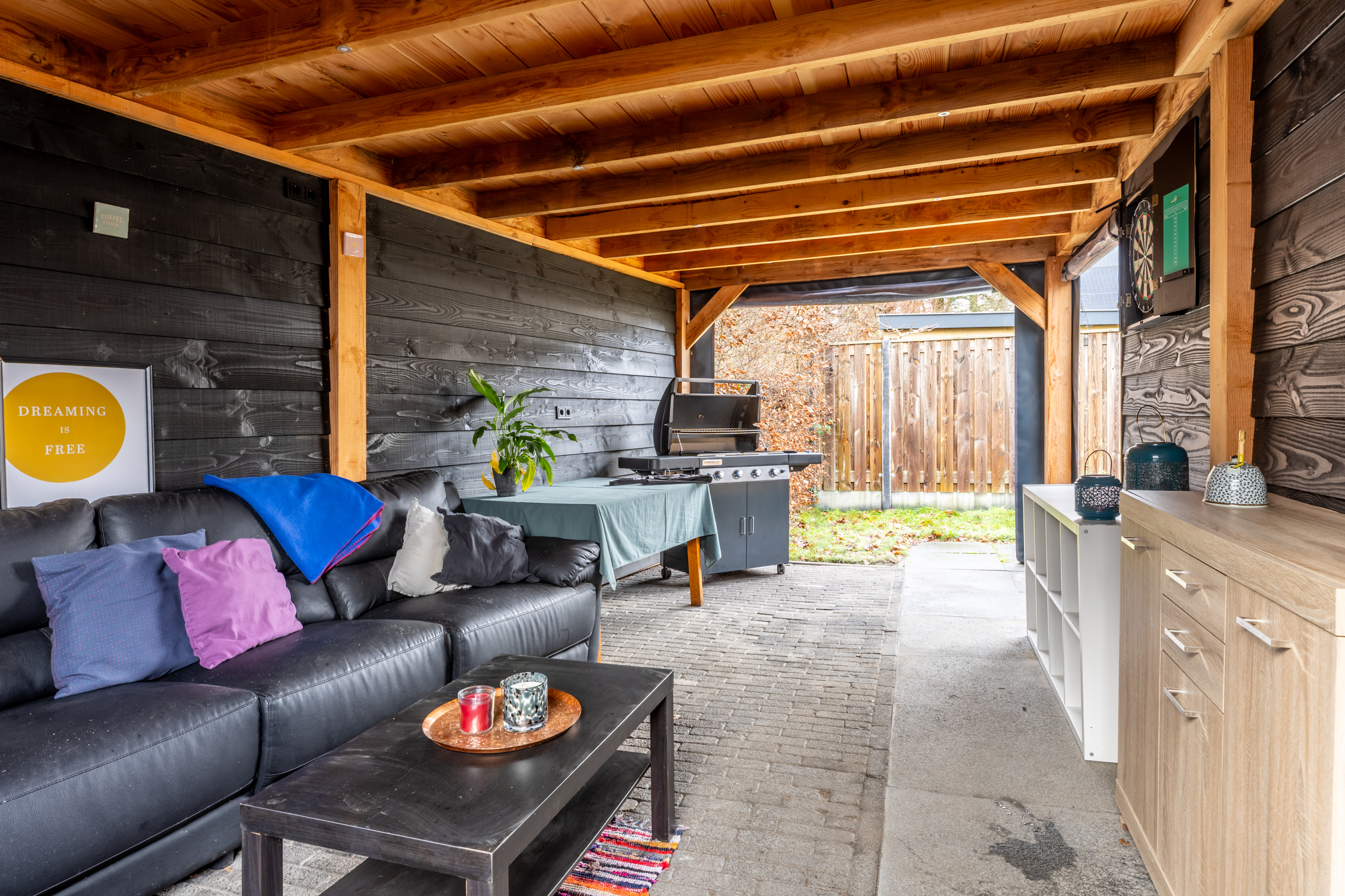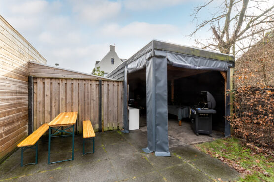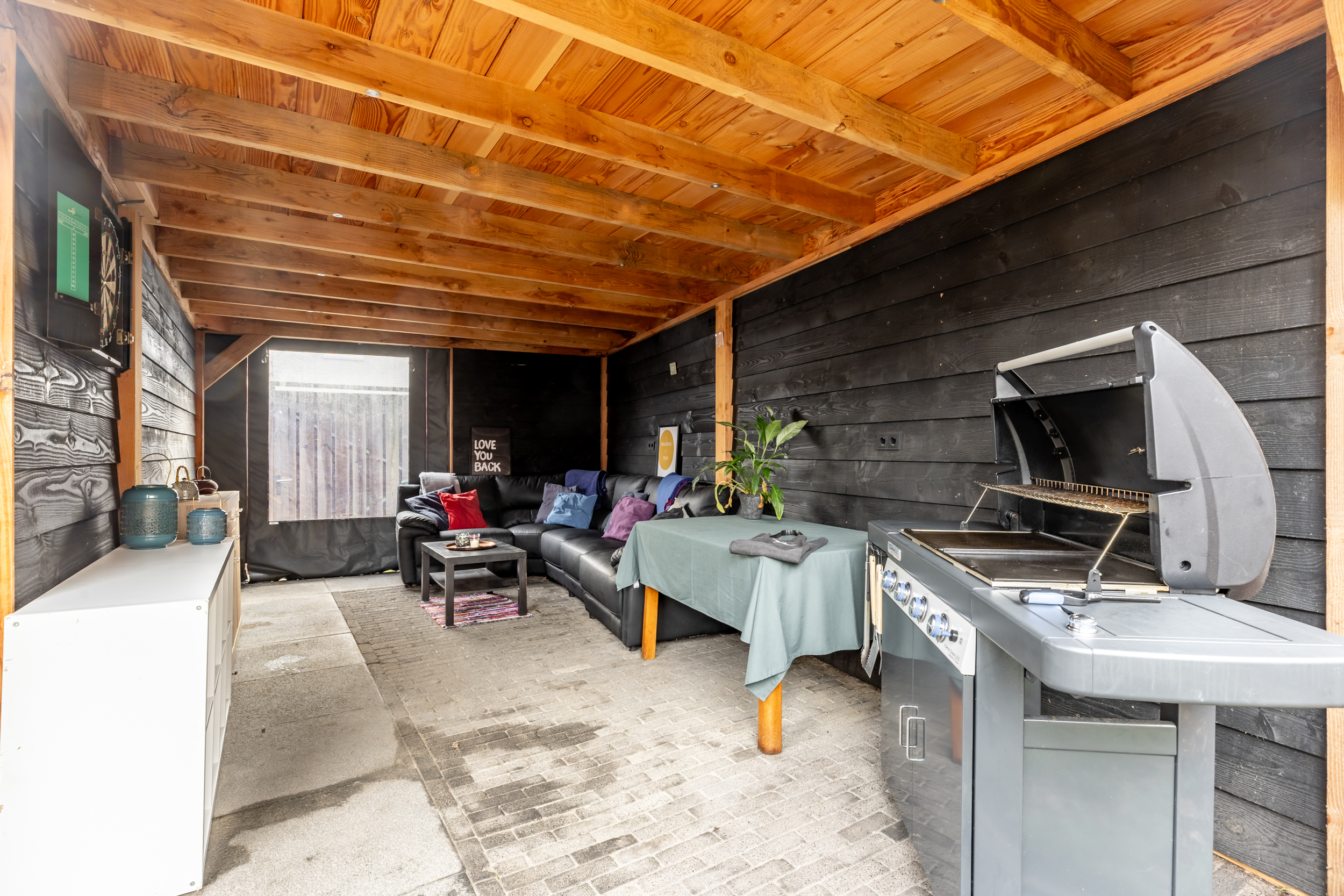 Links achterin de tuin staat een fraaie overkapping van douglas hout. Het perceel heeft namelijk nog een strook grond naar de andere straatzijde. Er is hier een grote poort met een achterom en een plek om een auto te parkeren (geen eigen grond). De overkapping is de perfecte plek om te BBQ-en en/of te chillen met vrienden en familie. Leuk detail is de indirecte ledverlichting die je in verschillende kleuren kunt laten branden. Is het koud of waait het? Geen probleem, je laat de zeilen zakken en je maakt er een beschutte tuinkamer van.