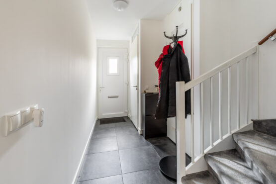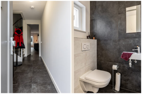We openen de voordeur en stappen in de hal. Ons oogt valt op een fraaie tegelvloer. Deze ligt op de gehele begane grond en is bovendien voorzien van vloerverwarming. Dat is hier tevens de hoofdverwarming. Het huis is namelijk voorzien van een warmtepomp en deze werkt met lage temperatuur verwarming. De vloerverwarming zorgt voor een hoge mate van comfort en ook voor dat er geen radiatoren benodigd zijn op de begane grond. In de hal is aan onze linkerzijde het toilet en de meterkast. We lopen verder, passeren de trap en openen de deur voor ons. Deze deur brengt ons naar de woonkamer.