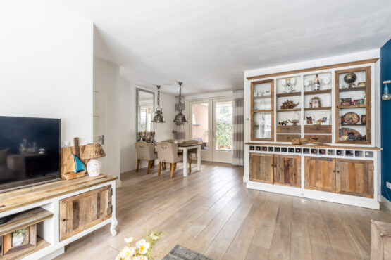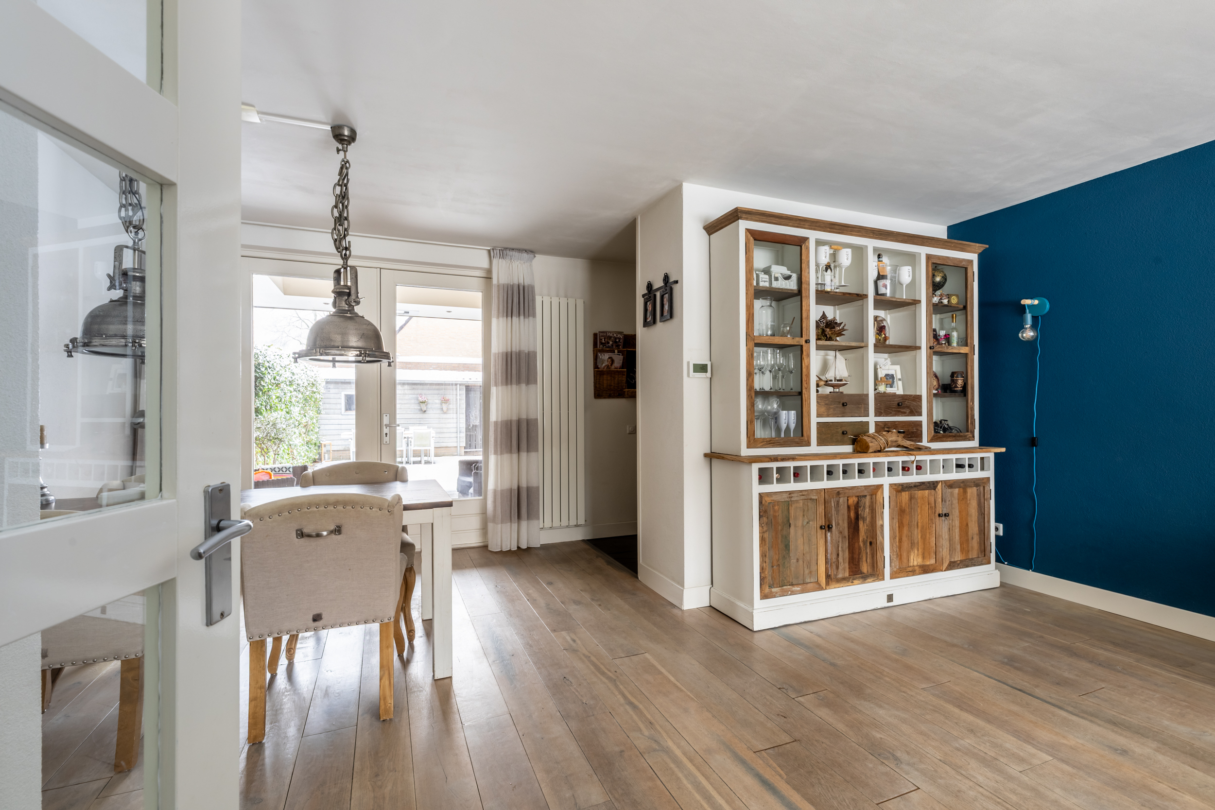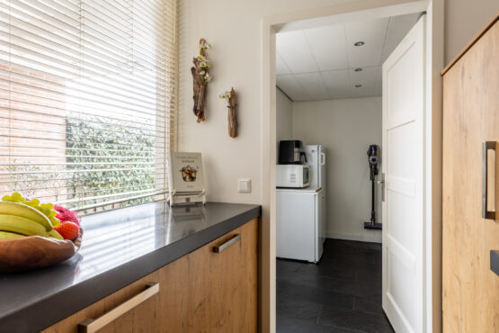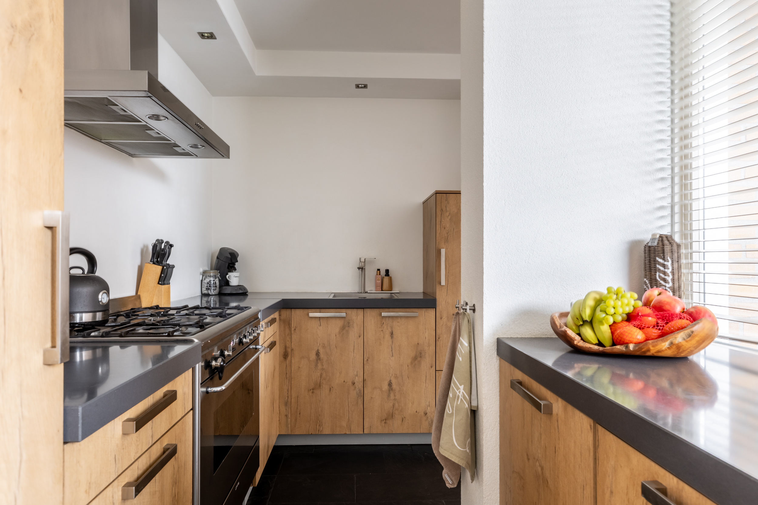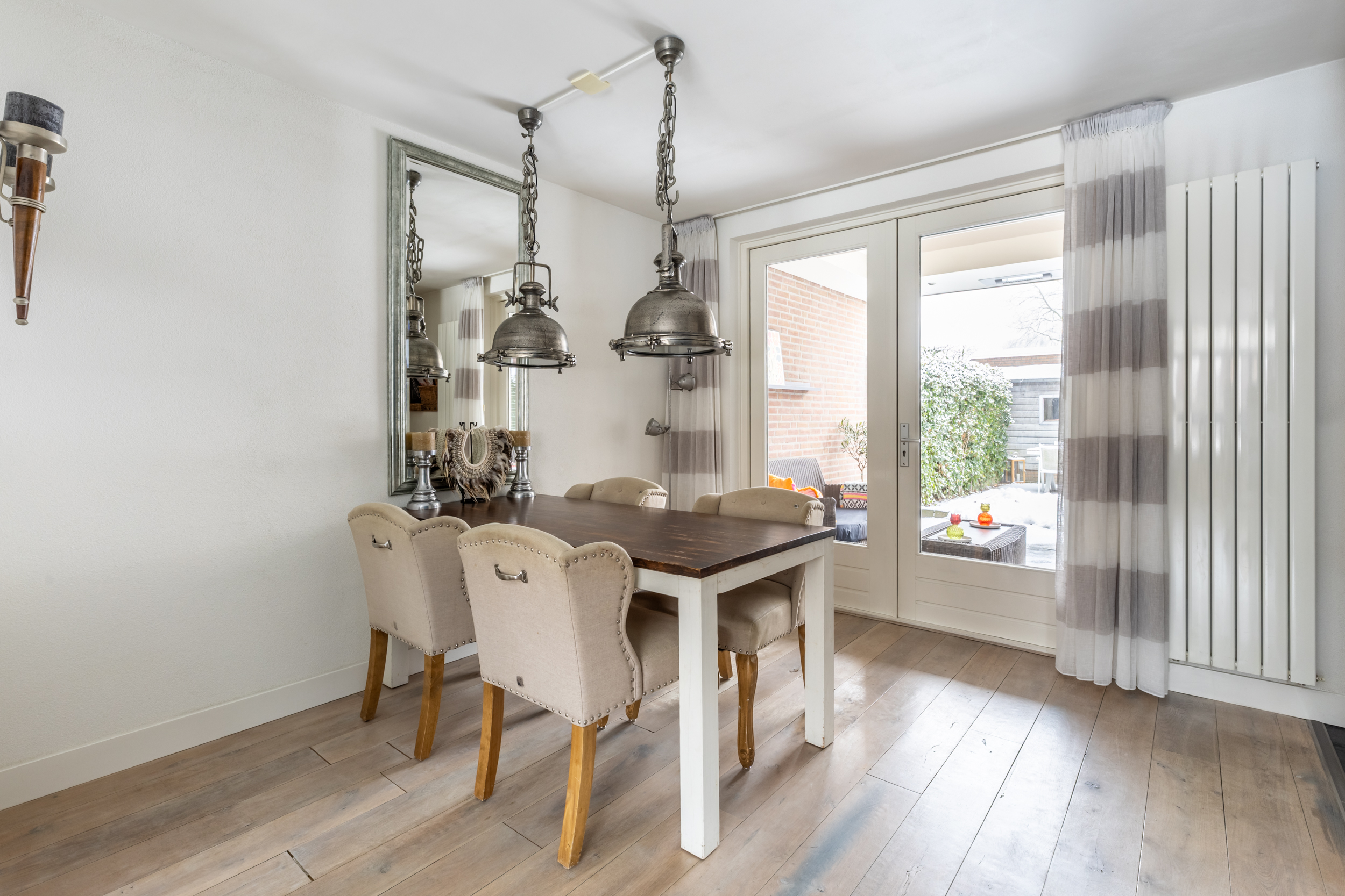 Binnenkomst in de hal. Deze is ruim van opzet en voorzien van een eiken houten vloerafwerking, net als de woonkamer. Links van ons is het toilet en de meterkast. De trap naar de 1e verdieping is gemoderniseerd en ziet er strak uit. We lopen door naar de woonkamer. In de woonkamer valt pas goed de ruimte in huis op. Het huis meet namelijk ruim 130(!)m2 woonoppervlak, wat aanzienlijk is voor een tussenwoning. Door de breedte van het huis, kun je aan de voorzijde een grote zithoek kwijt en tegen de scheidingsmuur met de hal is er plek voor een flinke TV. Als we naar de achterzijde van het huis lopen, passeren we aan onze linkerzijde een trapkast. Superhandig natuurlijk voor proviand, maar ook voor bijvoorbeeld de stofzuiger. De eethoek heeft plek genoeg en er zijn openslaande tuindeuren naar het overdekte terras. Aansluitend is de keuken. Deze moderne keuken in houtlook met een werkblad van composiet heeft veel werk – en kastruimte. Ook aan inbouwapparatuur is er geen gebrek. Zo zien we een vrijstaand fornuis met grote oven, een afzuigkap, vaatwasser en een koelkast. Volgende vertrek is een bijkeuken, daar worden we blij van! Een grote vaste kast voor extra opslag en dan ook nog plek voor bijvoorbeeld een extra koelkast en/of vriezer.