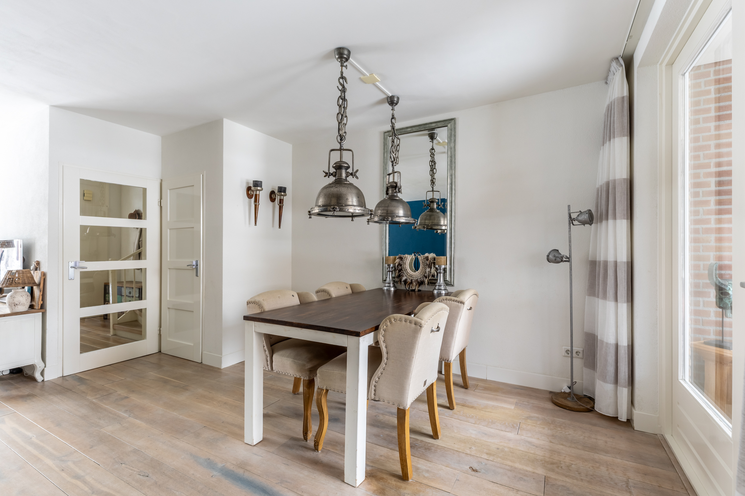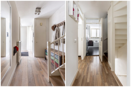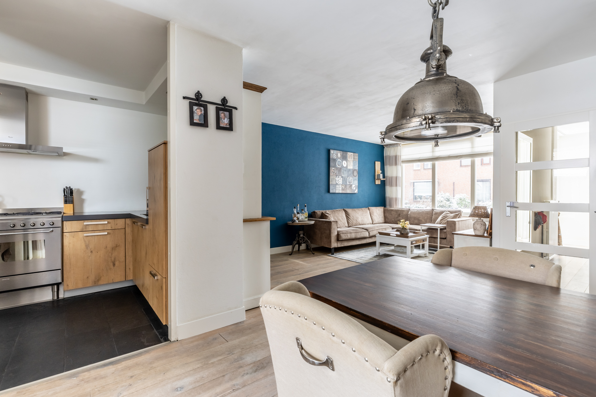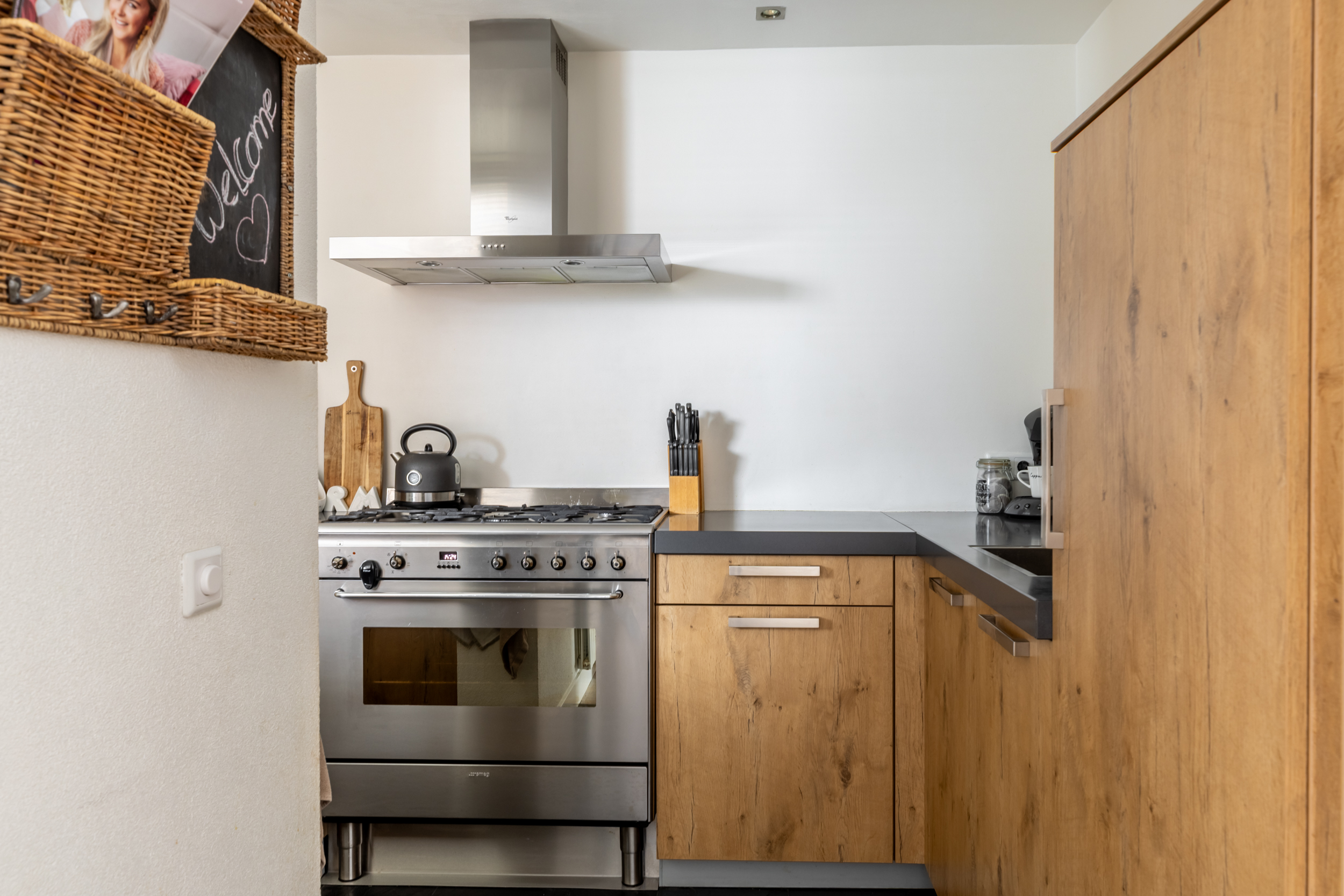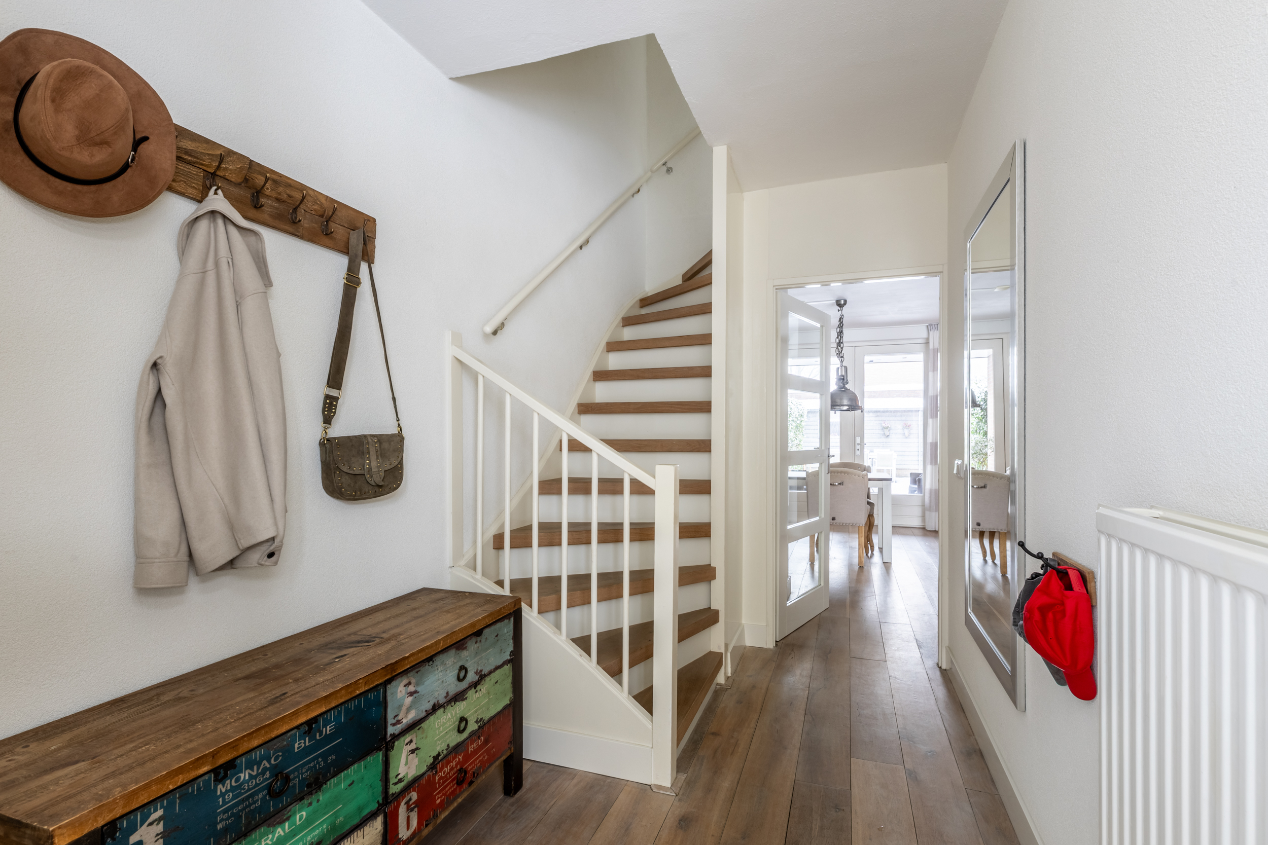 Binnenkomst in de hal. Deze is ruim van opzet en voorzien van een eiken houten vloerafwerking, net als de woonkamer. Links van ons is het toilet en de meterkast. De trap naar de 1e verdieping is gemoderniseerd en ziet er strak uit. We lopen door naar de woonkamer. In de woonkamer valt pas goed de ruimte in huis op. Het huis meet namelijk ruim 130(!)m2 woonoppervlak, wat aanzienlijk is voor een tussenwoning. Door de breedte van het huis, kun je aan de voorzijde een grote zithoek kwijt en tegen de scheidingsmuur met de hal is er plek voor een flinke TV. Als we naar de achterzijde van het huis lopen, passeren we aan onze linkerzijde een trapkast. Superhandig natuurlijk voor proviand, maar ook voor bijvoorbeeld de stofzuiger. De eethoek heeft plek genoeg en er zijn openslaande tuindeuren naar het overdekte terras. Aansluitend is de keuken. Deze moderne keuken in houtlook met een werkblad van composiet heeft veel werk – en kastruimte. Ook aan inbouwapparatuur is er geen gebrek. Zo zien we een vrijstaand fornuis met grote oven, een afzuigkap, vaatwasser en een koelkast. Volgende vertrek is een bijkeuken, daar worden we blij van! Een grote vaste kast voor extra opslag en dan ook nog plek voor bijvoorbeeld een extra koelkast en/of vriezer.