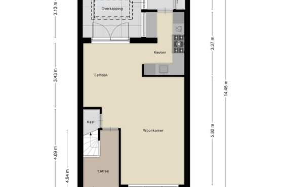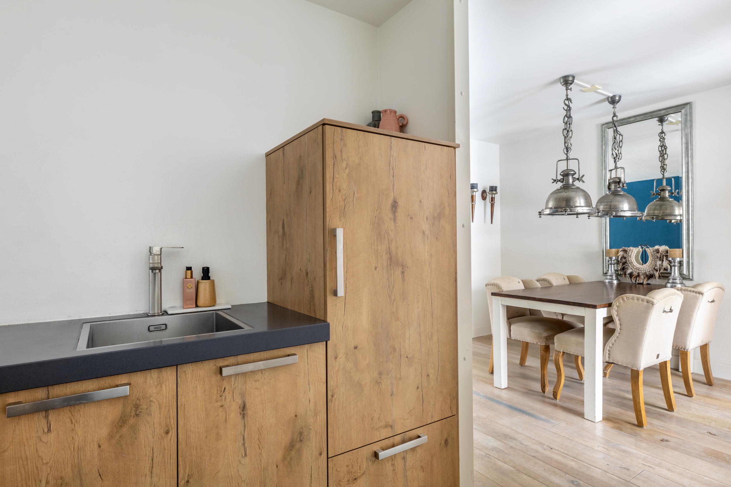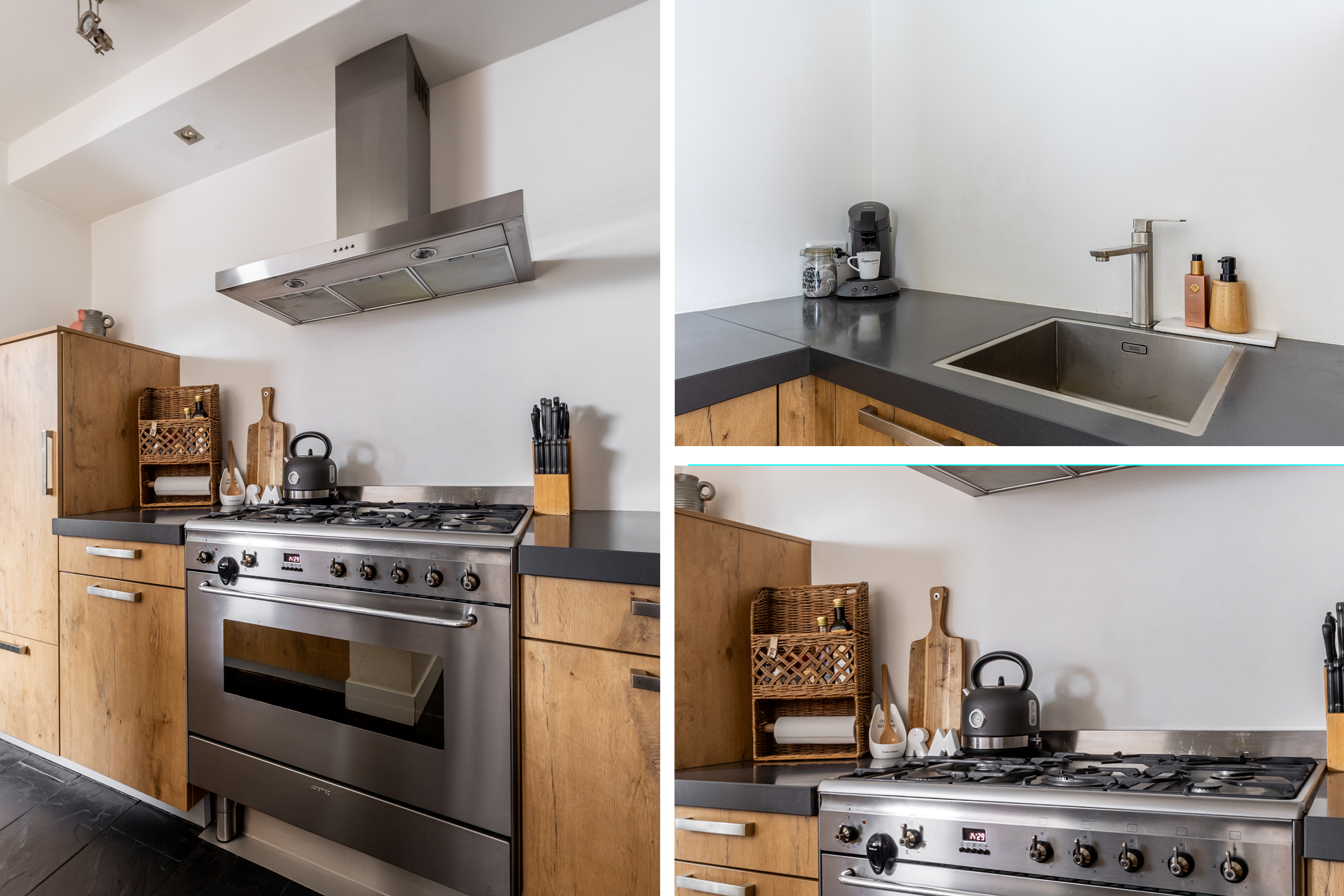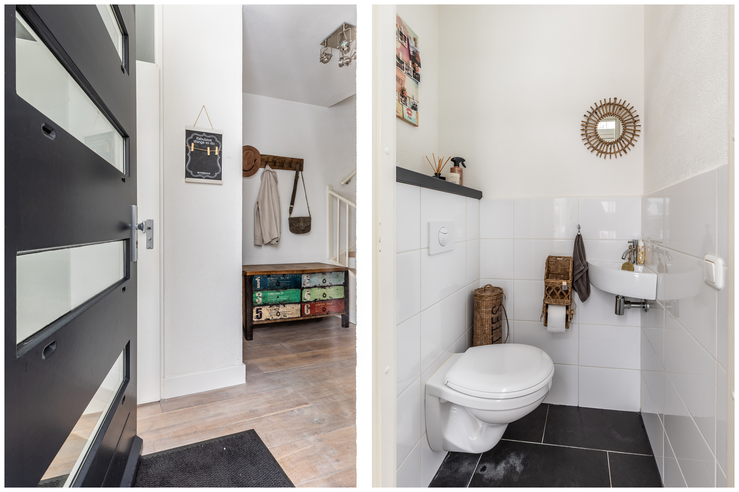 Binnenkomst in de hal. Deze is ruim van opzet en voorzien van een eiken houten vloerafwerking, net als de woonkamer. Links van ons is het toilet en de meterkast. De trap naar de 1e verdieping is gemoderniseerd en ziet er strak uit. We lopen door naar de woonkamer. In de woonkamer valt pas goed de ruimte in huis op. Het huis meet namelijk ruim 130(!)m2 woonoppervlak, wat aanzienlijk is voor een tussenwoning. Door de breedte van het huis, kun je aan de voorzijde een grote zithoek kwijt en tegen de scheidingsmuur met de hal is er plek voor een flinke TV. Als we naar de achterzijde van het huis lopen, passeren we aan onze linkerzijde een trapkast. Superhandig natuurlijk voor proviand, maar ook voor bijvoorbeeld de stofzuiger. De eethoek heeft plek genoeg en er zijn openslaande tuindeuren naar het overdekte terras. Aansluitend is de keuken. Deze moderne keuken in houtlook met een werkblad van composiet heeft veel werk – en kastruimte. Ook aan inbouwapparatuur is er geen gebrek. Zo zien we een vrijstaand fornuis met grote oven, een afzuigkap, vaatwasser en een koelkast. Volgende vertrek is een bijkeuken, daar worden we blij van! Een grote vaste kast voor extra opslag en dan ook nog plek voor bijvoorbeeld een extra koelkast en/of vriezer.