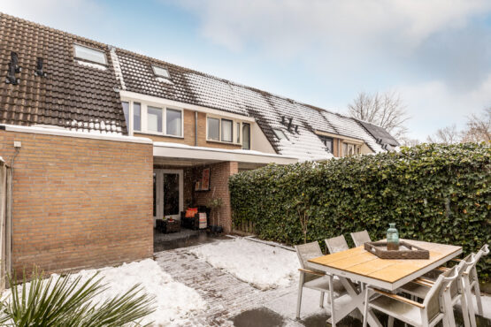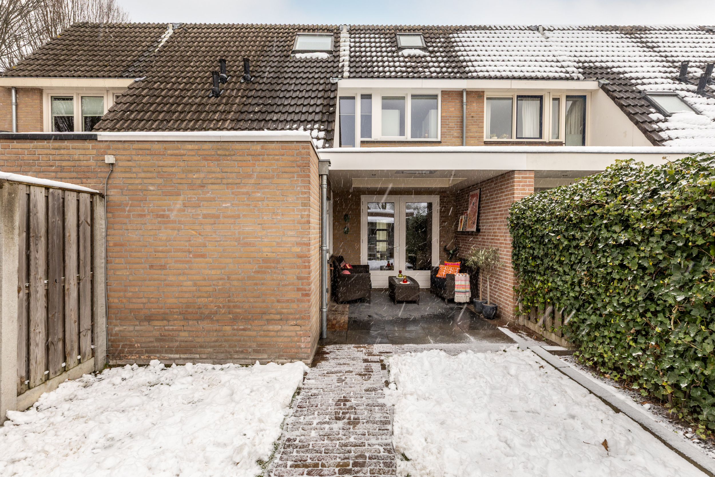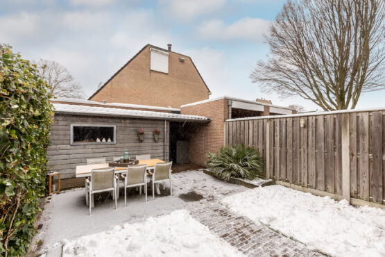 Ook de “op het zuiden gelegen en dus zonnige”- achtertuin ziet er verzorgd uit, met sierbestrating, gazon en plantvakken. De overkapping direct aan huis is top, zodat je hier heerlijk overdekt van de tuin kan genieten. In het dak zijn spots verwerkt en de grote lichtkoepel zorgt voor voldoende daglicht. Achterin de tuin staat een grote houten fietsenberging, ook is hier een achterom naar een brandgang.