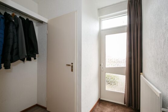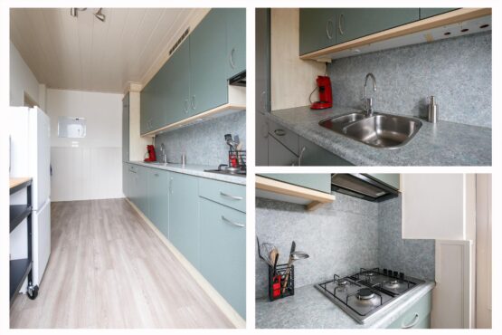 De dichte keuken is voorzien van een keukenblok met onder – en bovenkasten en diverse inbouwapparatuur als een vaatwasser, koelkast, vriezer en een gaskookplaat. Ook hier is een achterdeur naar de achtertuin.