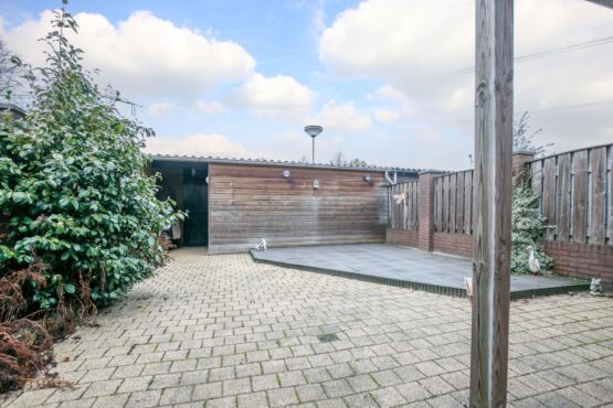 NU we binnen hebben gezien, gaan we graag nog buiten kijken. De achtertuin is onderhoudsarm aangelegd met veel bestrating en groene aanplant aan de zijkanten. Aan het huis is een overkapping gemaakt. Achterin de tuin staat een berging.