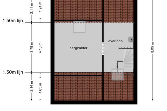 Met een vaste trap komen we aan op de 2e verdieping. Deze is ingedeeld met een voorzolder en een extra kamer. TIP: doordat er hier net te weinig daglicht toetreding is, telt deze woonlaag nu als “overige inpandige ruimte” Door een groter dakraam hier te plaatsen danwel een dakkapel, neemt het “woonoppervlak” met ca. 23m2 toe en verander je de extra kamer in een slaapkamer! De HR-combiketel hangt op de voorzolder en is een Remeha Quinta uit 2005.