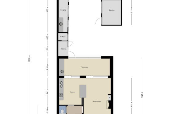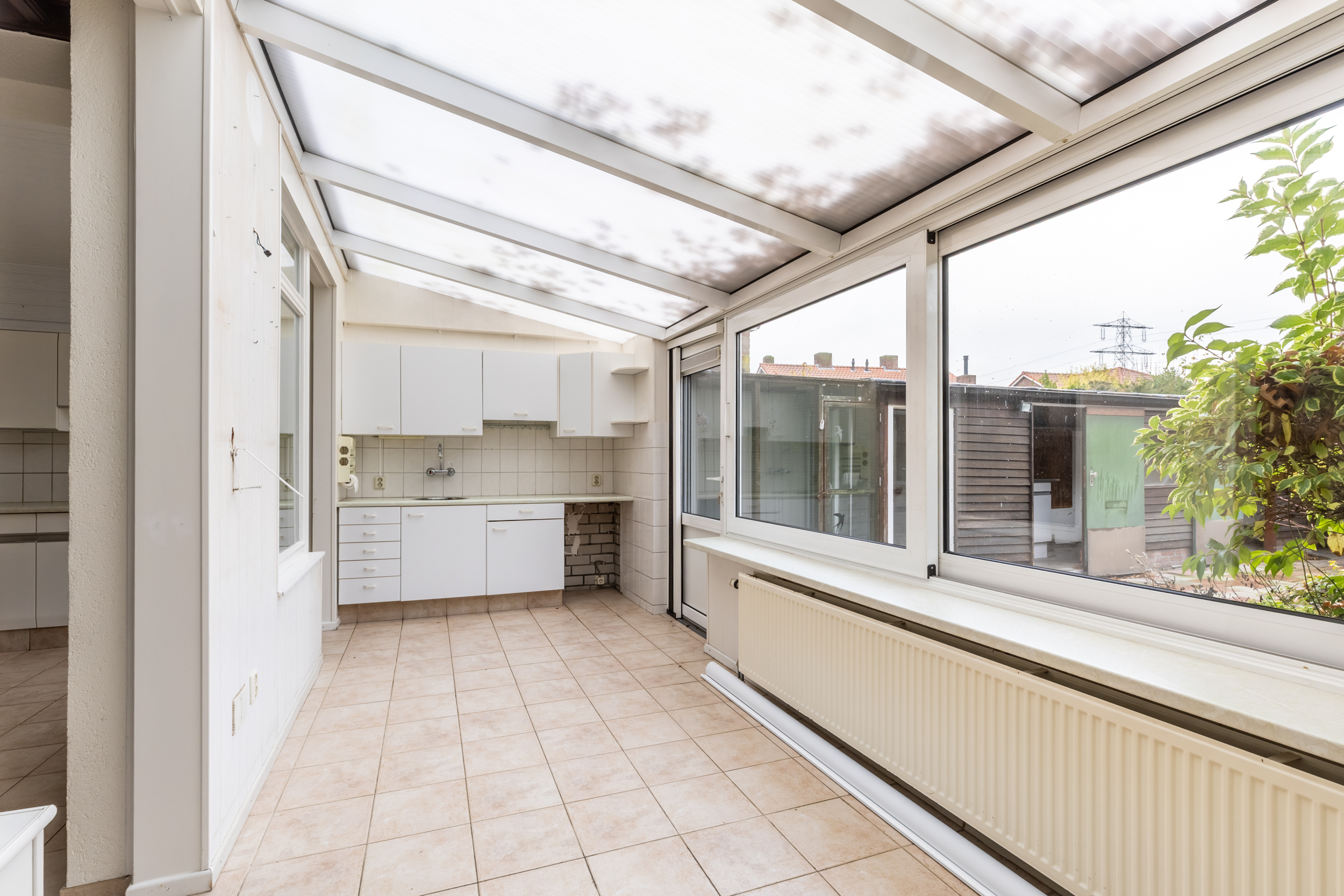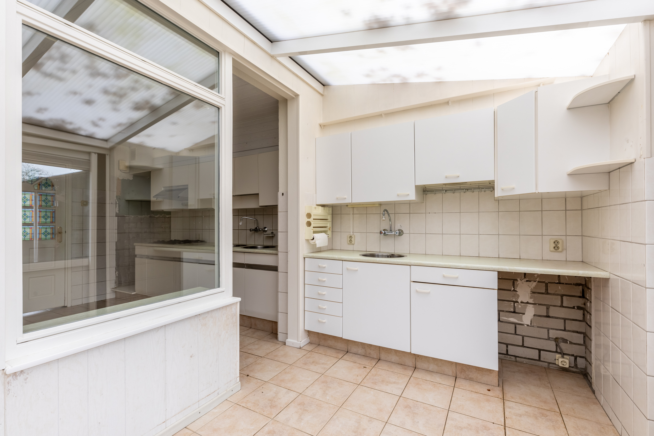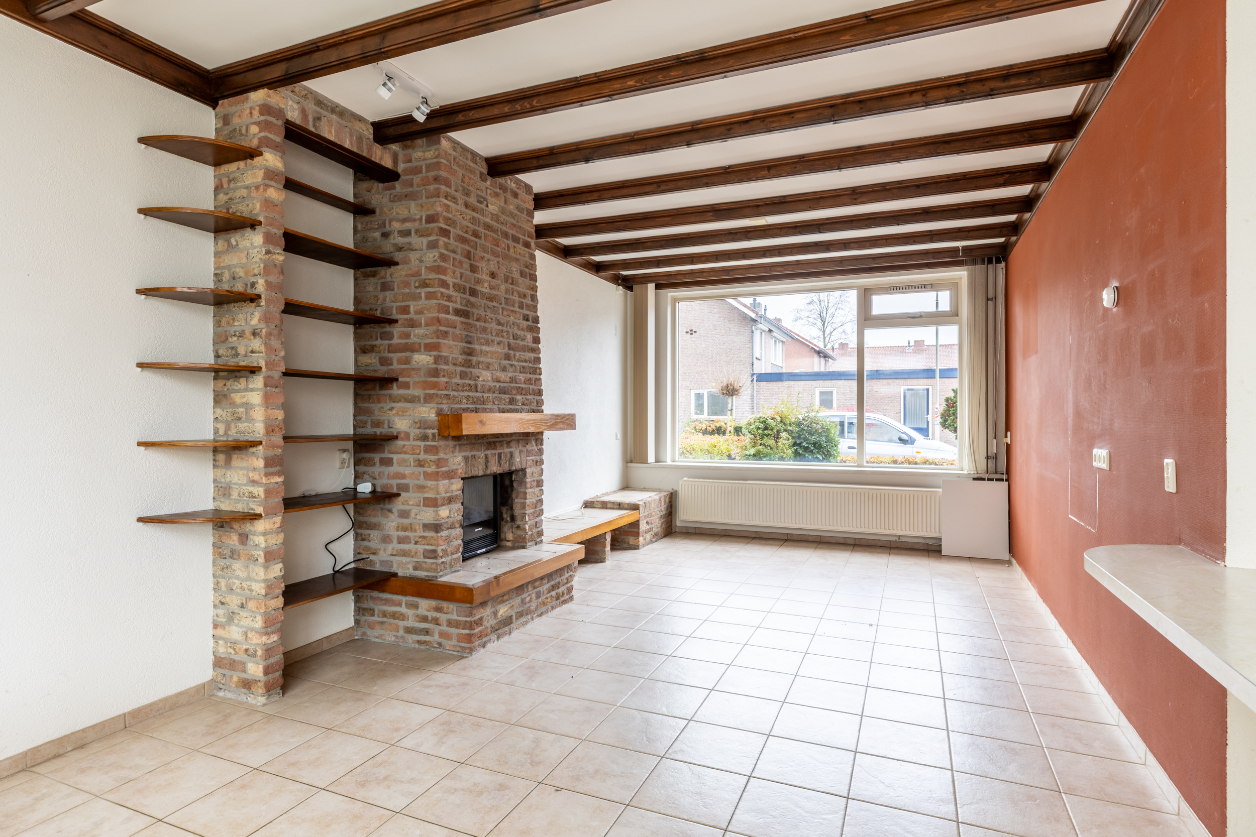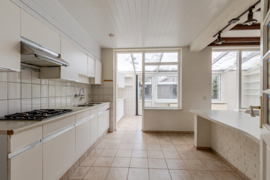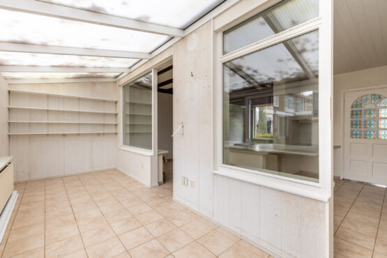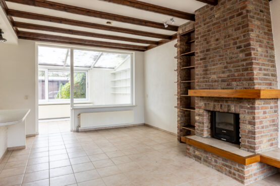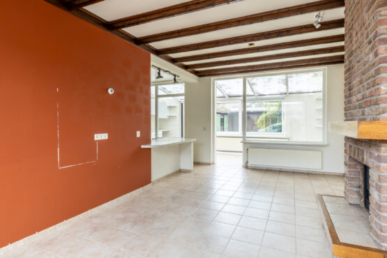 De woonkamer heeft een mooi formaat en een grote gemetselde schouw met plateau en schappen. Typisch uit die tijd. Vroeger was dit een open haard, nu is er een elektrisch inzetkacheltje geplaatst. Op de vloer zien we dezelfde tegelvloer die op de hele begane grond ligt en als we omhoog kijken zien we een balkenplafond. De grote ramen zorgen voor een fijne lichtinval. De woning is in het verleden over de volle breedte uitgebouwd met een tuinkamer. Deze is toegankelijk vanuit de woonkamer en keuken. De ruimte is een mooie aanvulling op het woonoppervlak en het woongenot. Voor de invulling van deze ruimte zijn er wat ons betreft vele mogelijkheden. Een speelkamer, werkplek, eethoek, chillplek…. Vul het zelf maar in, daar kom je vast wel uit. De aanbouw heeft aan de zijde van de keuken een wand met extra keukenkastjes en een spoelbak, ook is er een groot schuifraam en is er een loopdeur naar de achtertuin.