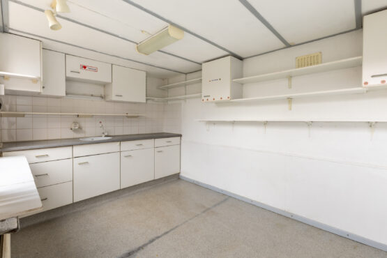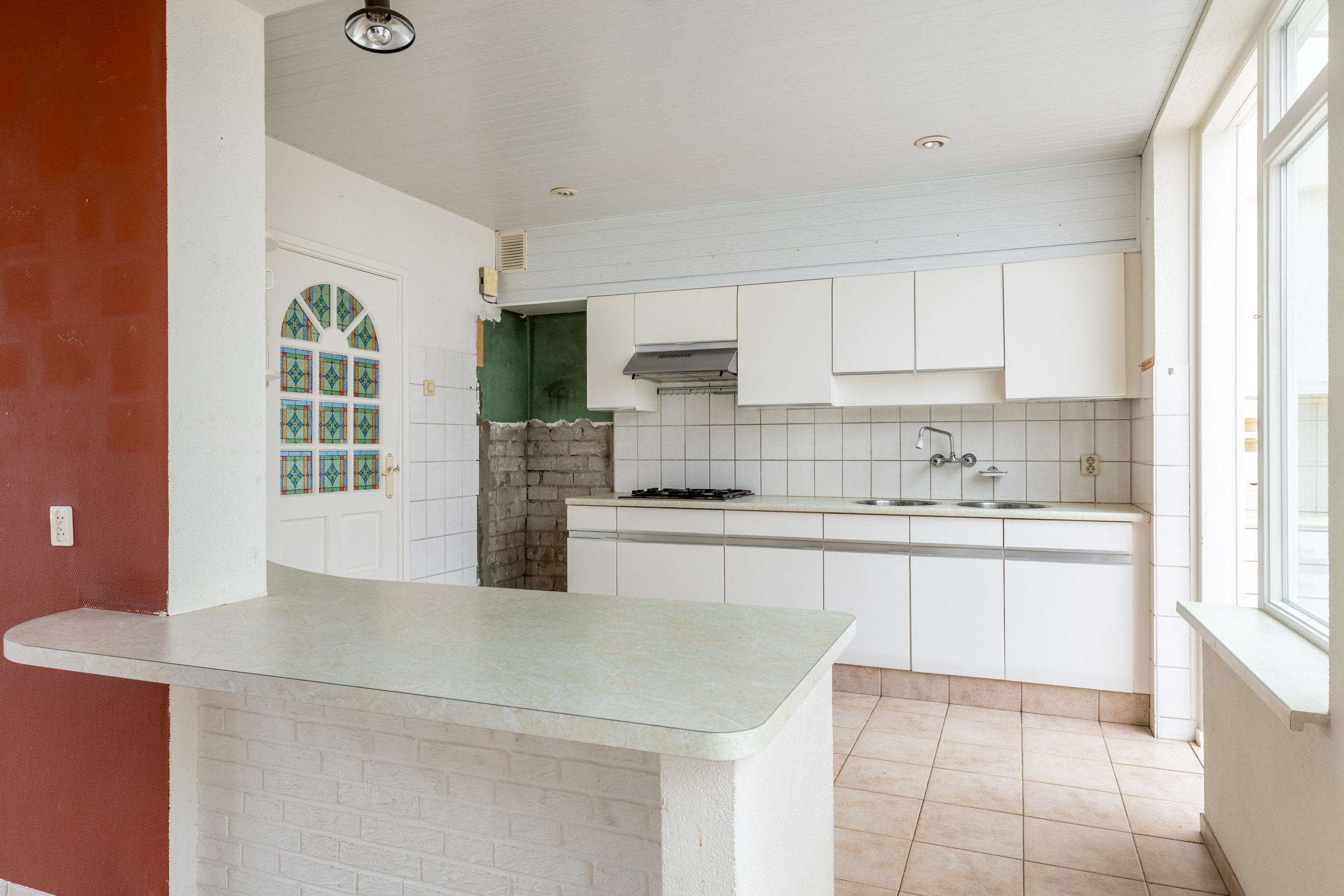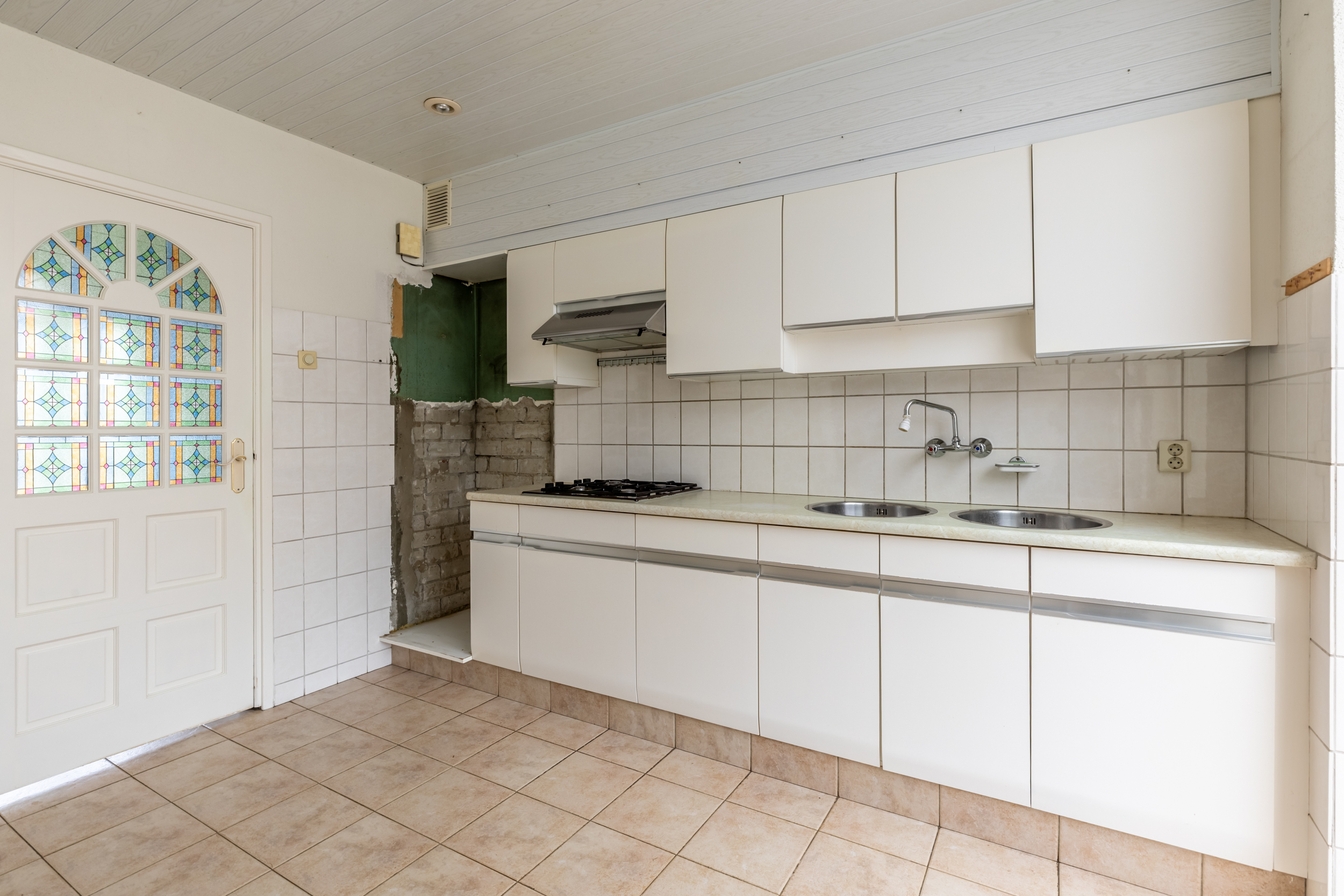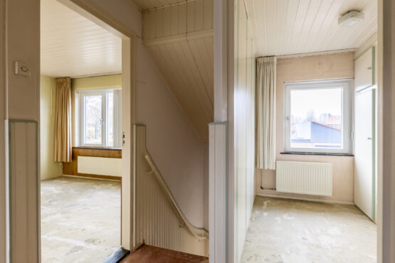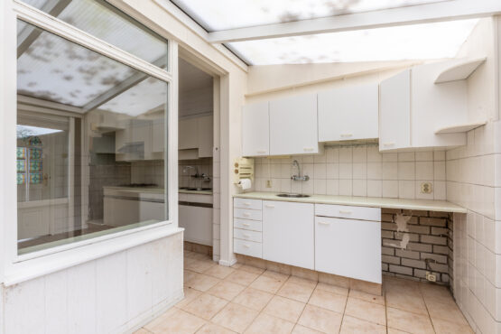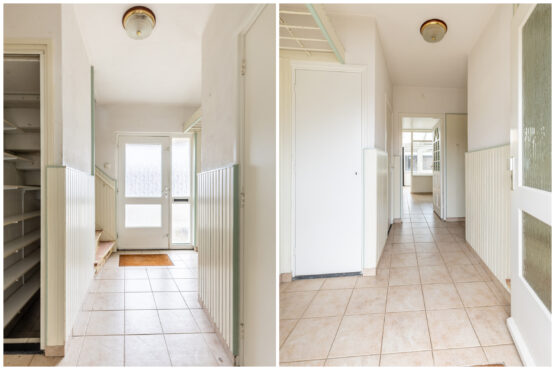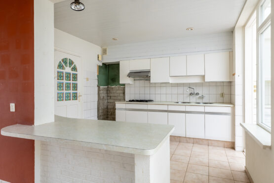 We lopen via het paadje naar de voordeur en betreden de hal. We wanen ons terug in de tijd bij de aanblik van de tegelvloer en de lambrisering tegen de wanden. Oké, er moet dus het een en ander gebeuren, maar dat past ons prima. Dan kunnen we het meteen onze eigen stijl meegeven! Links van ons is een garderobenis, de meterkast en het toilet. Rechts van ons is de trapopgang met hieronder een ruime verdiepte kelderkast. Zo te zien was de trap voorzien van vloerbedekking, maar die is alvast verwijderd. Mooi, dat was anders een flinke klus! Voor ons is een deur naar de keuken. De keuken is ruim, licht en eenvoudig. De bestaande koelkast is reeds verwijderd. Er is een groot aanrechtblad met boven- en onderkastjes en een ingebouwde gaskookplaat, afzuigkap en een dubbele spoelbak. Leuk detail is het barretje tussen de keuken en woonkamer. Feitelijk is het een eettafel. We weten nu al dat we een nieuwe keuken gaan plaatsen, maar het geheel geeft wel een goed idee wat te doen met de indeling en de ruimte. Sowieso al fijn dat de keuken in open verbinding met de woonkamer staat, zodat we niet eerst nog een tussenmuur moeten verwijderen.