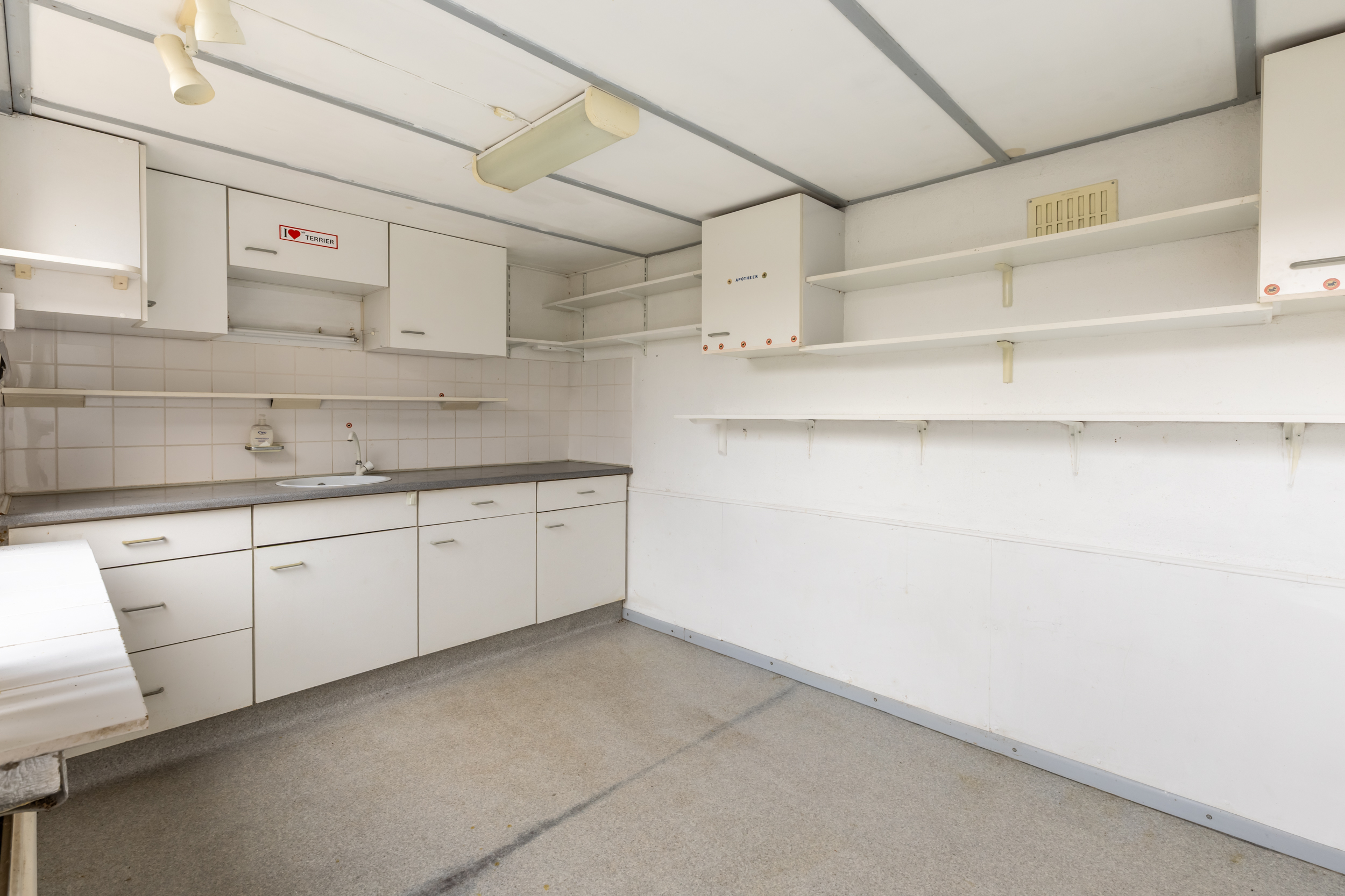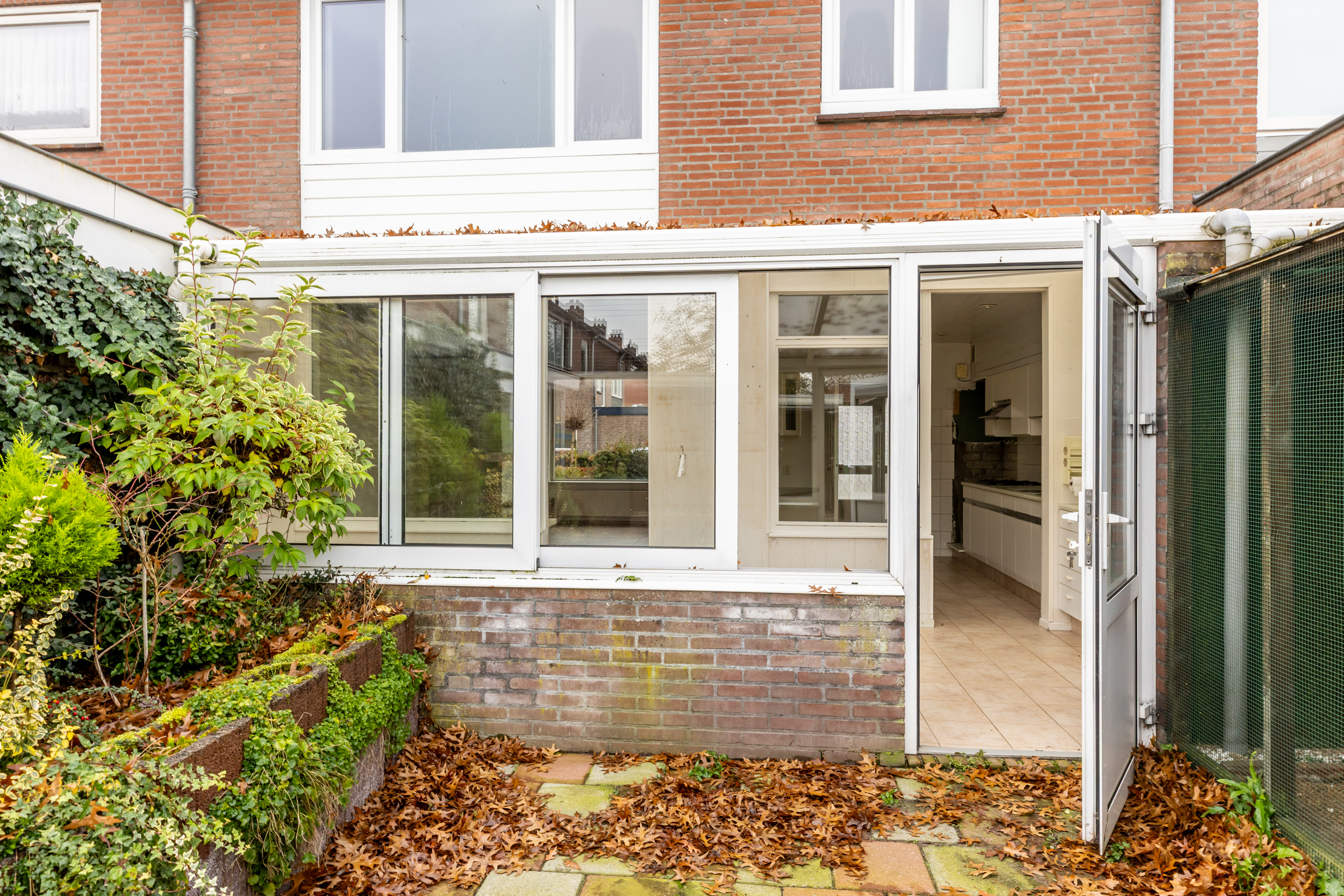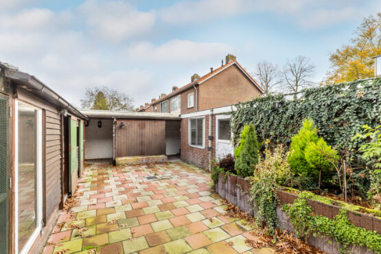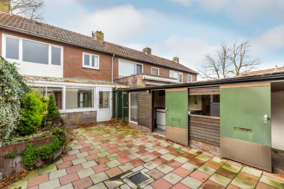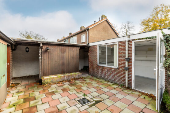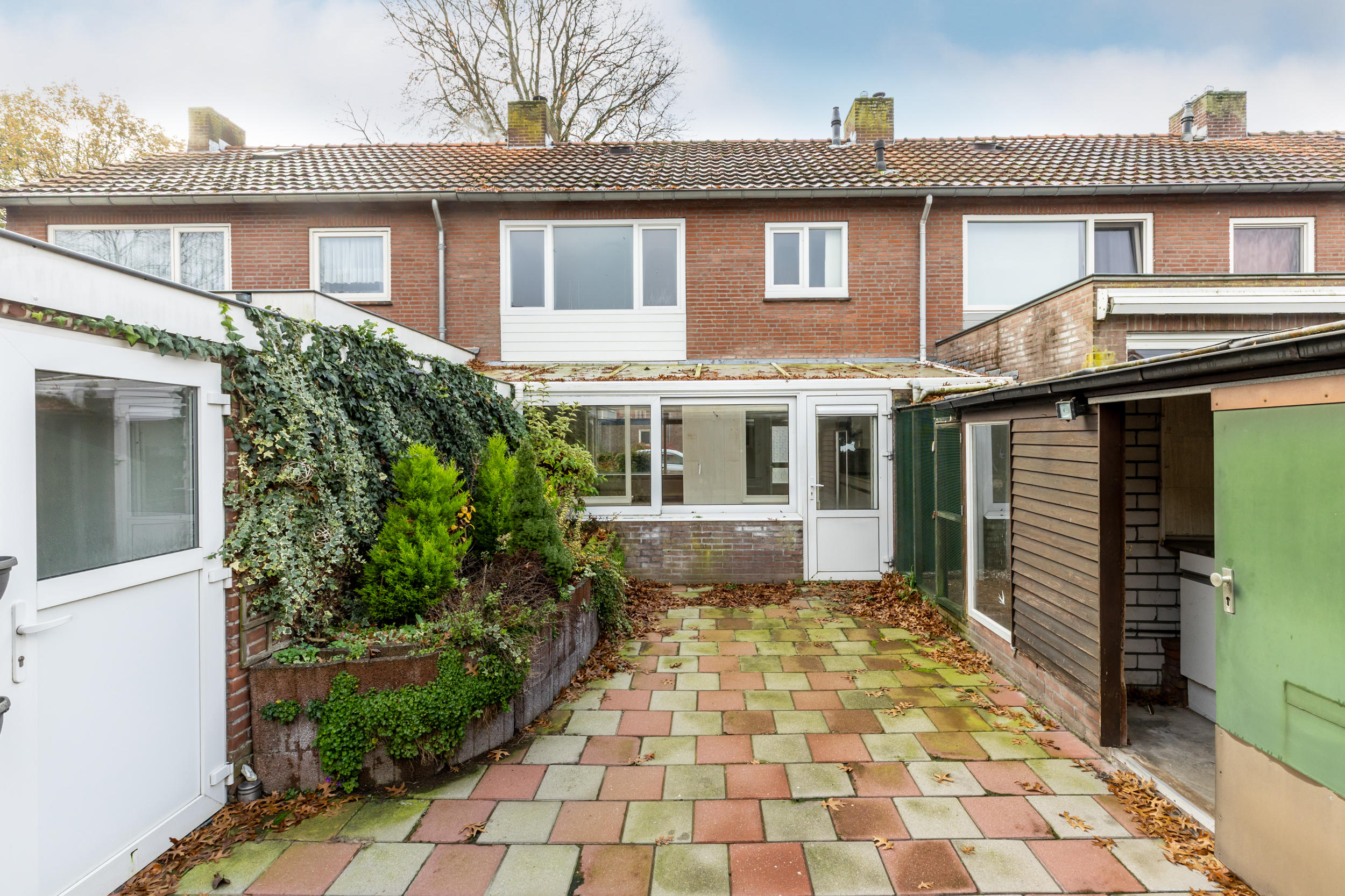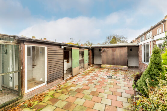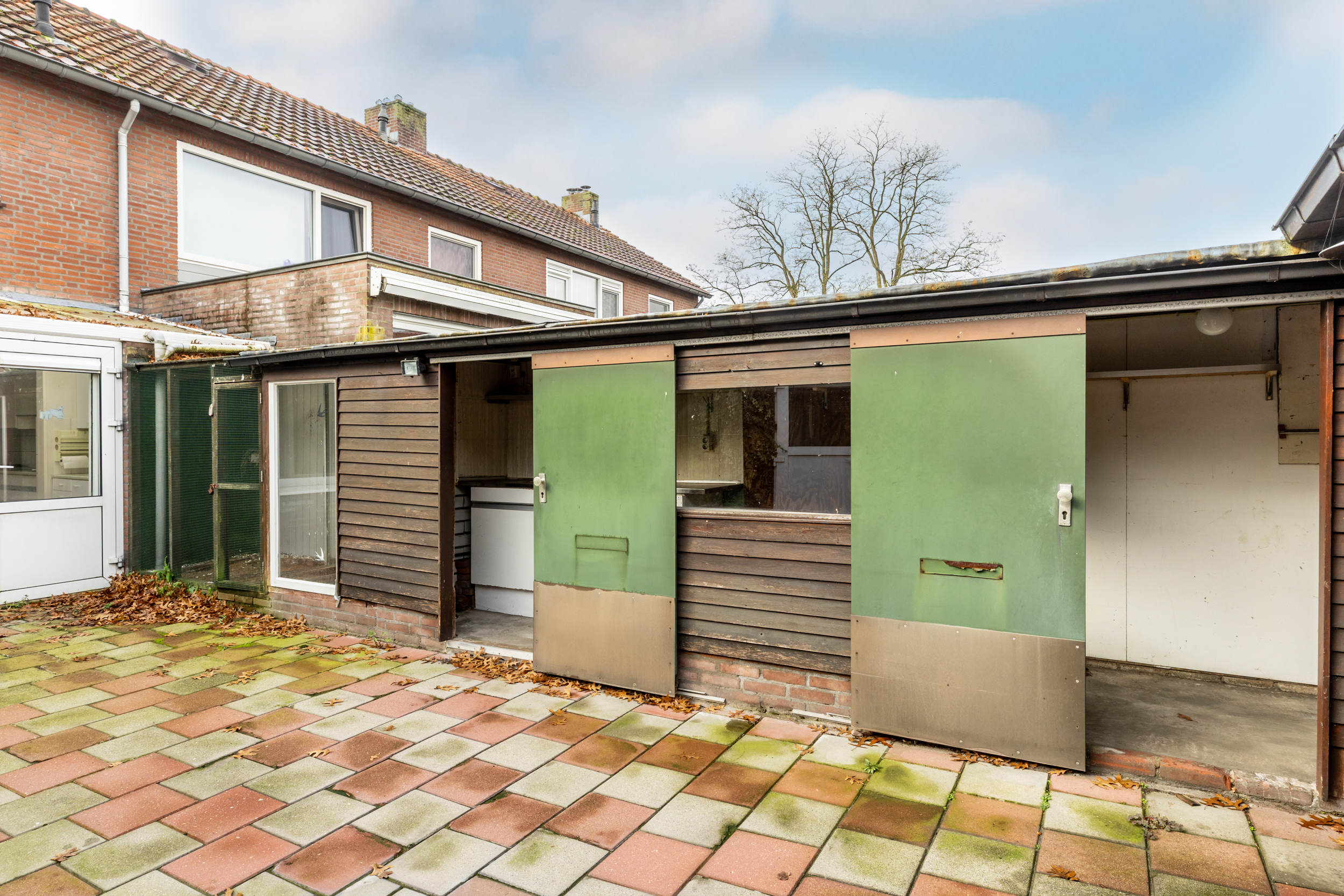 De achtertuin is onderhoudsarm aangelegd met bestrating en een plantenbak. Er staan diverse opstallen zoals een volière, een berging en een overkapping. Onder de overkapping is een poort naar een brandgang. Rechts op het perceel staat nog een bijgebouw, die feitelijk als een bijkeuken in gebruik is, maar ook voor vele doeleinden geschikt te maken is. Ook hier is een keukenblok geplaatst en aan de wanden hangen kastjes en schappen. Aan de wand hangt een radiator.